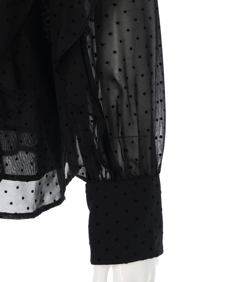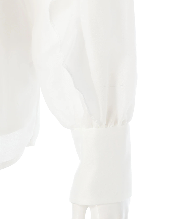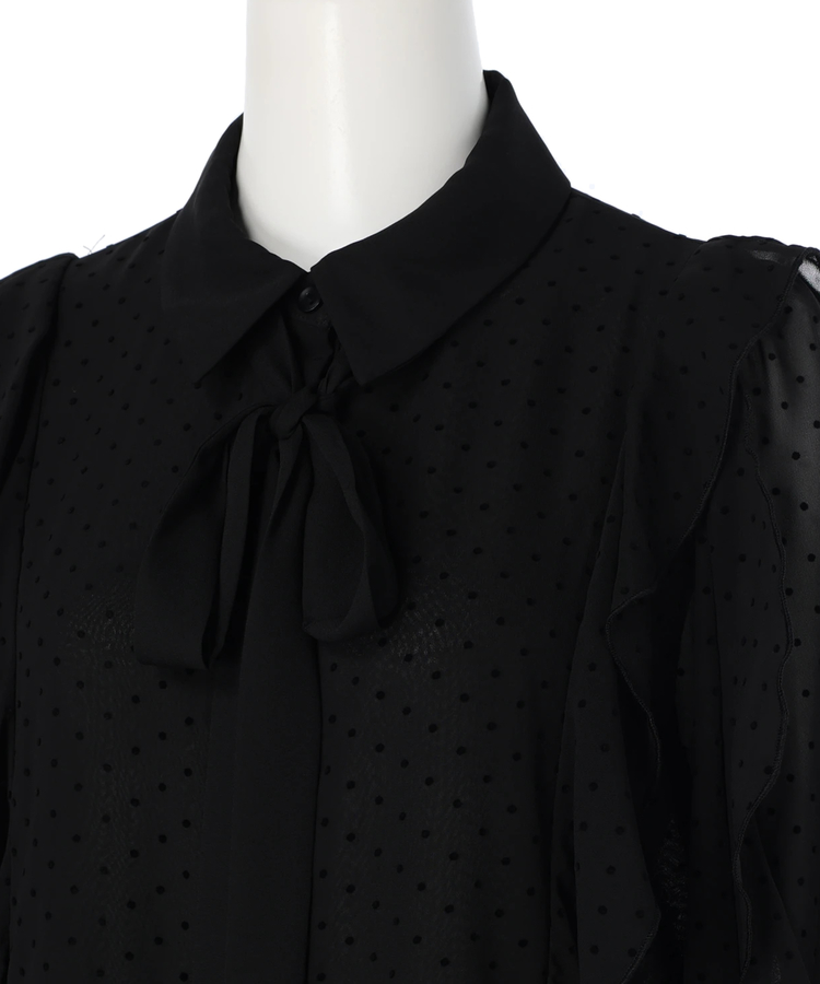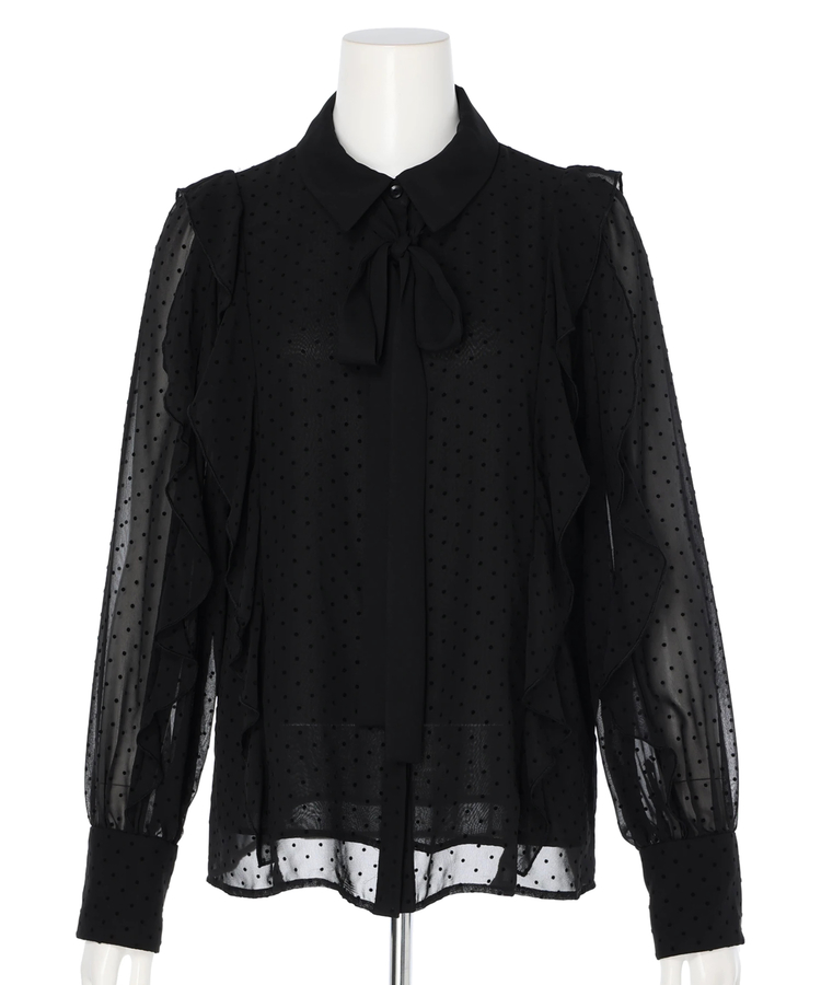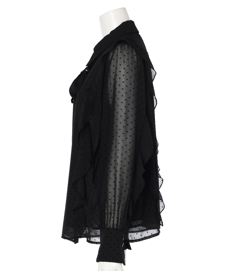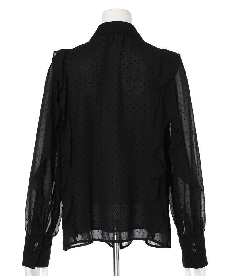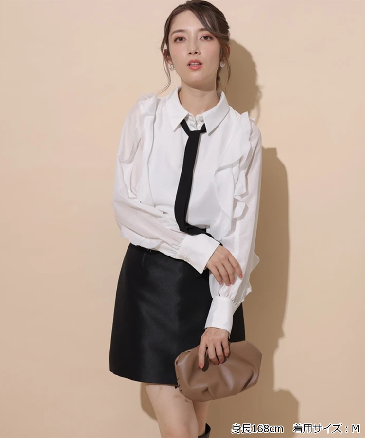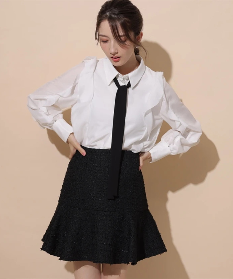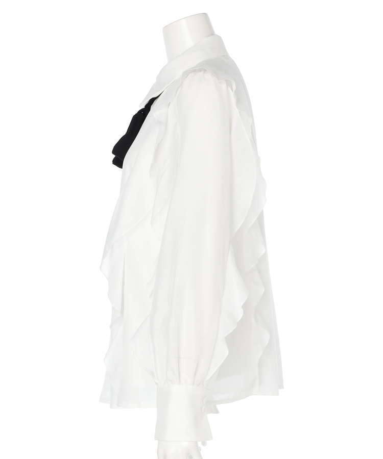 波打つフリルが甘さをプラスするシャツ襟ブラウス。