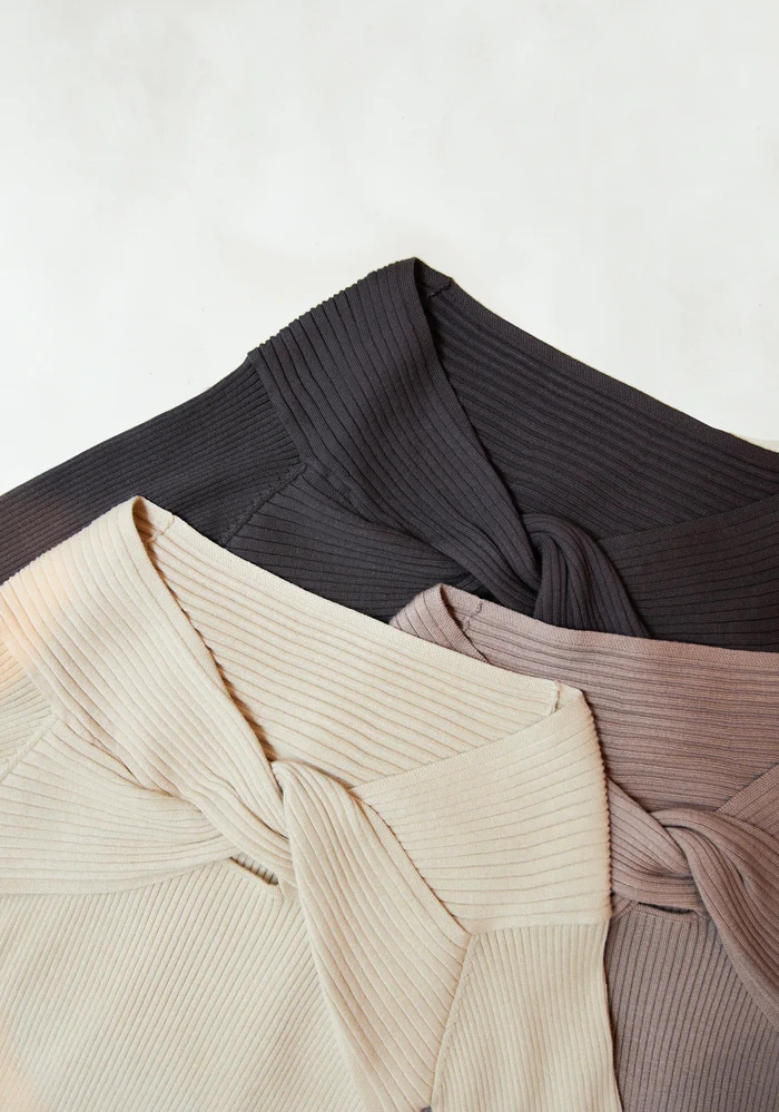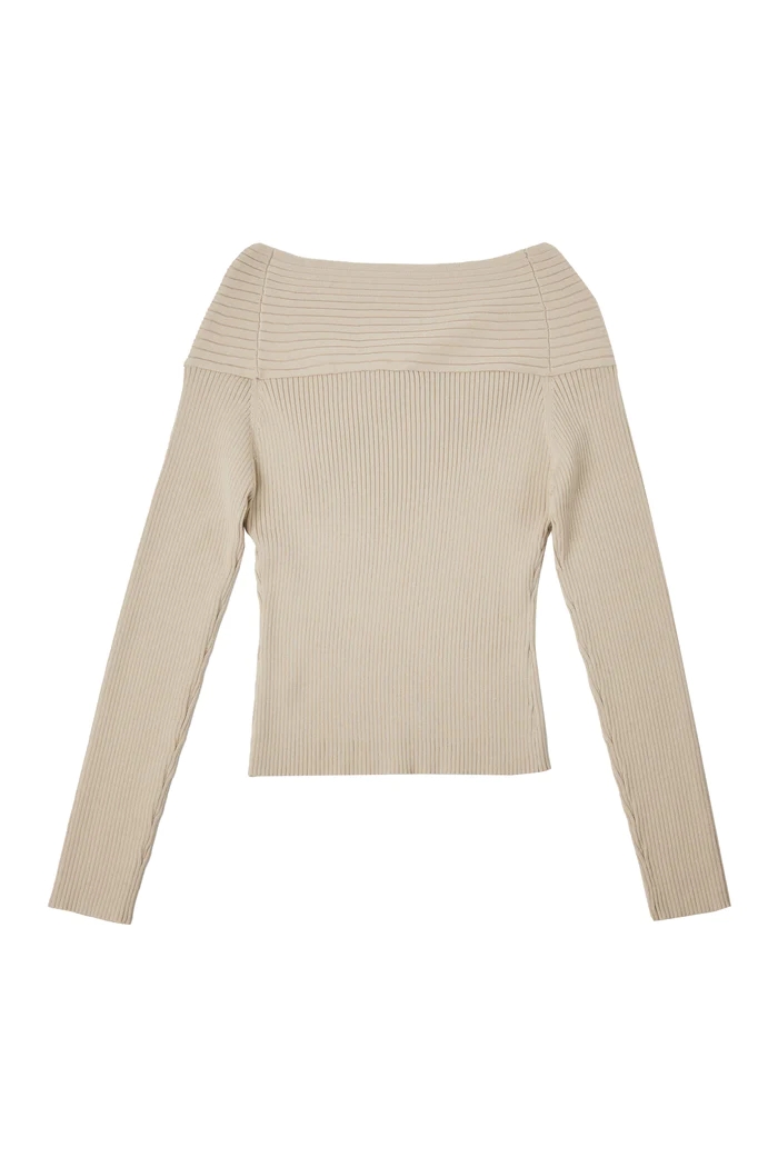 柔らかで膨らみがありしっとり編み立てたリブは、あえて身頃と襟元のパーツの編地を変えることで表情をお楽しみいただけます。