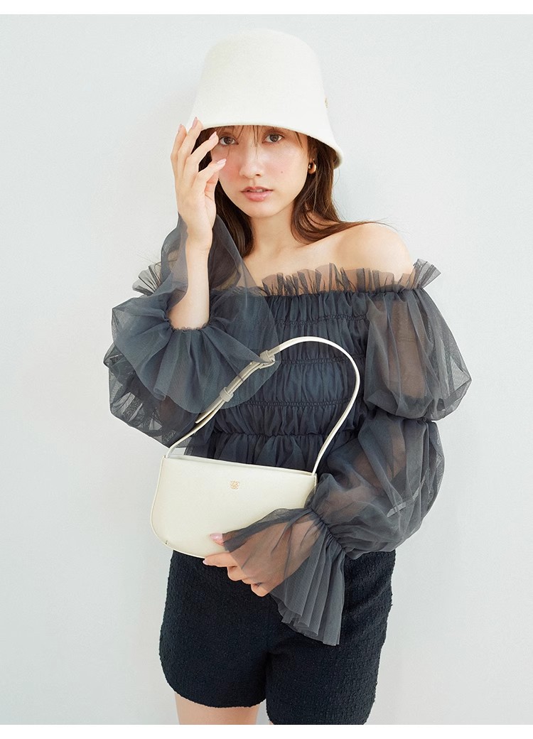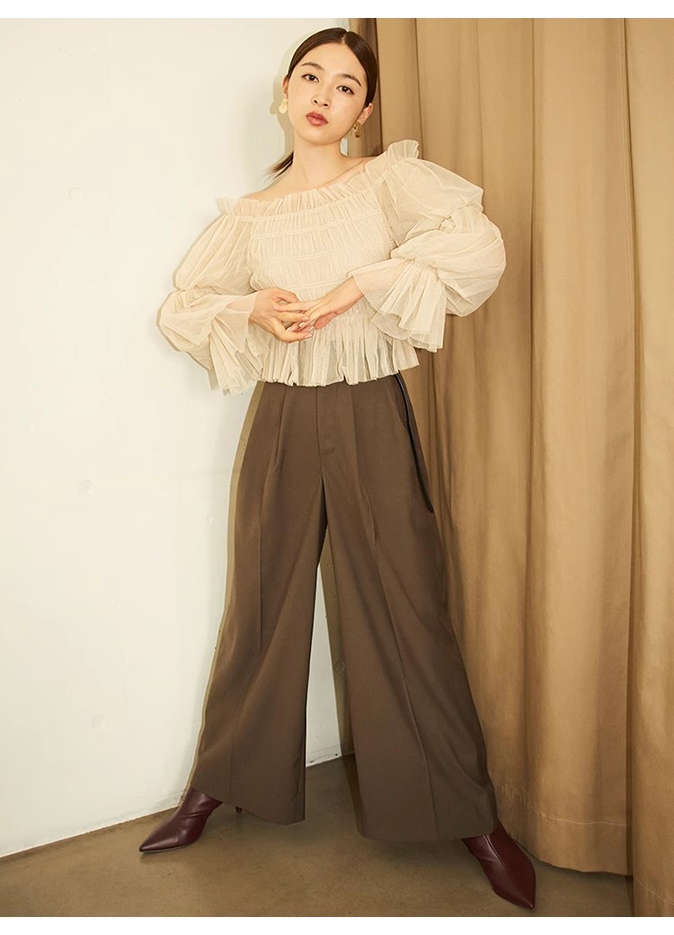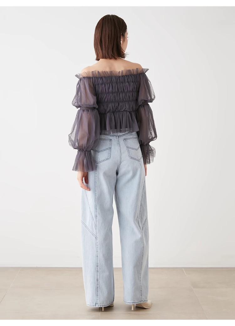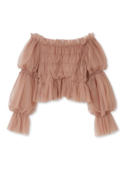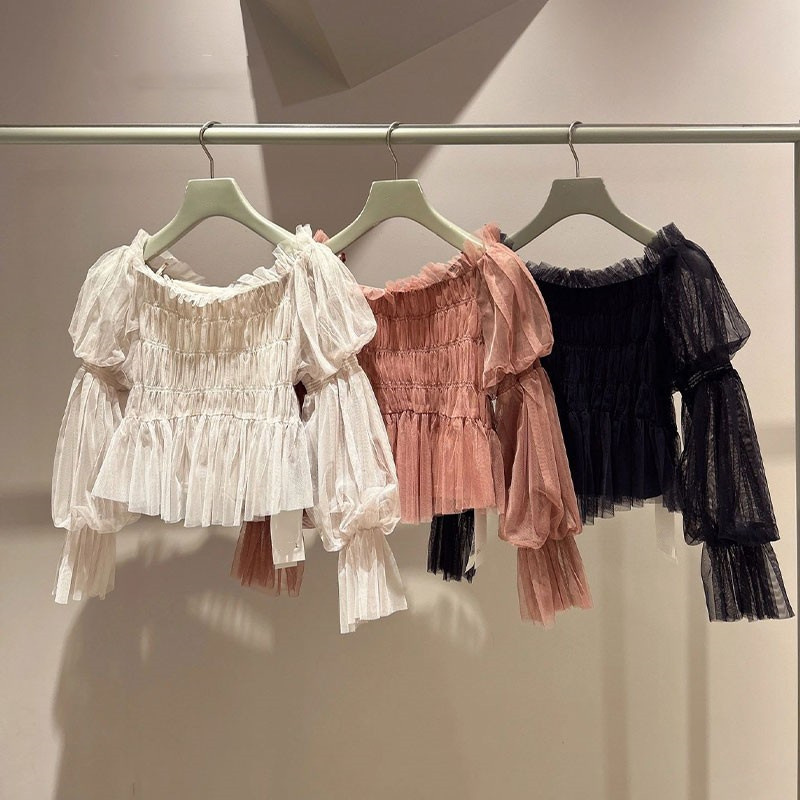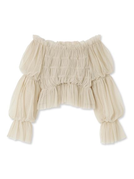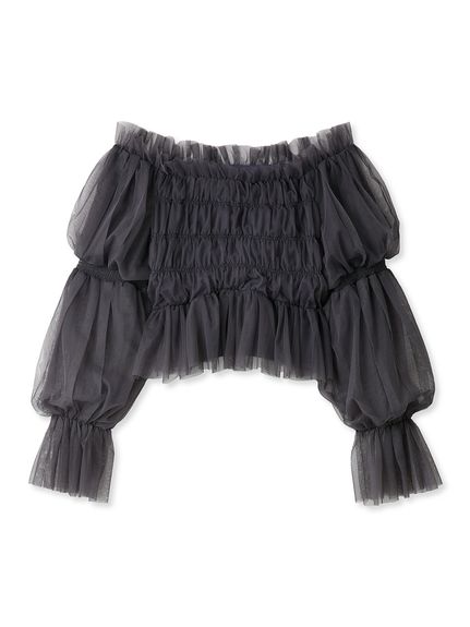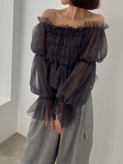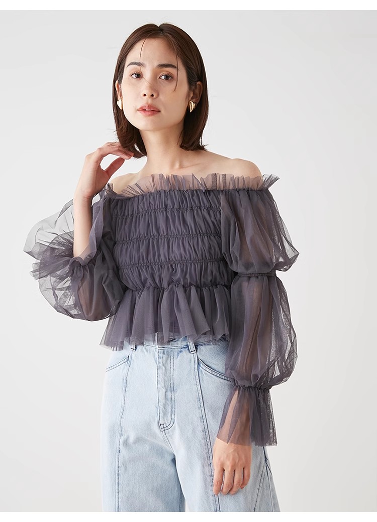 チュールをたっぷりと使用しロマンティックに仕上げたブラウス。ふんだんに効かせたシャーリング&ギャザーで、女性らしさ溢れる表情を演出しました。襟ぐりもウエストもゴム仕様なので、ドレッシーな見た目ながらストレスフリーな着心地に。トレンドライクな肌見せが叶うクロップド丈でどんなボトムとも合わせやすく、幅広いスタイリングに重宝します。