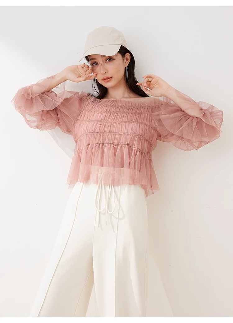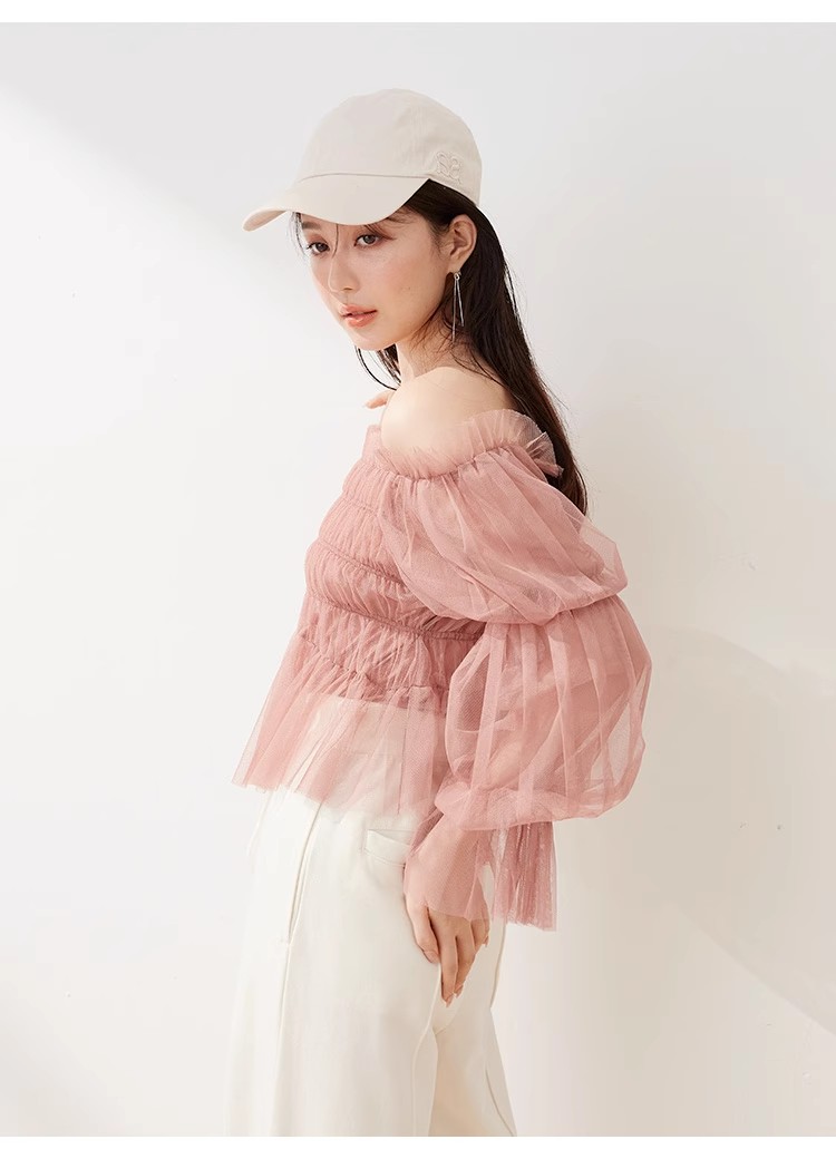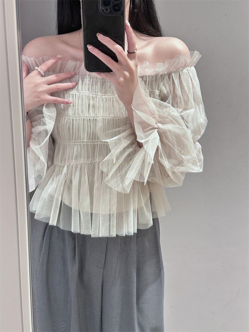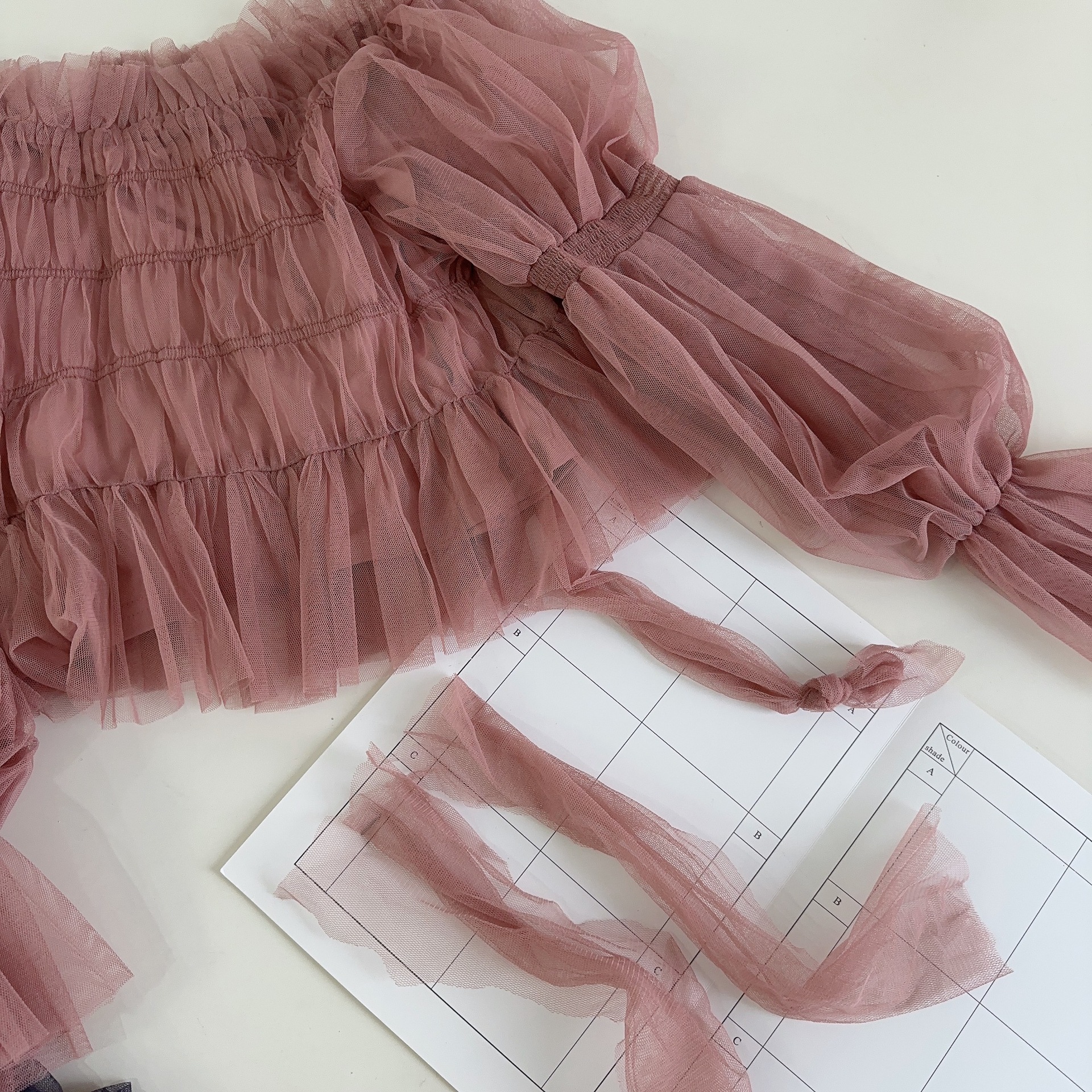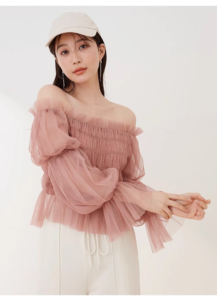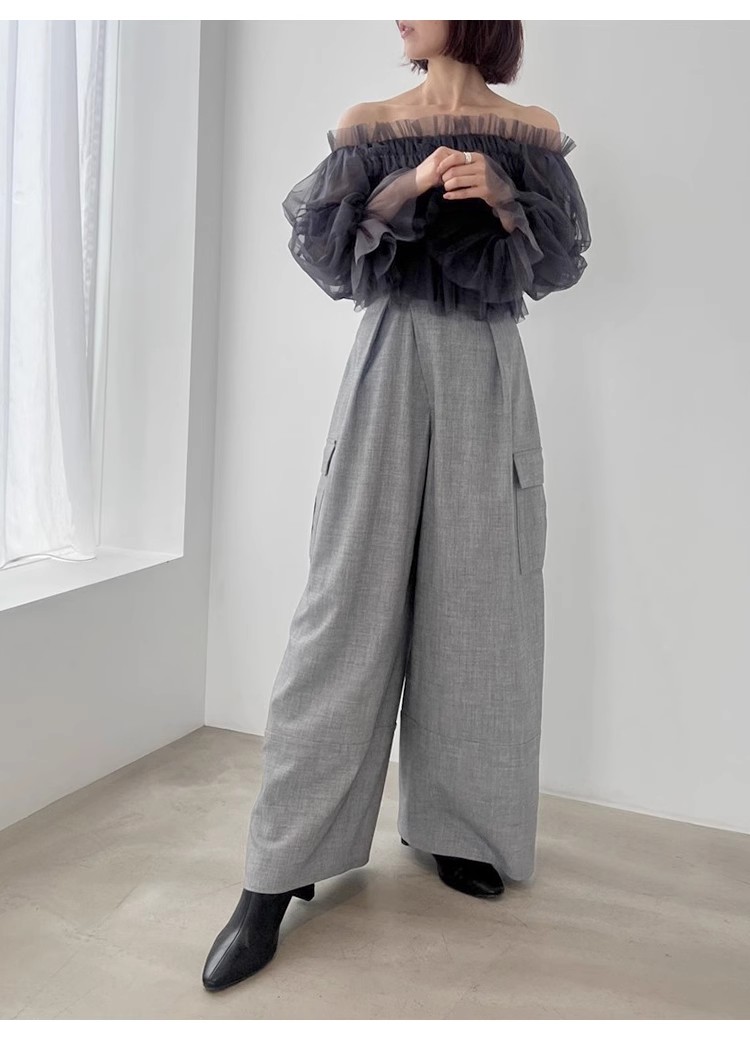 チュールをたっぷりと使用しロマンティックに仕上げたブラウス。ふんだんに効かせたシャーリング&ギャザーで、女性らしさ溢れる表情を演出しました。襟ぐりもウエストもゴム仕様なので、ドレッシーな見た目ながらストレスフリーな着心地に。トレンドライクな肌見せが叶うクロップド丈でどんなボトムとも合わせやすく、幅広いスタイリングに重宝します。