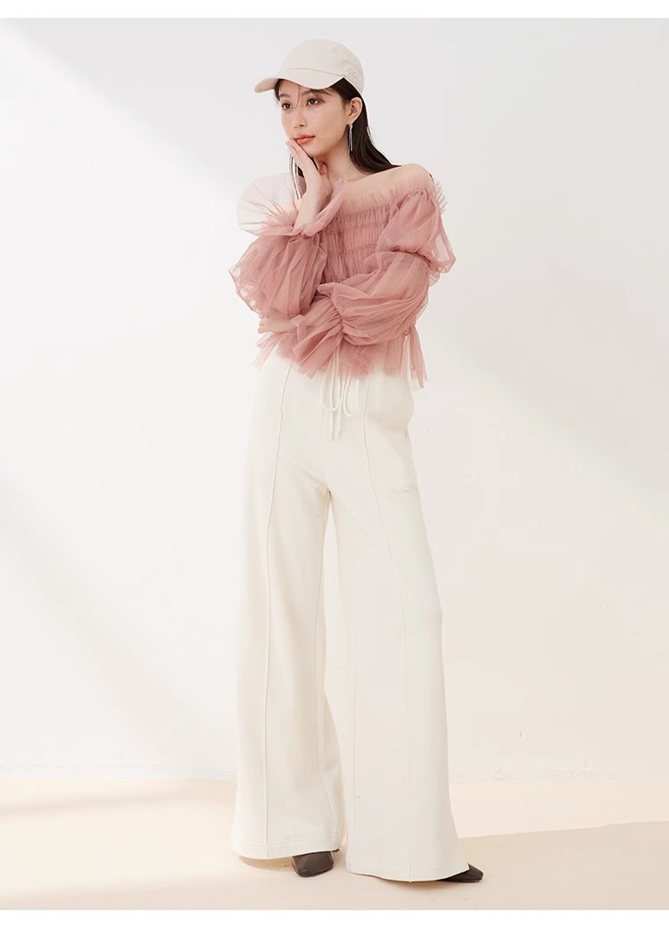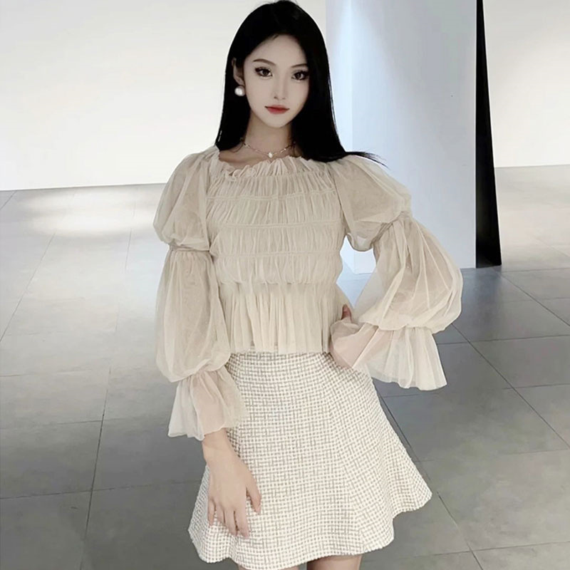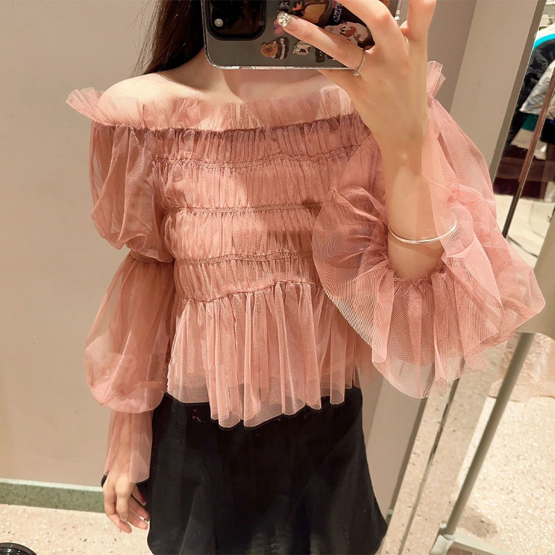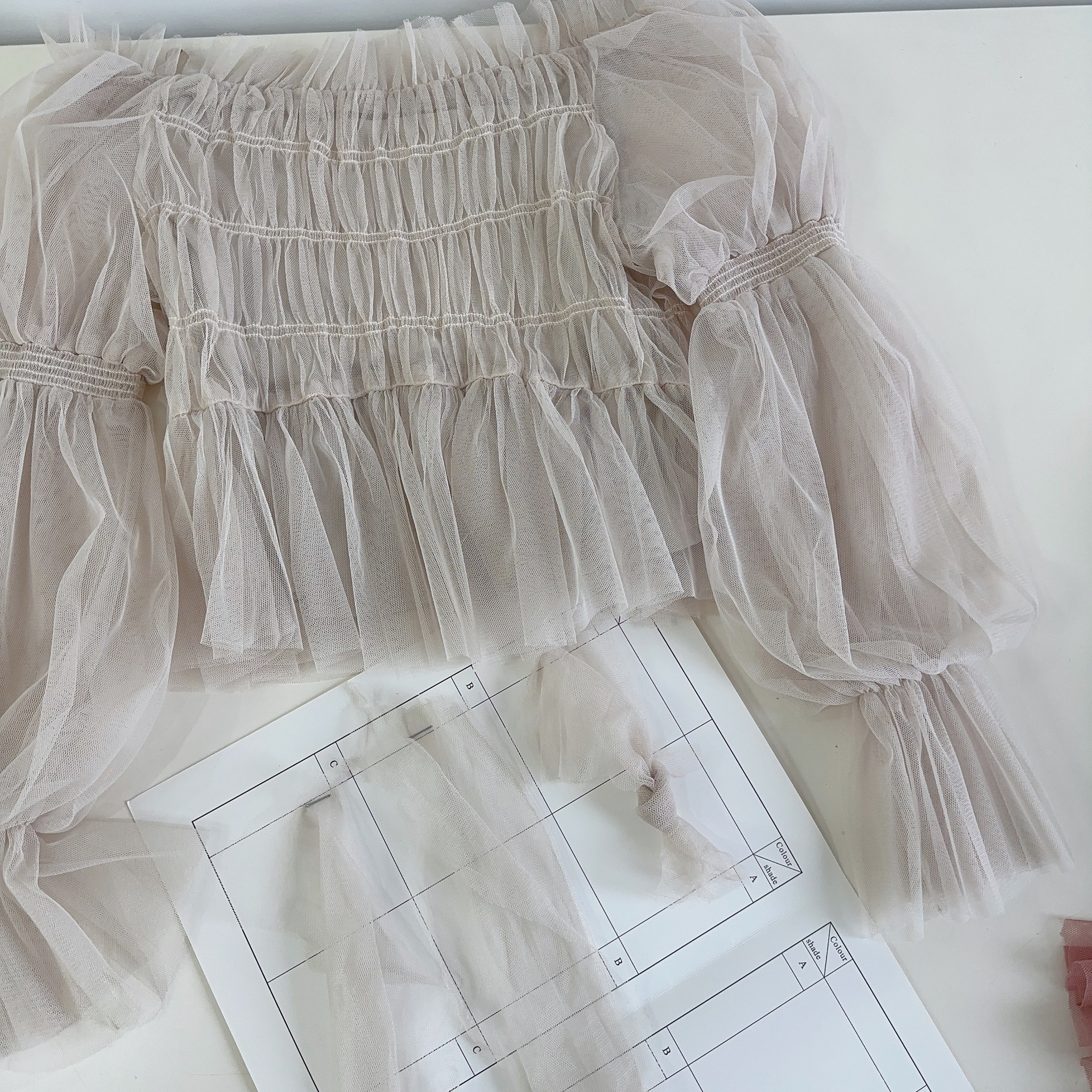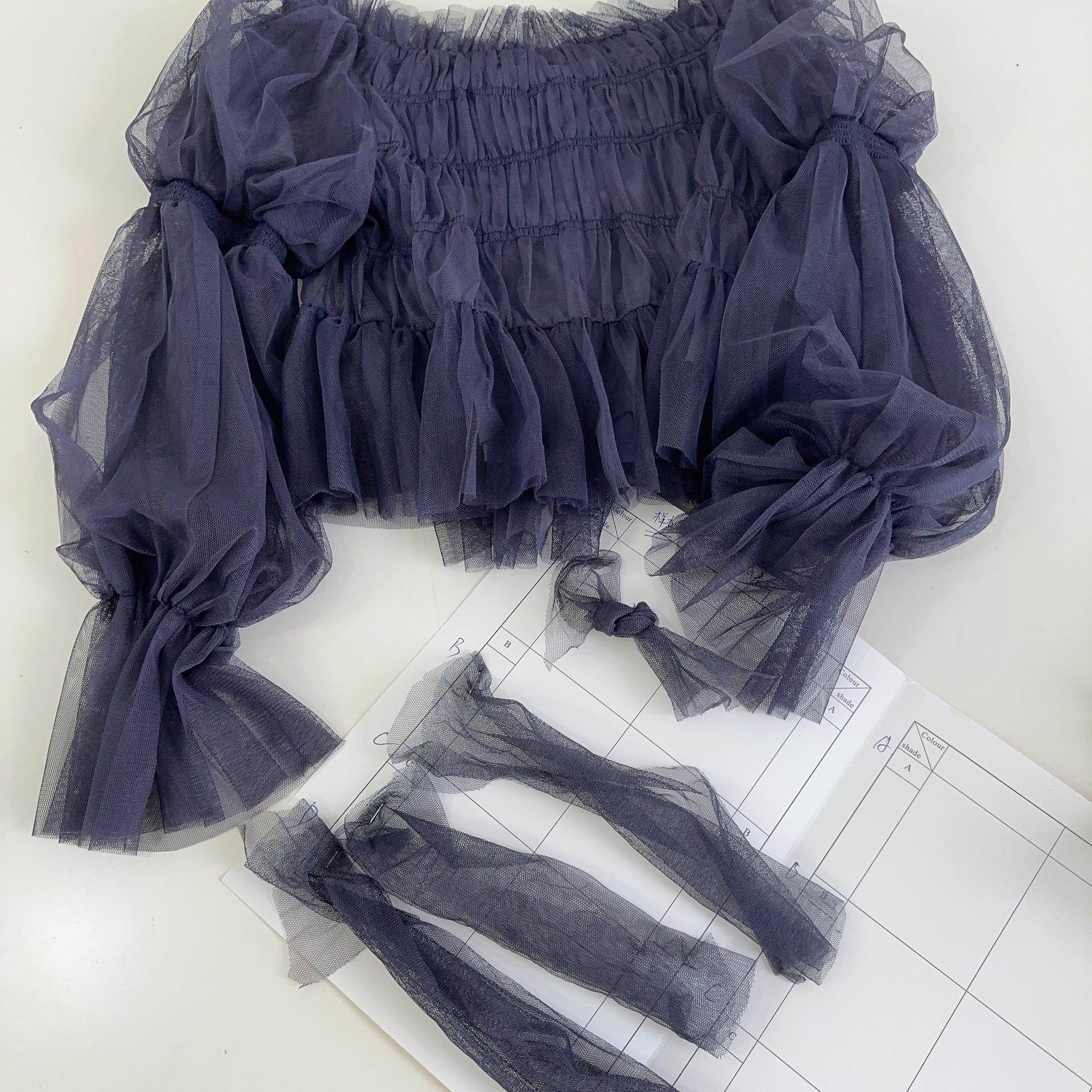 チュールをたっぷりと使用しロマンティックに仕上げたブラウス。ふんだんに効かせたシャーリング&ギャザーで、女性らしさ溢れる表情を演出しました。襟ぐりもウエストもゴム仕様なので、ドレッシーな見た目ながらストレスフリーな着心地に。トレンドライクな肌見せが叶うクロップド丈でどんなボトムとも合わせやすく、幅広いスタイリングに重宝します。