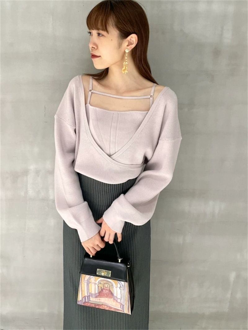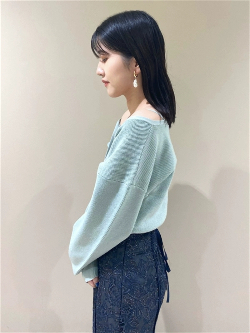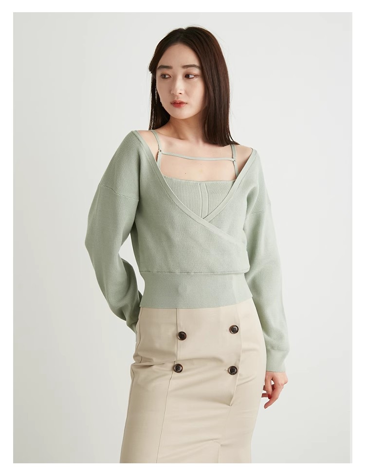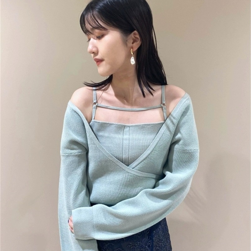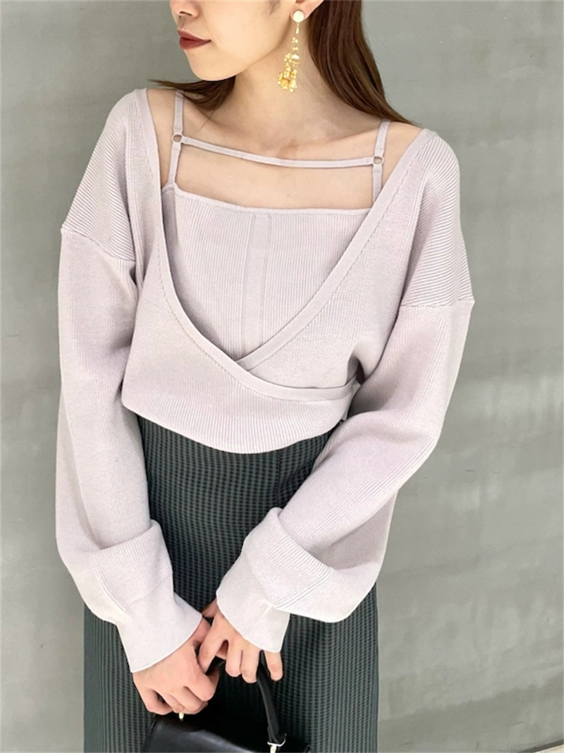 女性らしいカシュクールデザインにキャミソールをドッキングしたニットトップス。表のニットは内側でキャミソールに留めているので、肩を少し落とした着こなしでも袖がずれ落ちてこないので安心して着用頂けます。キャミソールのデコルテにはランジェリー風のディテールを落とし込み、コーデに合わせるだけでこなれた雰囲気に。ウエストは太めのリブ切り替えできゅっと引き締めスタイルアップへと導きます。
