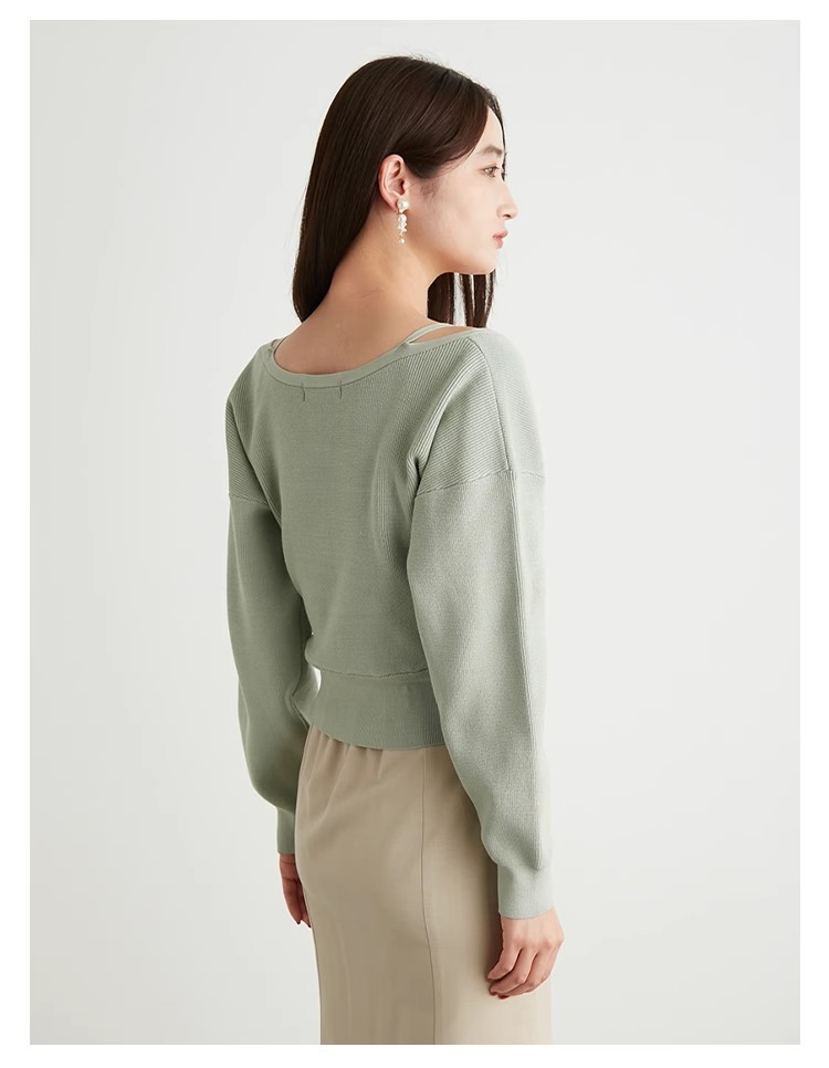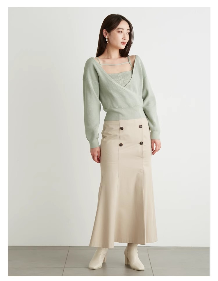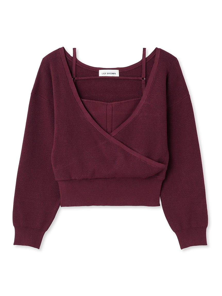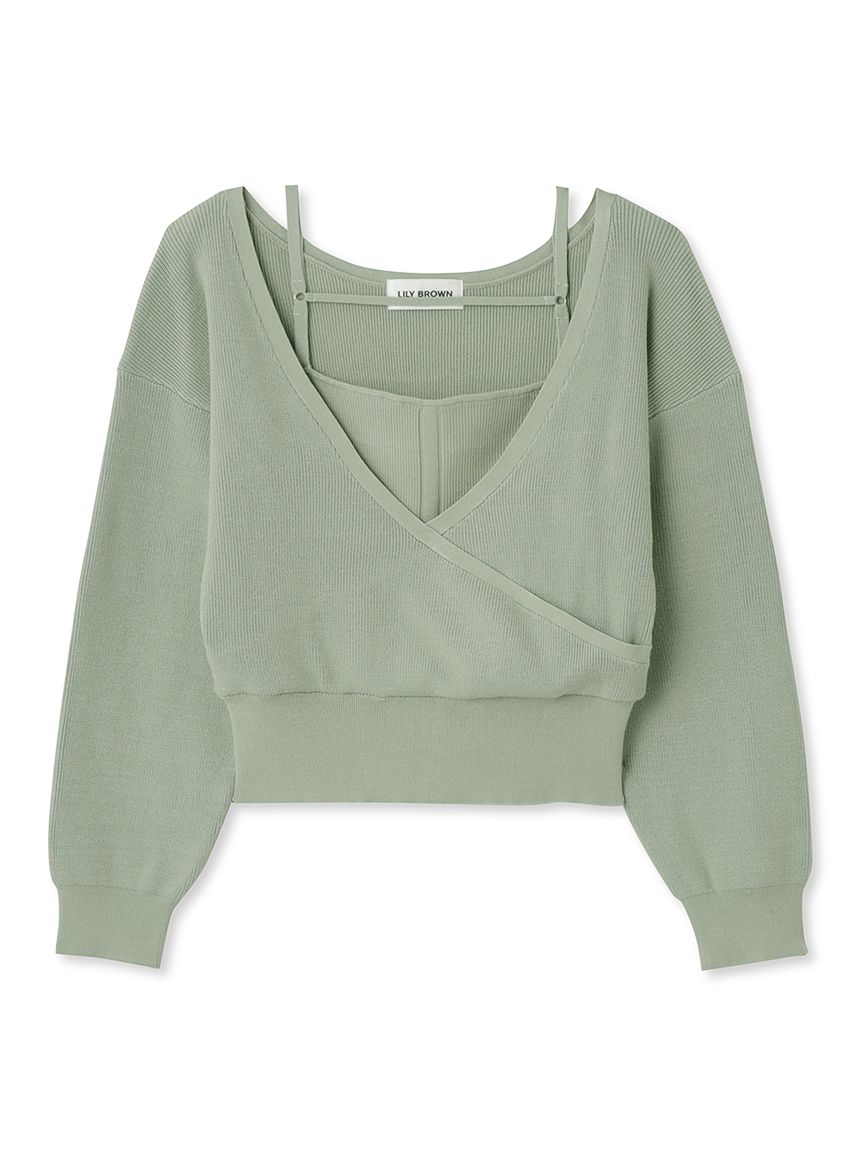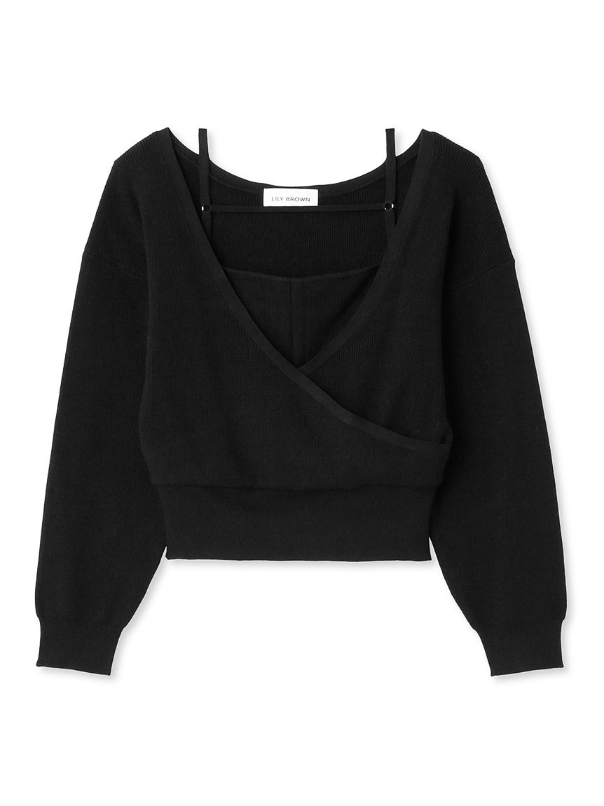 女性らしいカシュクールデザインにキャミソールをドッキングしたニットトップス。表のニットは内側でキャミソールに留めているので、肩を少し落とした着こなしでも袖がずれ落ちてこないので安心して着用頂けます。キャミソールのデコルテにはランジェリー風のディテールを落とし込み、コーデに合わせるだけでこなれた雰囲気に。ウエストは太めのリブ切り替えできゅっと引き締めスタイルアップへと導きます。