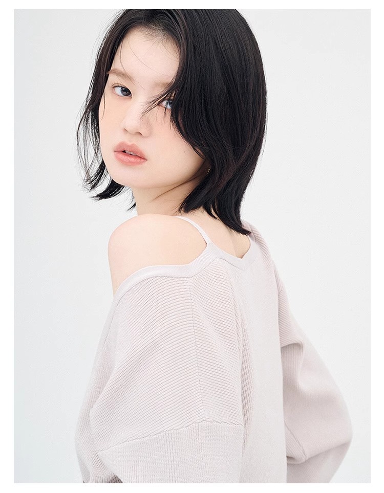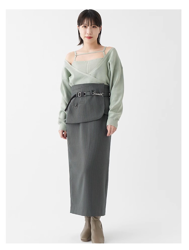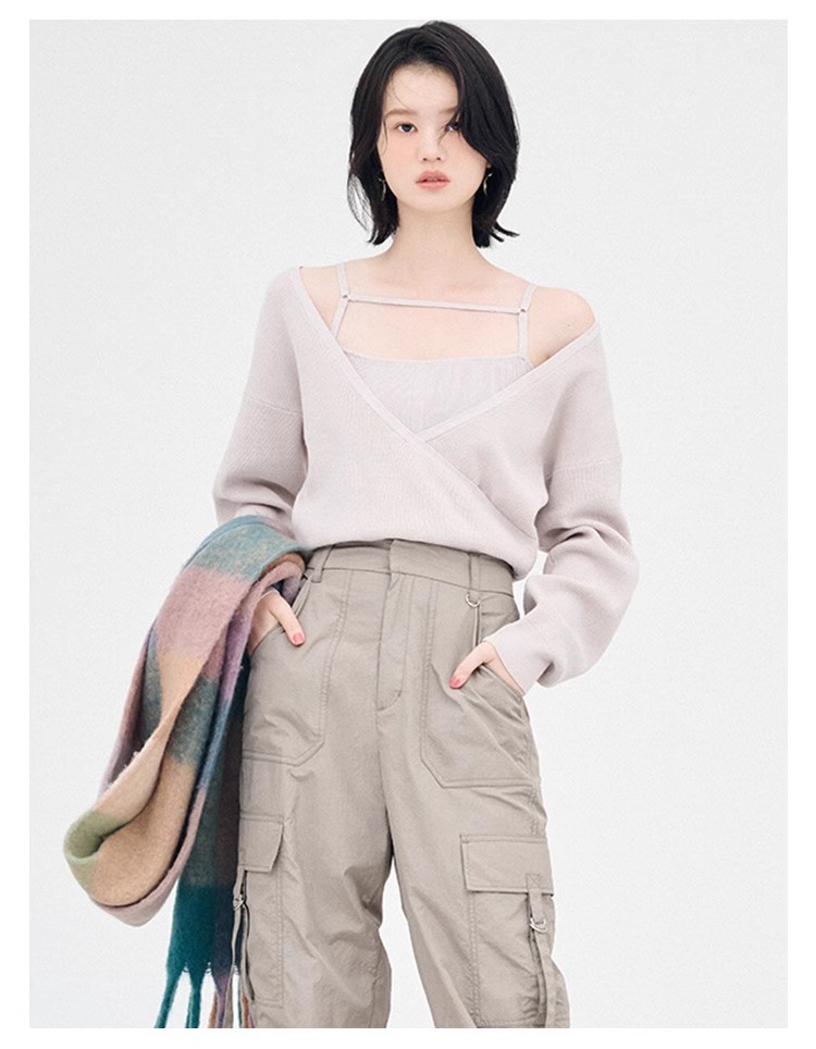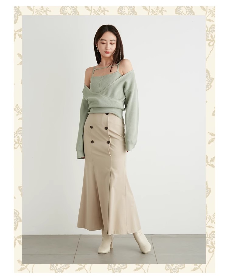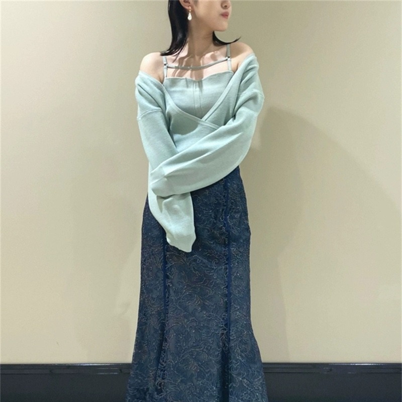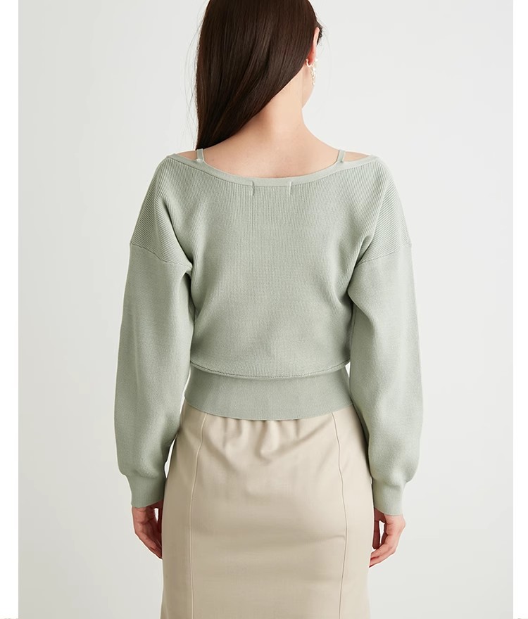女性らしいカシュクールデザインにキャミソールをドッキングしたニットトップス。表のニットは内側でキャミソールに留めているので、肩を少し落とした着こなしでも袖がずれ落ちてこないので安心して着用頂けます。キャミソールのデコルテにはランジェリー風のディテールを落とし込み、コーデに合わせるだけでこなれた雰囲気に。ウエストは太めのリブ切り替えできゅっと引き締めスタイルアップへと導きます。