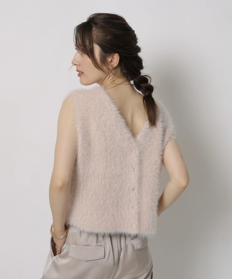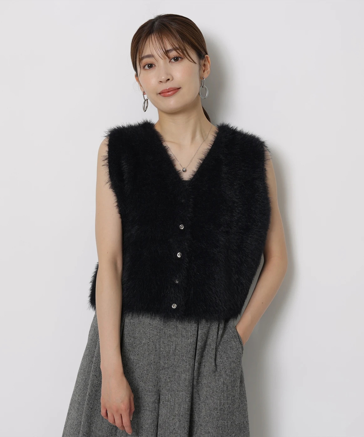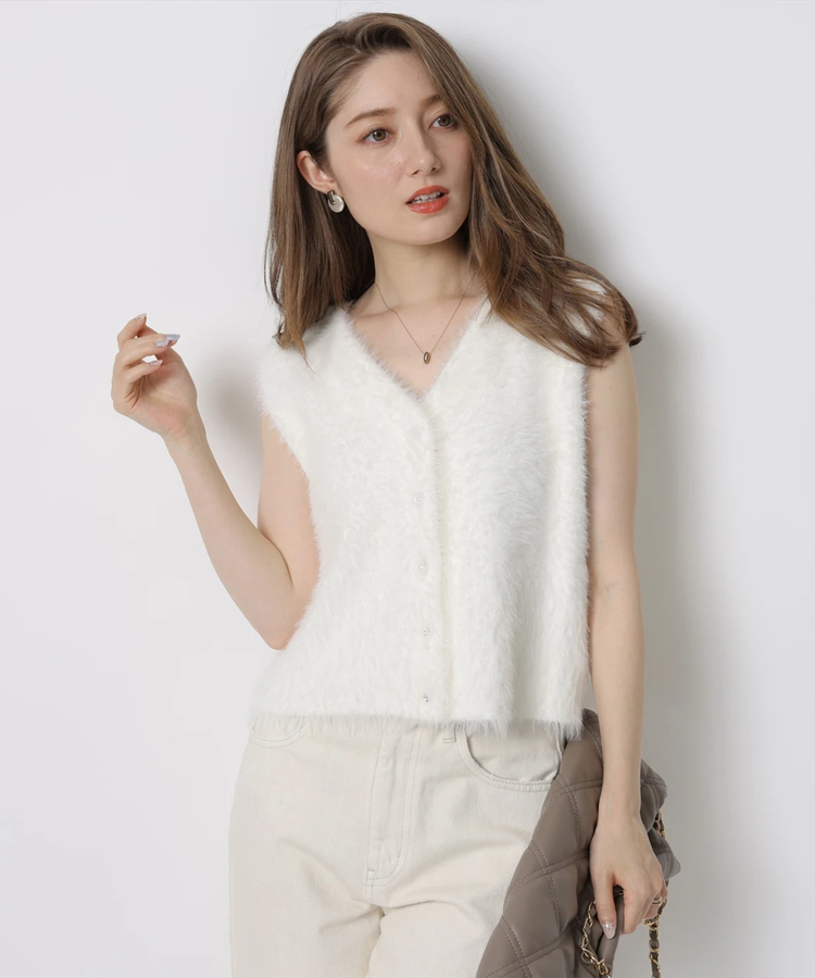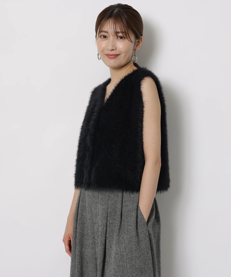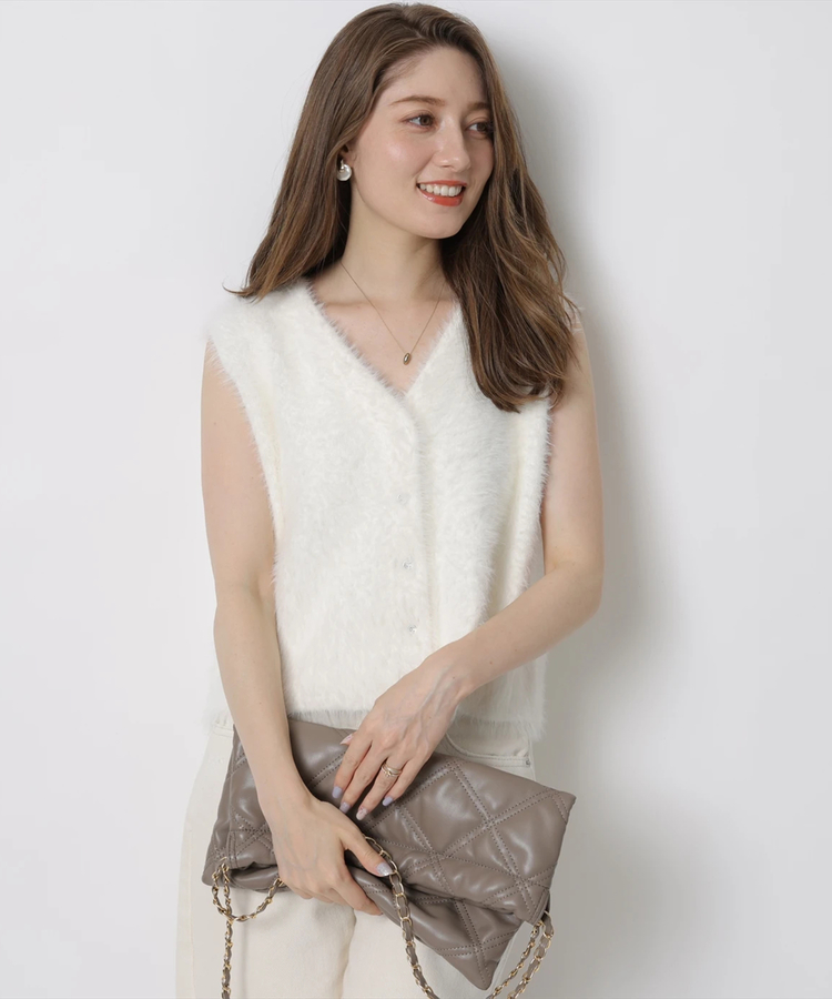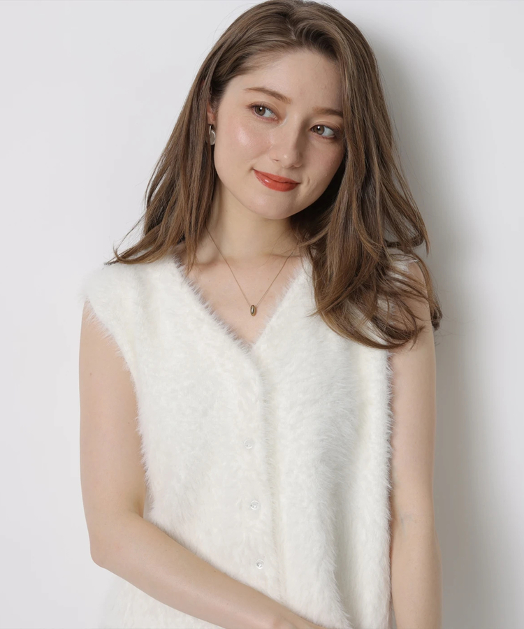 装いを華やかな印象に見せてくれる存在感も魅力です。Vネックにすることで首や顔のラインをすっきりと綺麗に見せてくれるのも嬉しいポイント◎