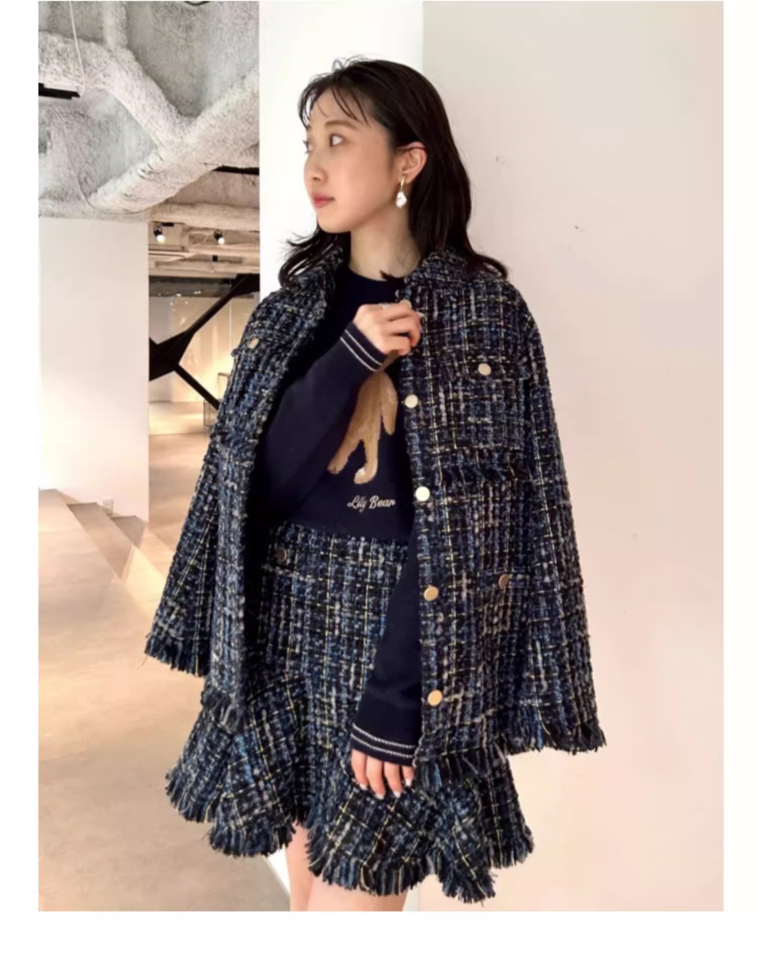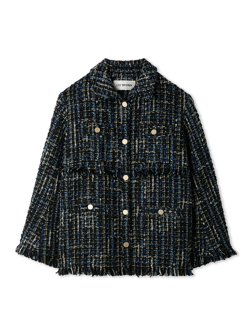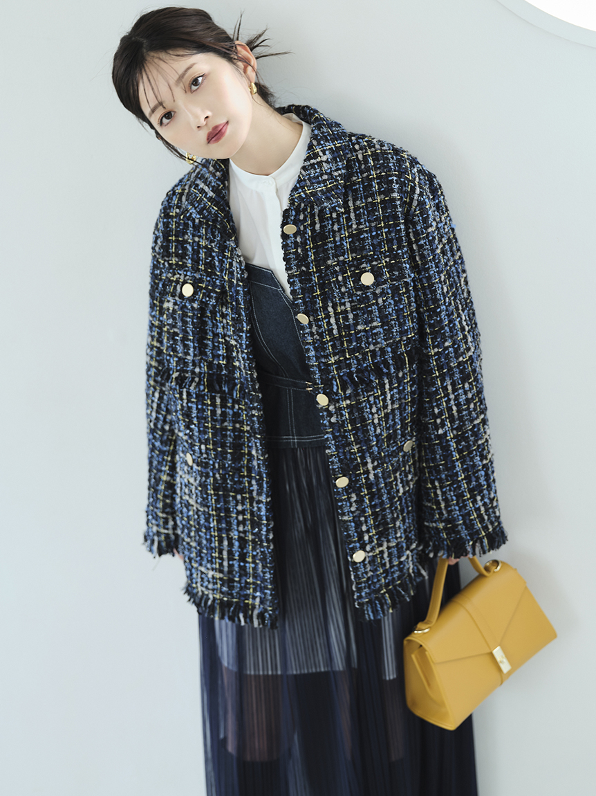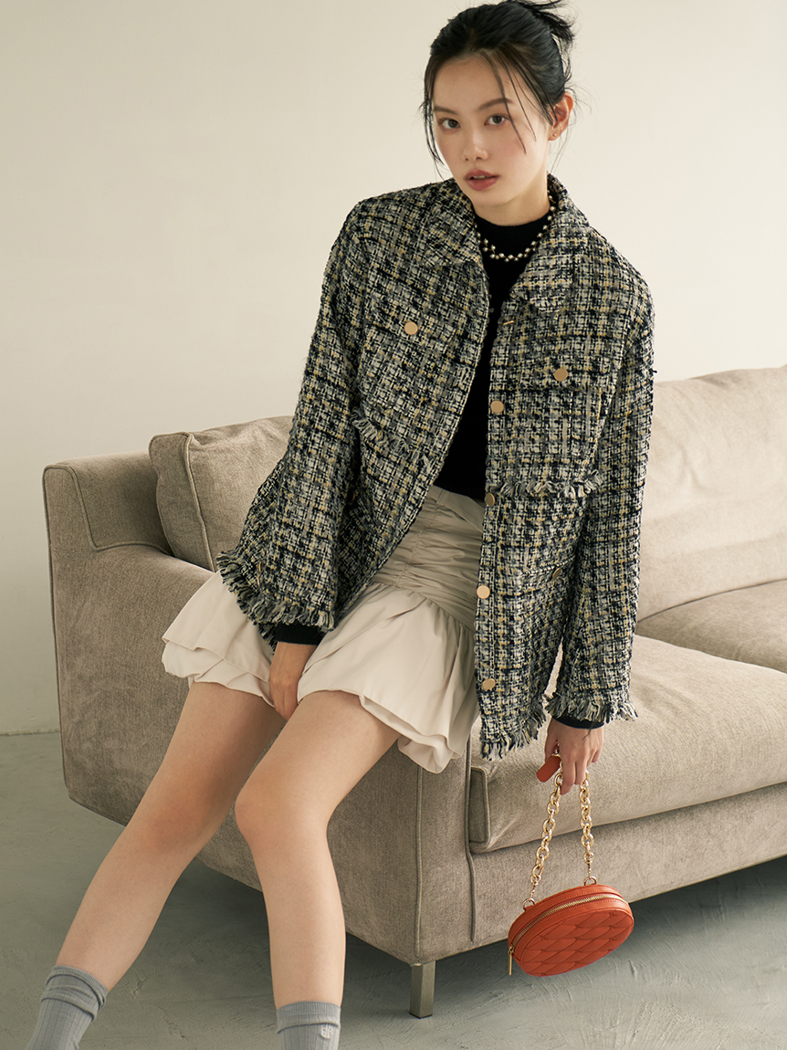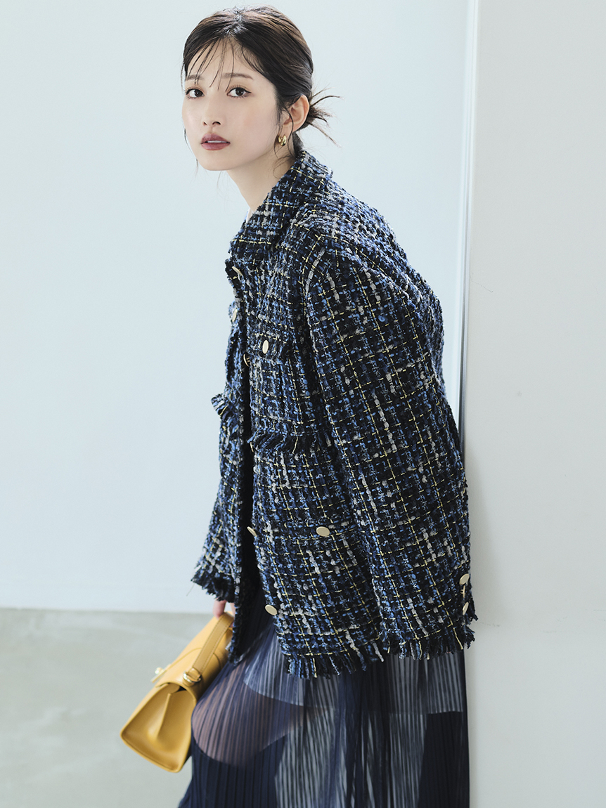昨年人気を集めたツイードジャケットが今季も登場。オリジナルのツイードはグラデーションになったフラッグ糸やウーリー糸、ラメ糸、リングのように立体的な糸など、数種類の糸で表現しました。トレンド感のあるオーバーサイズでカジュアルなコーデに羽織るだけでこなれ感がアップ。同シリーズのスカート(LWFS234233)とセットアップで着用すればよりトレンドライクなスタイリングが完成します。