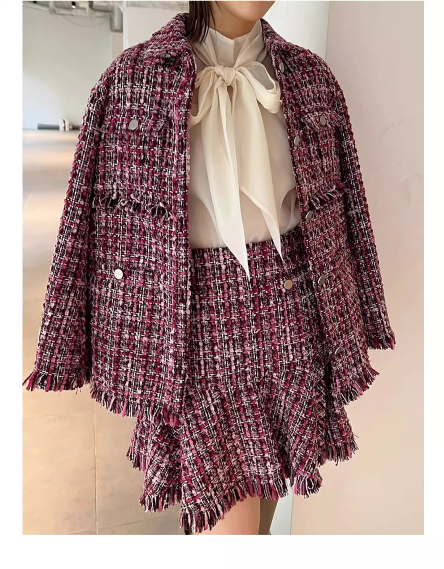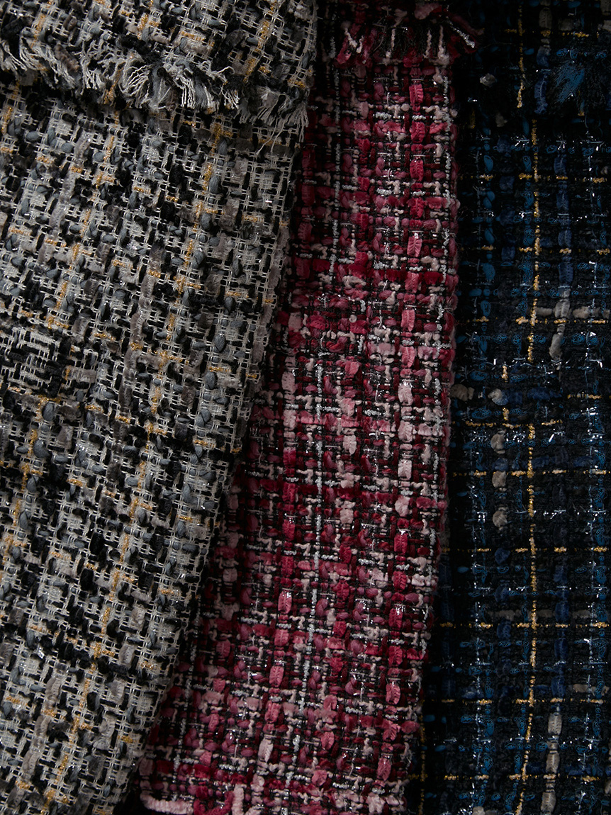 数種類の糸を組み合わせバランス良く仕上げたオリジナルのツイードを使用。ベーシックなホワイト、大人っぽくシックなネイビー、シーズンムードを盛り上げてくれるピンクの3色展開でお届けします。