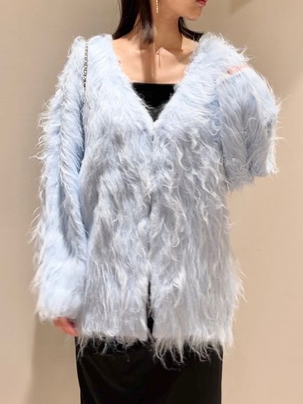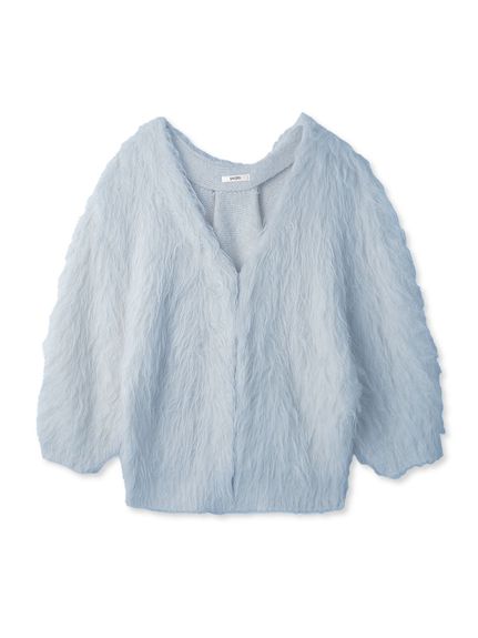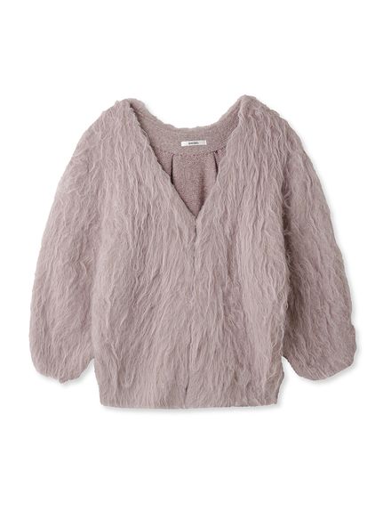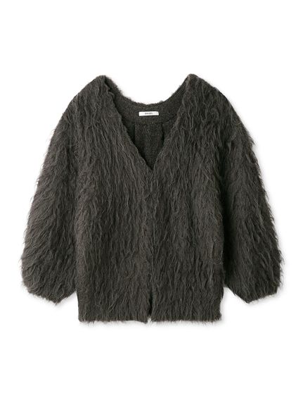 たっぷりと毛の吹いたシャギーニットを使用した華やかなカーディガン。ふわふわと存在感のある編地ながらもシンプルなデザインで、様々なアイテムにマッチしてくれます。フロント部分には金属のホックをあしらい女性らしい仕上がりに。バックネックにタックを効かせた丸みのあるシルエットで身体をすっぽりと包み込み、体型カバー効果も期待できます。