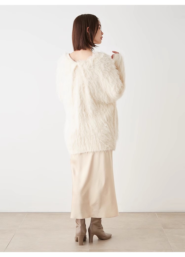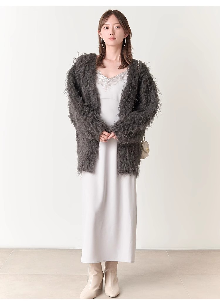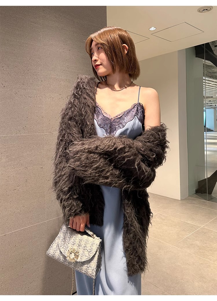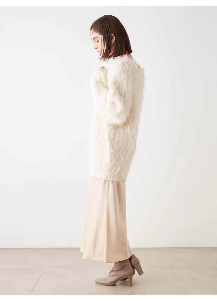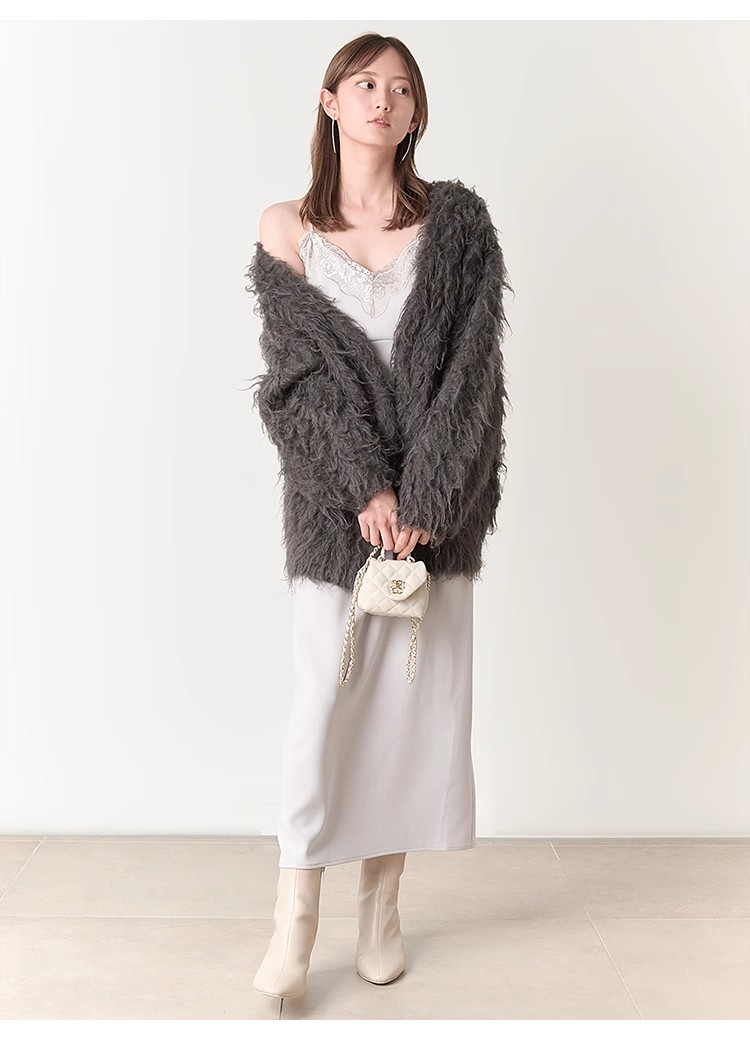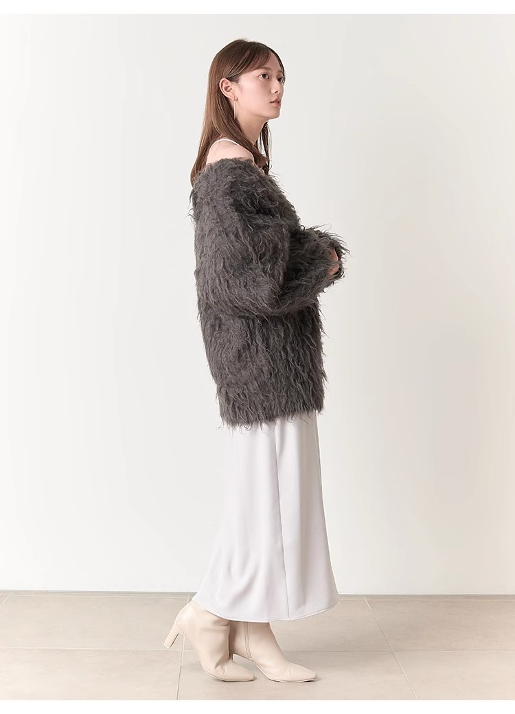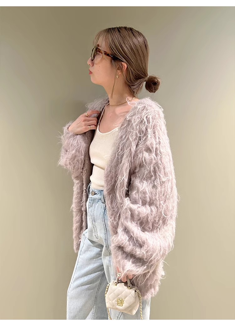 【温もり溢れるシャギーニットで華やかに見せるカーディガン】