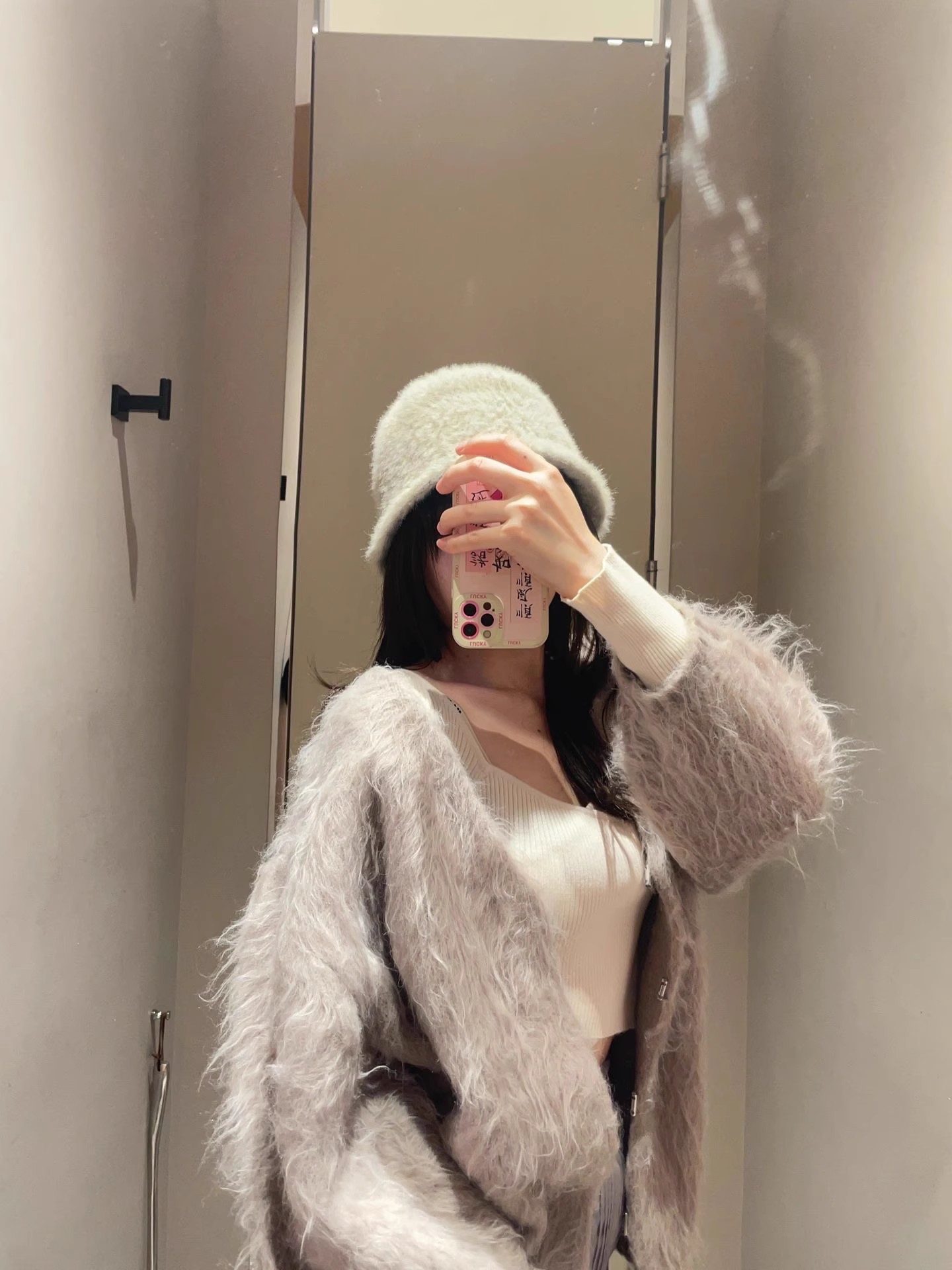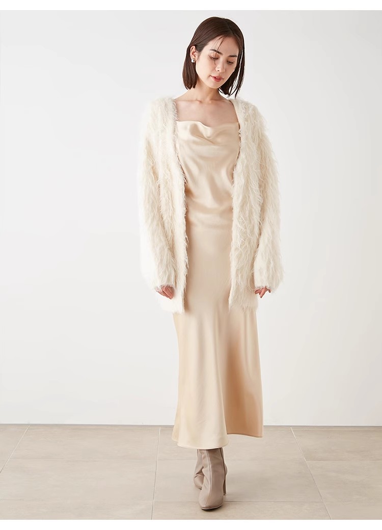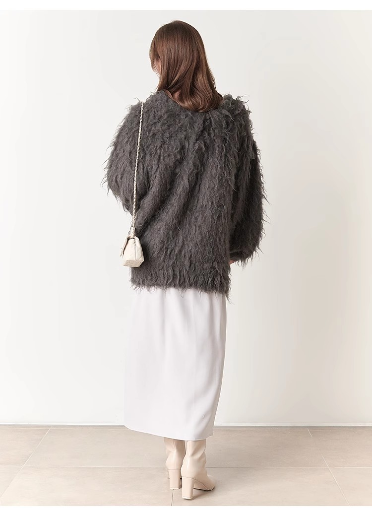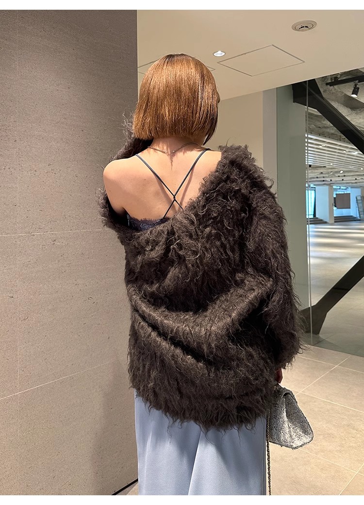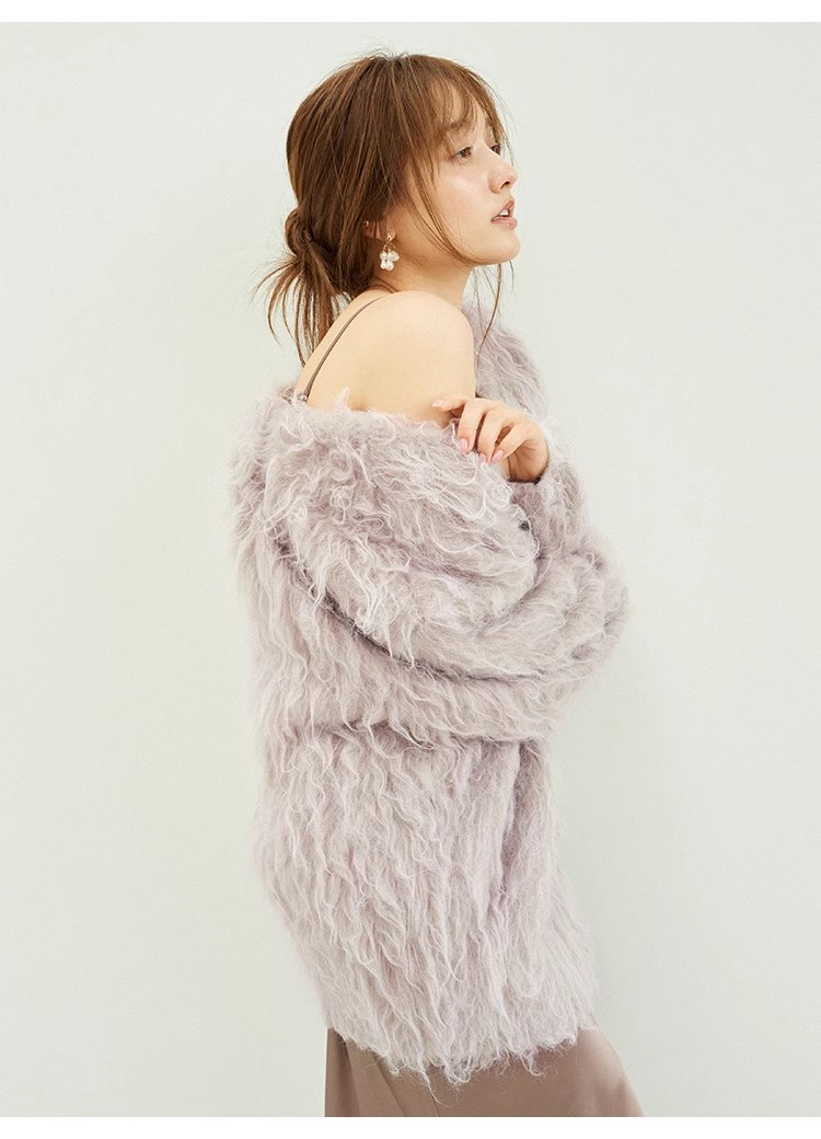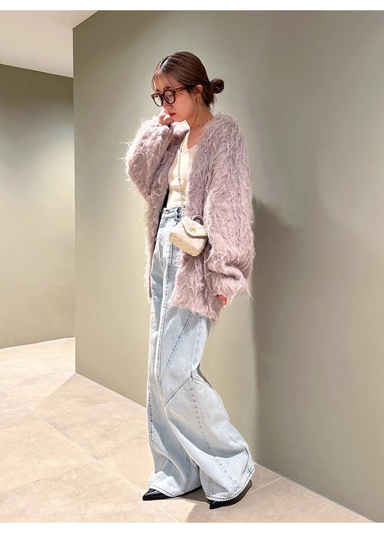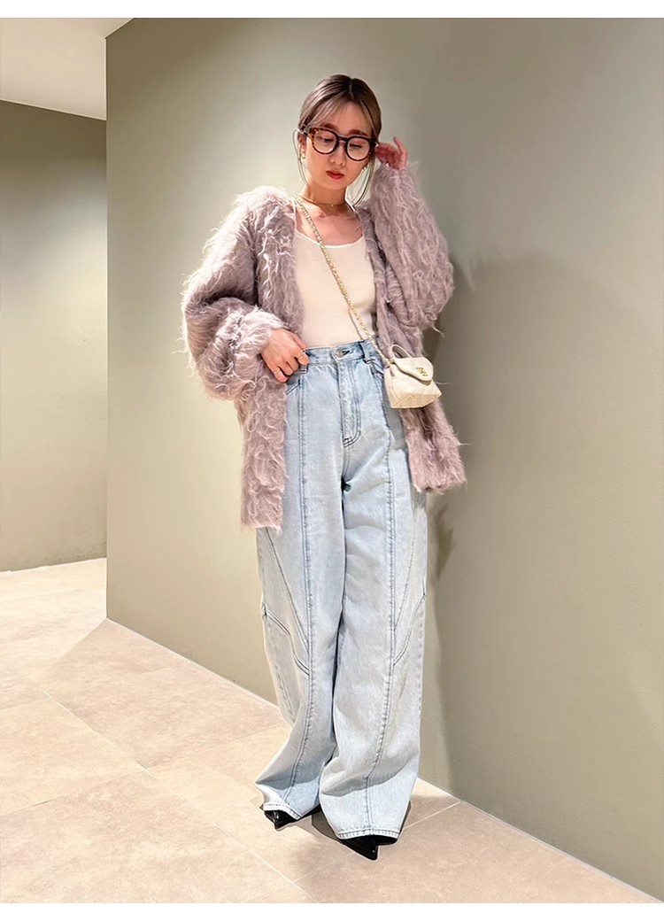 【温もり溢れるシャギーニットで華やかに見せるカーディガン】