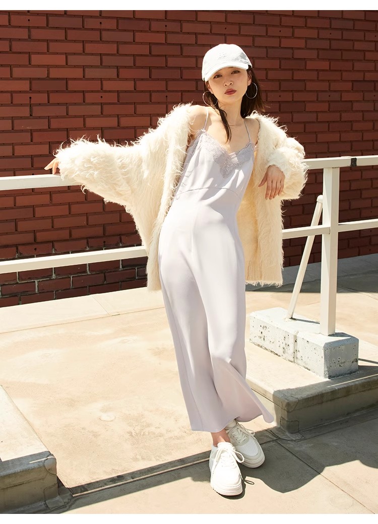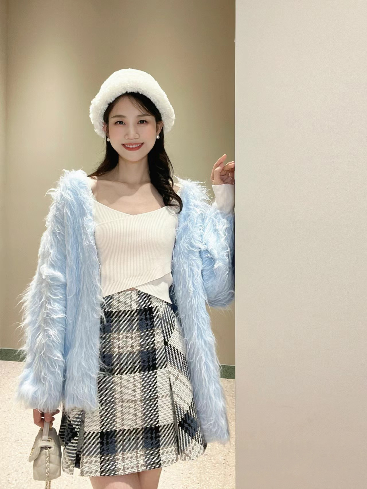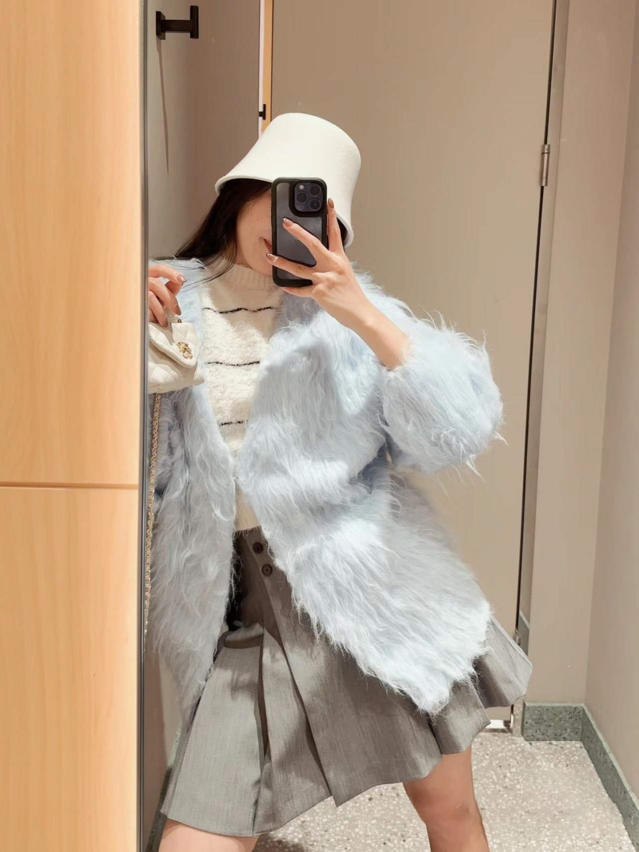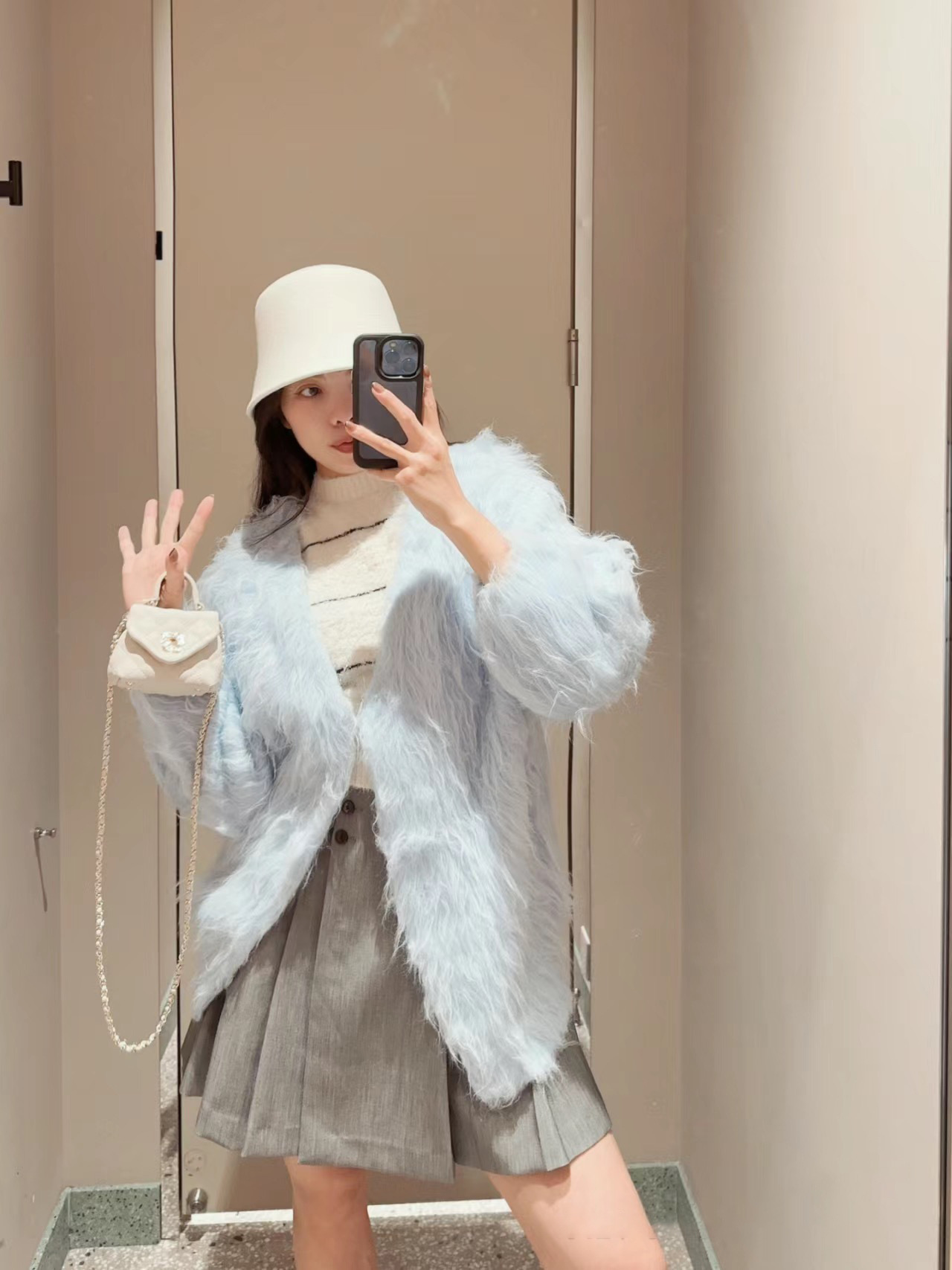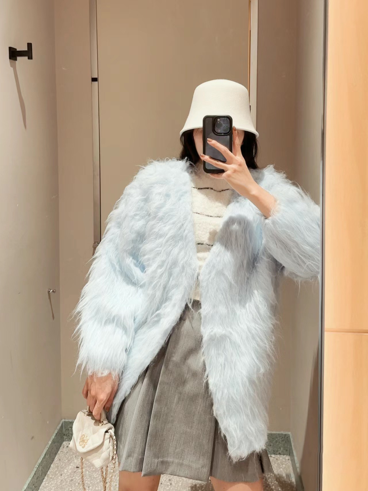 毛足の長いふわふわと柔らかなシャギーニットを使用。ベーシックで着まわしやすいアイボリー、ライトグレー、ダークグレーとコーディネートに映えるライトブルーの4色展開でお届けします。