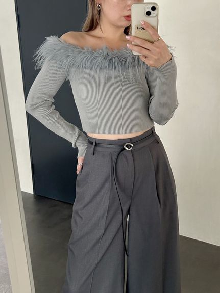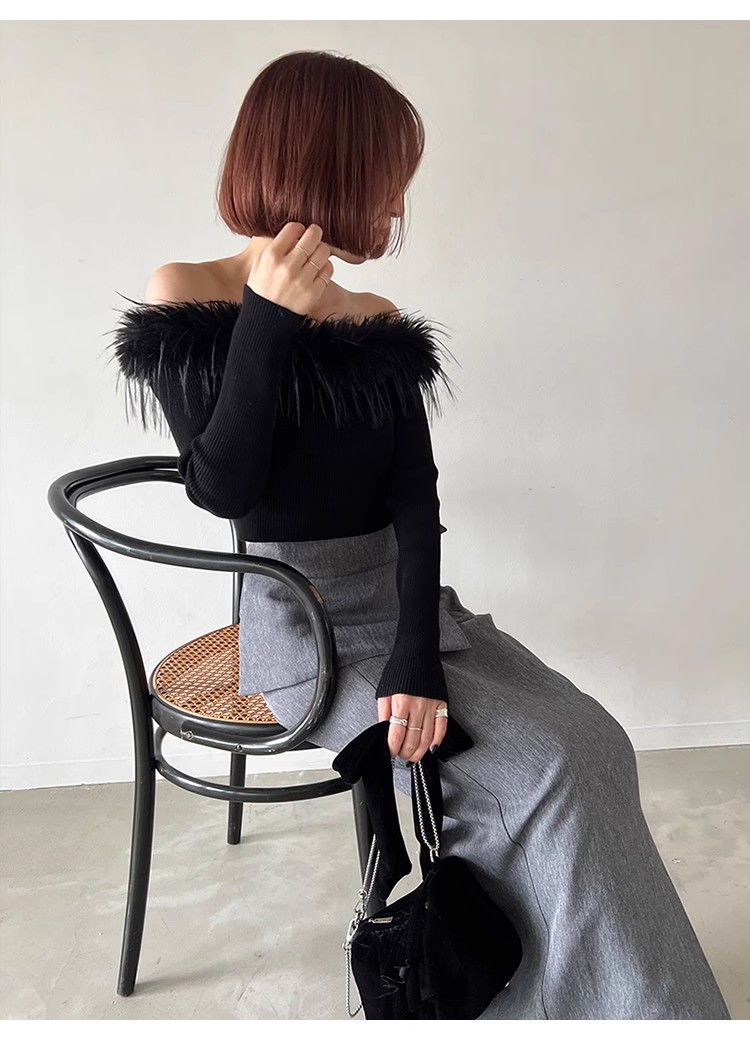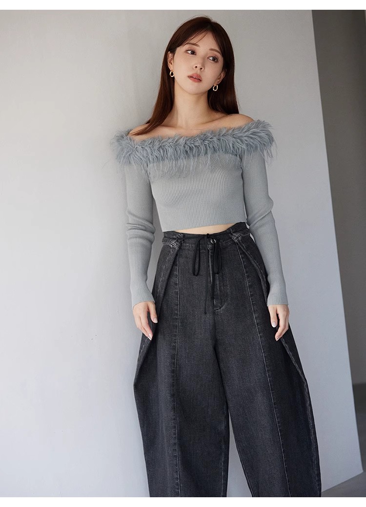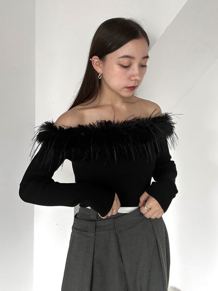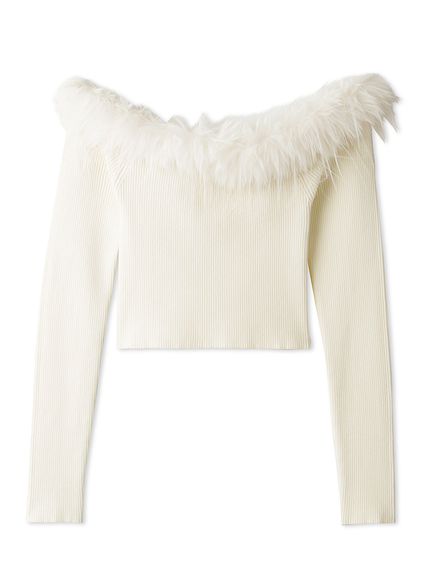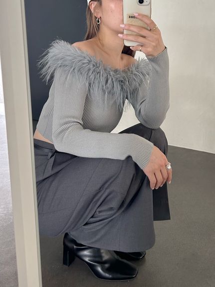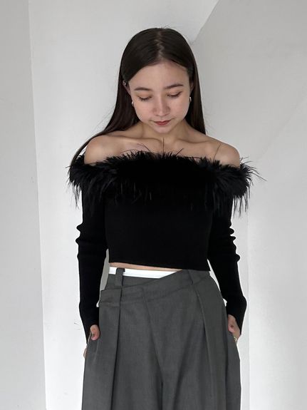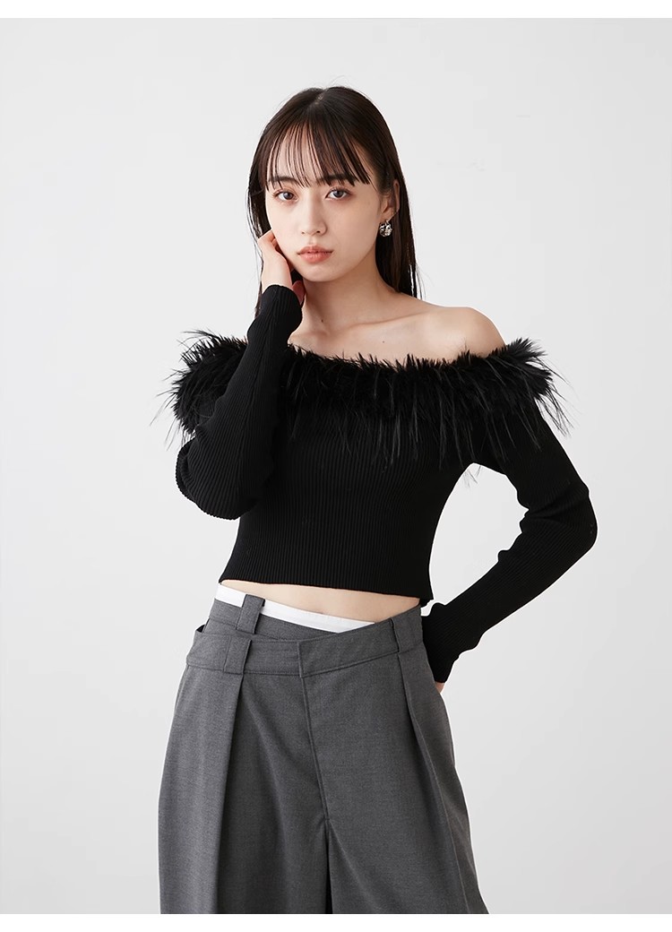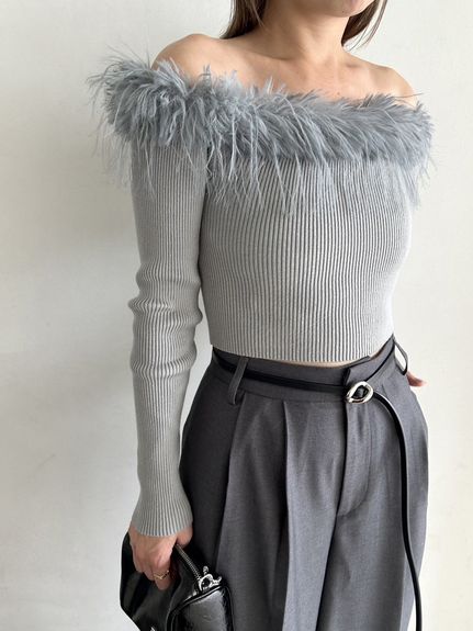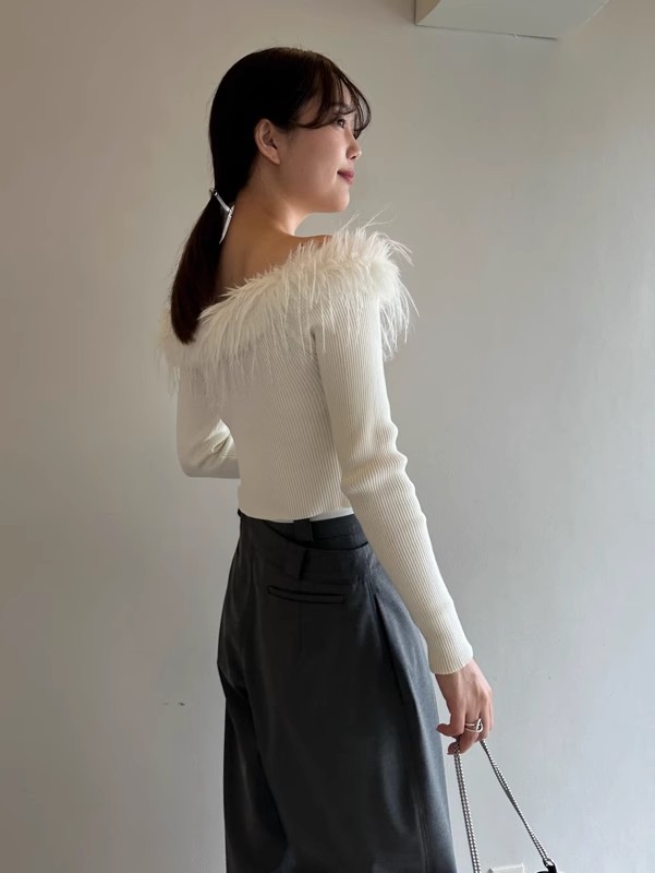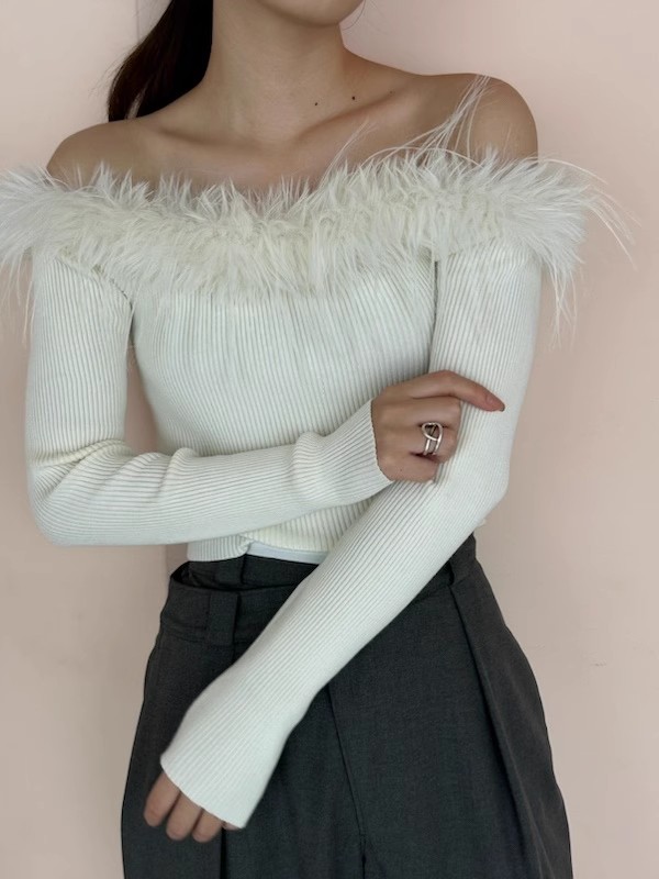 ボリューミーなフェイクファーをぐるりとあしらったニットは、一枚で絵になる存在感を発揮。ファーが際立つように、身頃は適度なタイトシルエット&クロップド丈ですっきりまとめました。オフショルによる肌見せで色気も加えることで、かわいくなりすぎずキレよく楽しめるデザインに。ハイウエストパンツなどに合わせるハンサムなスタイリングがおすすめです。