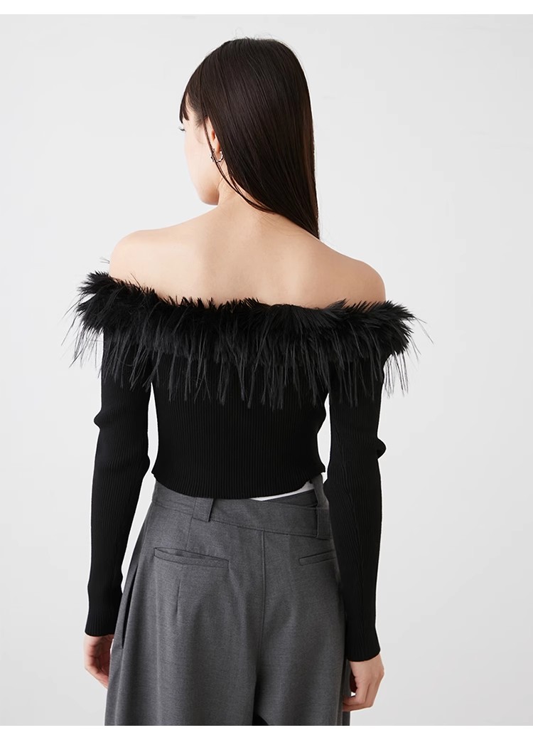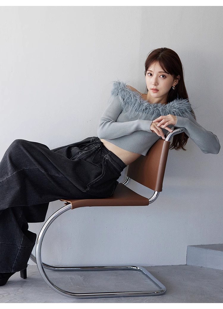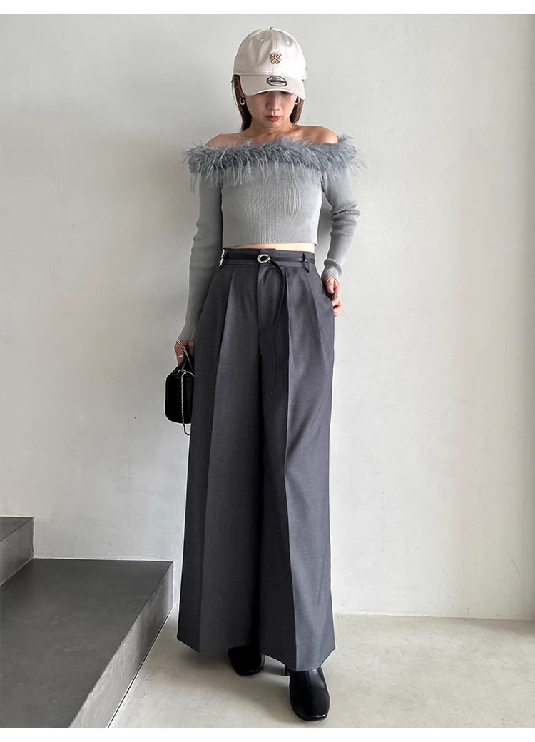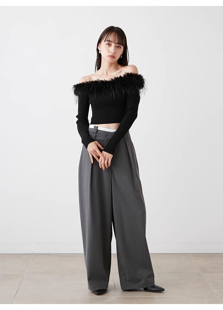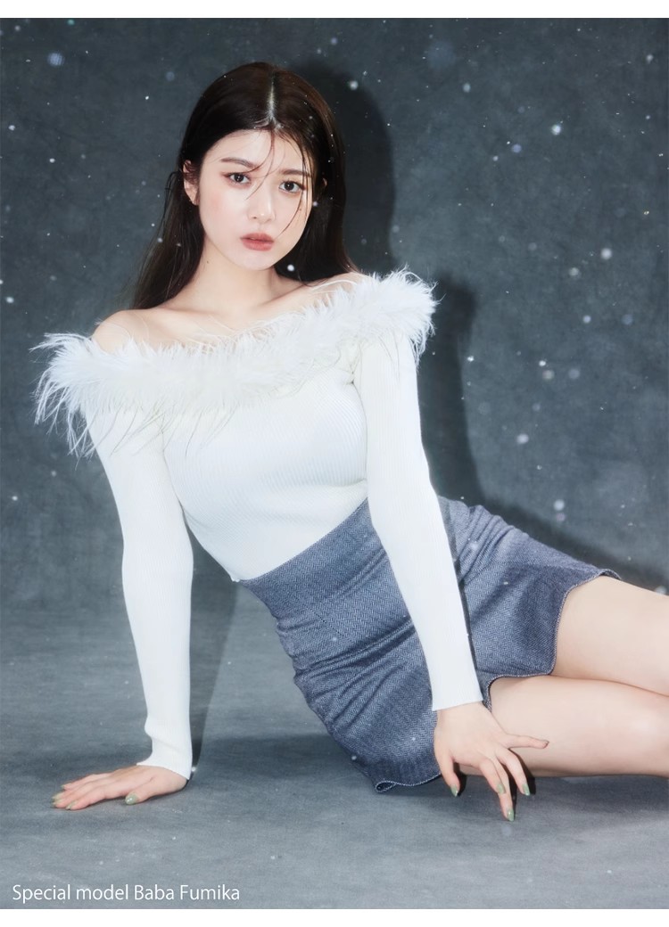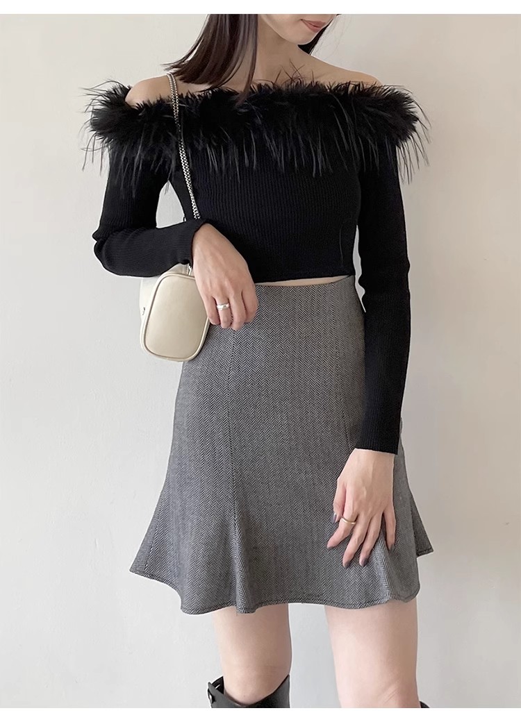 ボリューミーなフェイクファーをぐるりとあしらったニットは、一枚で絵になる存在感を発揮。ファーが際立つように、身頃は適度なタイトシルエット&クロップド丈ですっきりまとめました。オフショルによる肌見せで色気も加えることで、かわいくなりすぎずキレよく楽しめるデザインに。ハイウエストパンツなどに合わせるハンサムなスタイリングがおすすめです。