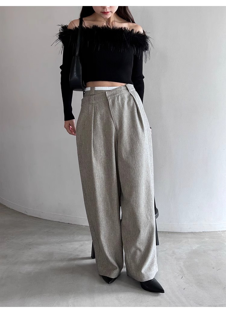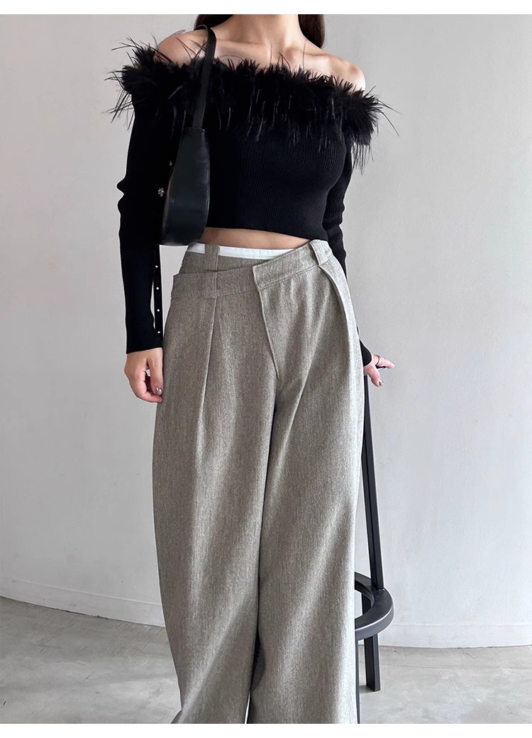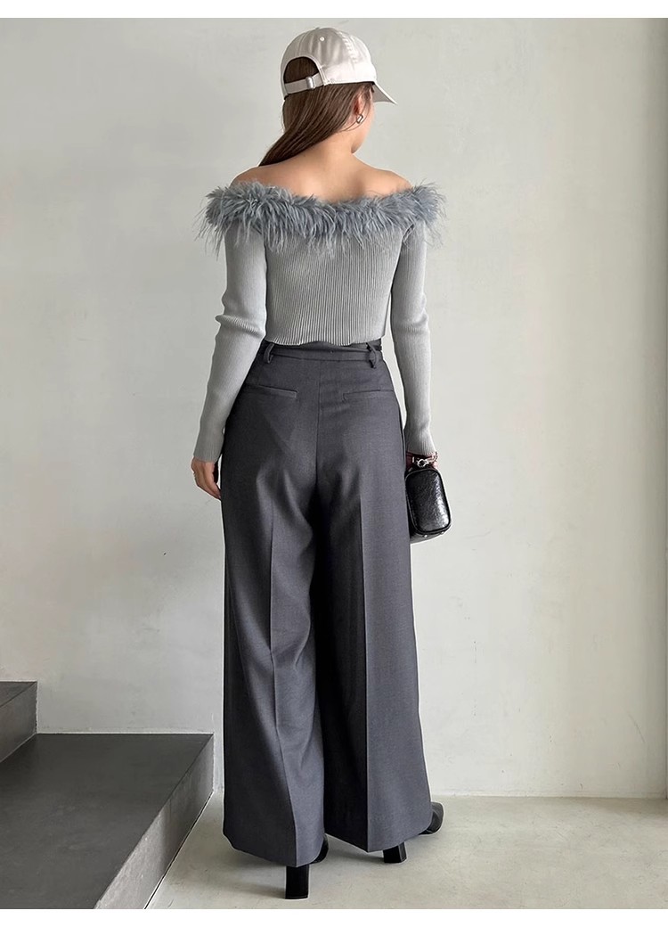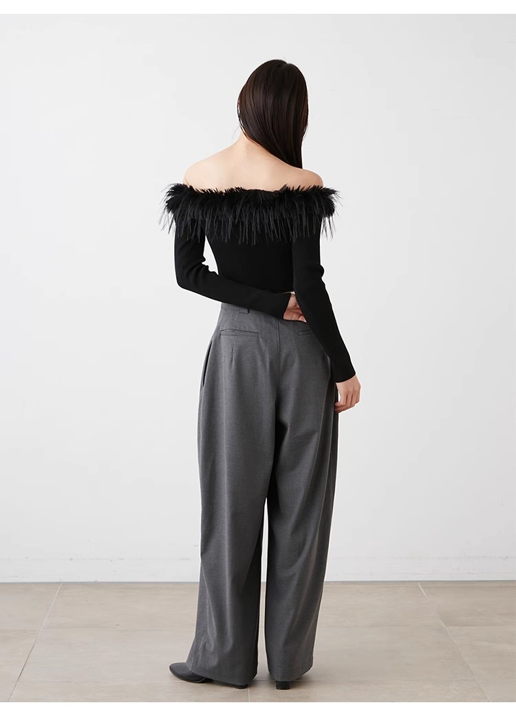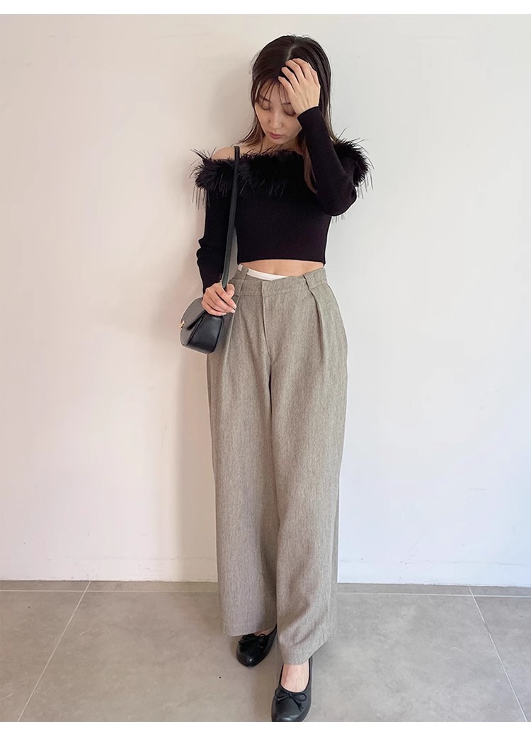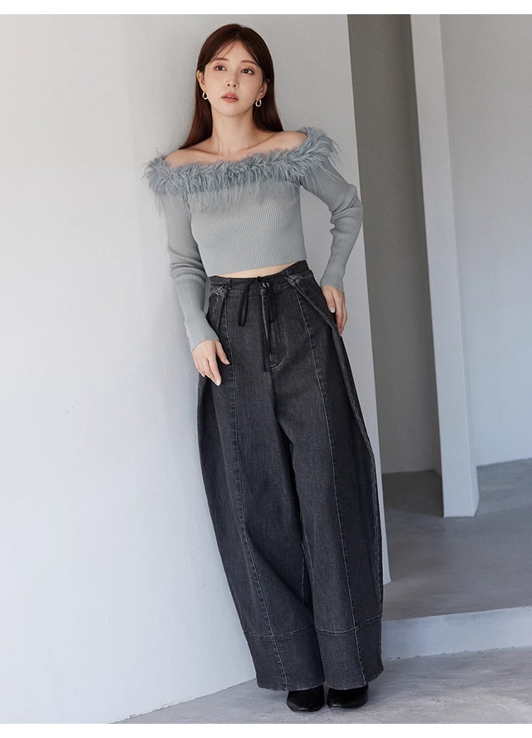ボリューミーなフェイクファーをぐるりとあしらったニットは、一枚で絵になる存在感を発揮。ファーが際立つように、身頃は適度なタイトシルエット&クロップド丈ですっきりまとめました。オフショルによる肌見せで色気も加えることで、かわいくなりすぎずキレよく楽しめるデザインに。ハイウエストパンツなどに合わせるハンサムなスタイリングがおすすめです。