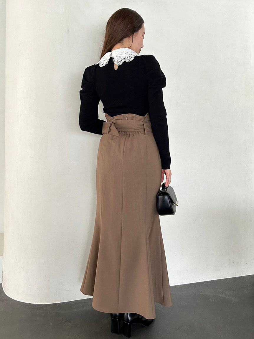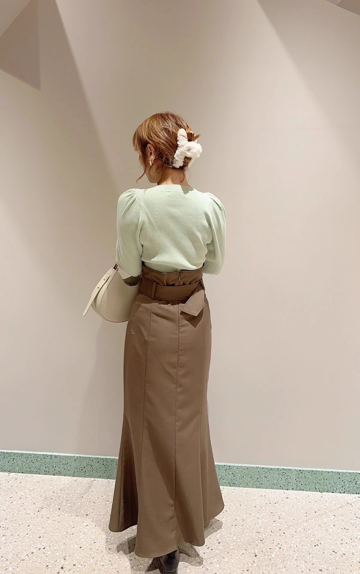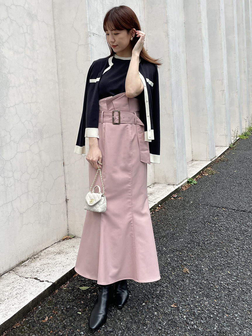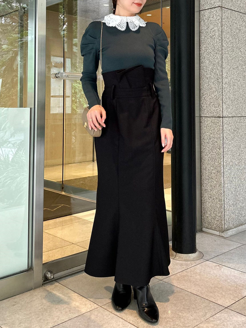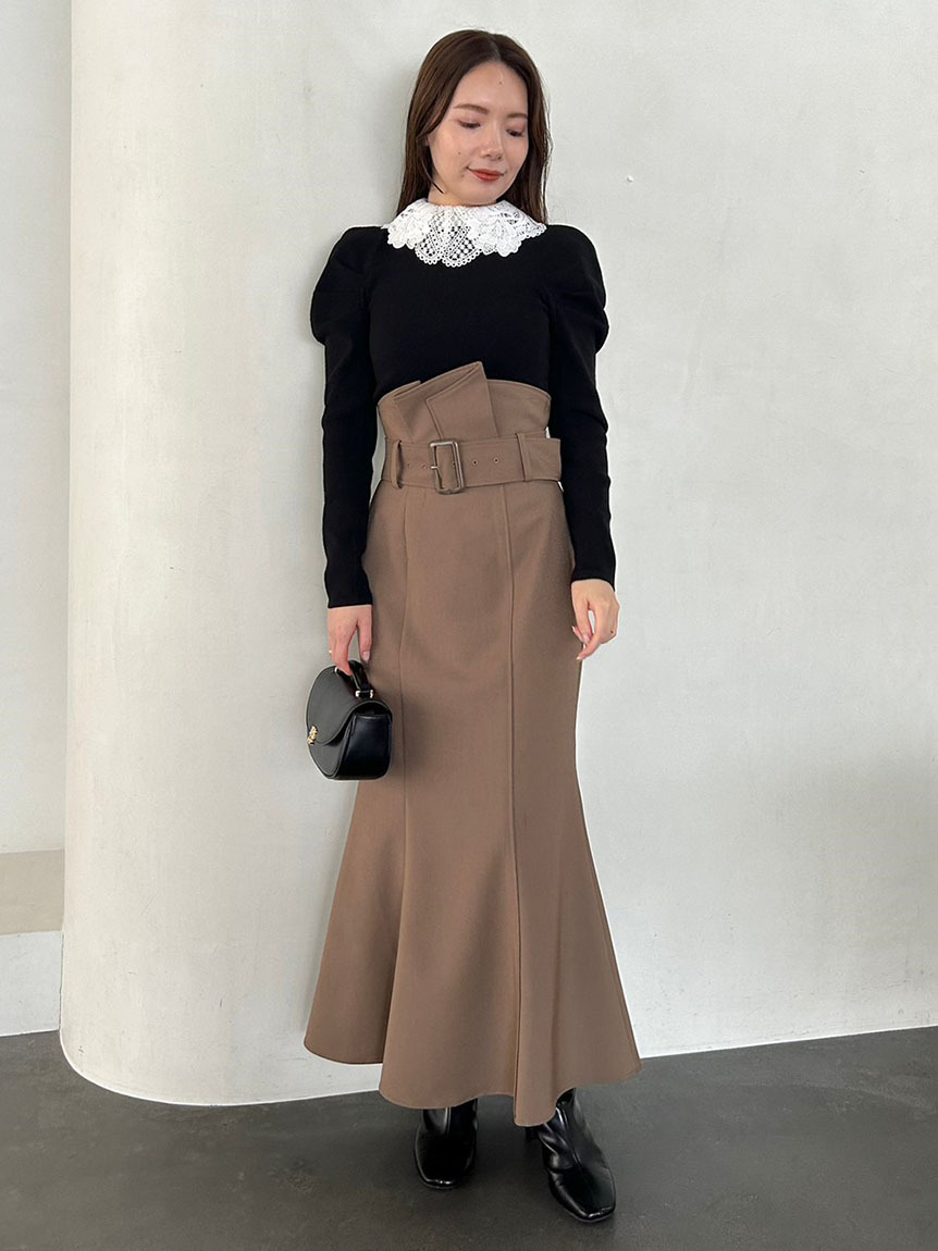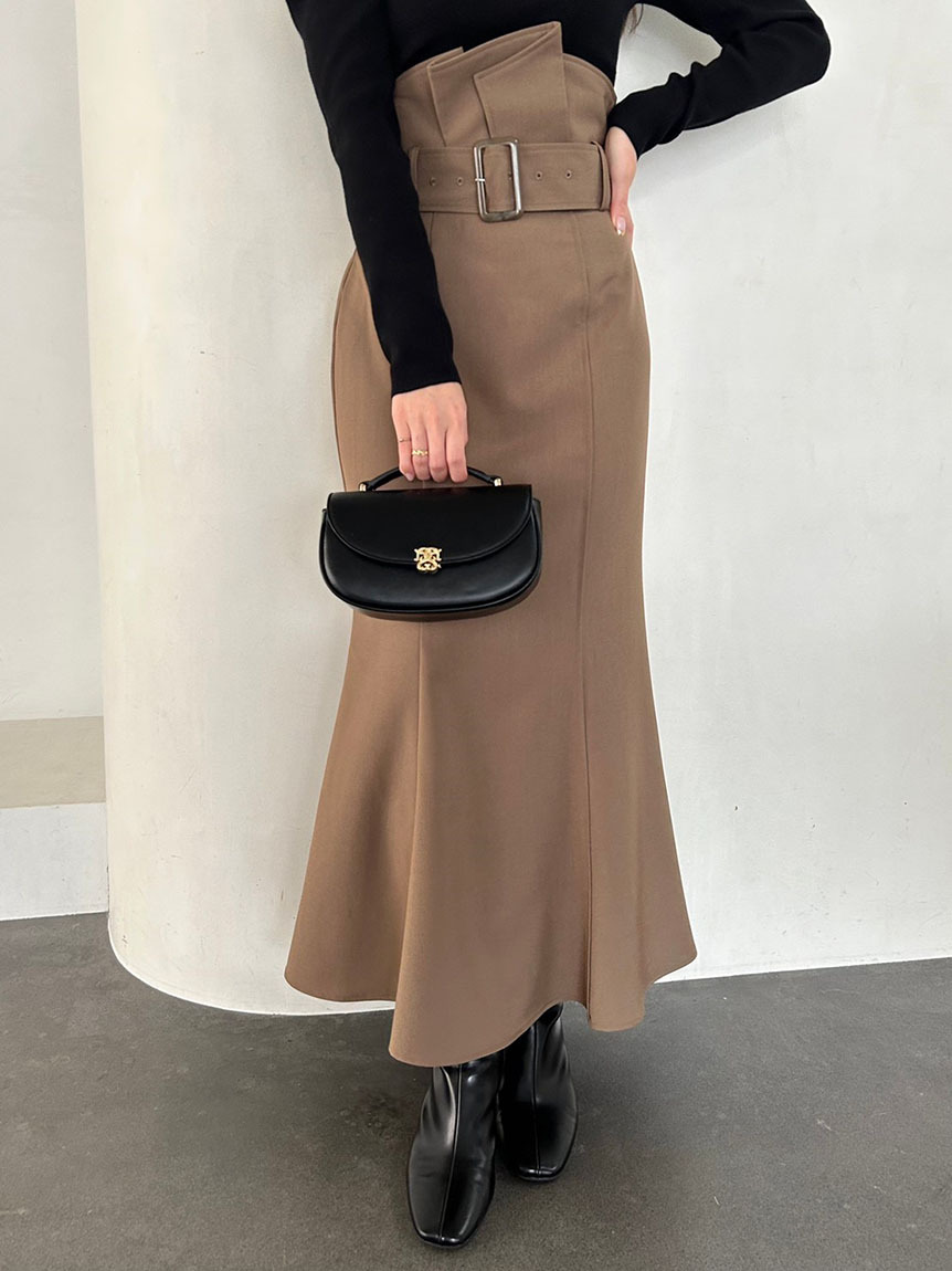 【ワイドベルトとウエストフリルで華やかモードに仕上げたマーメイドスカート】