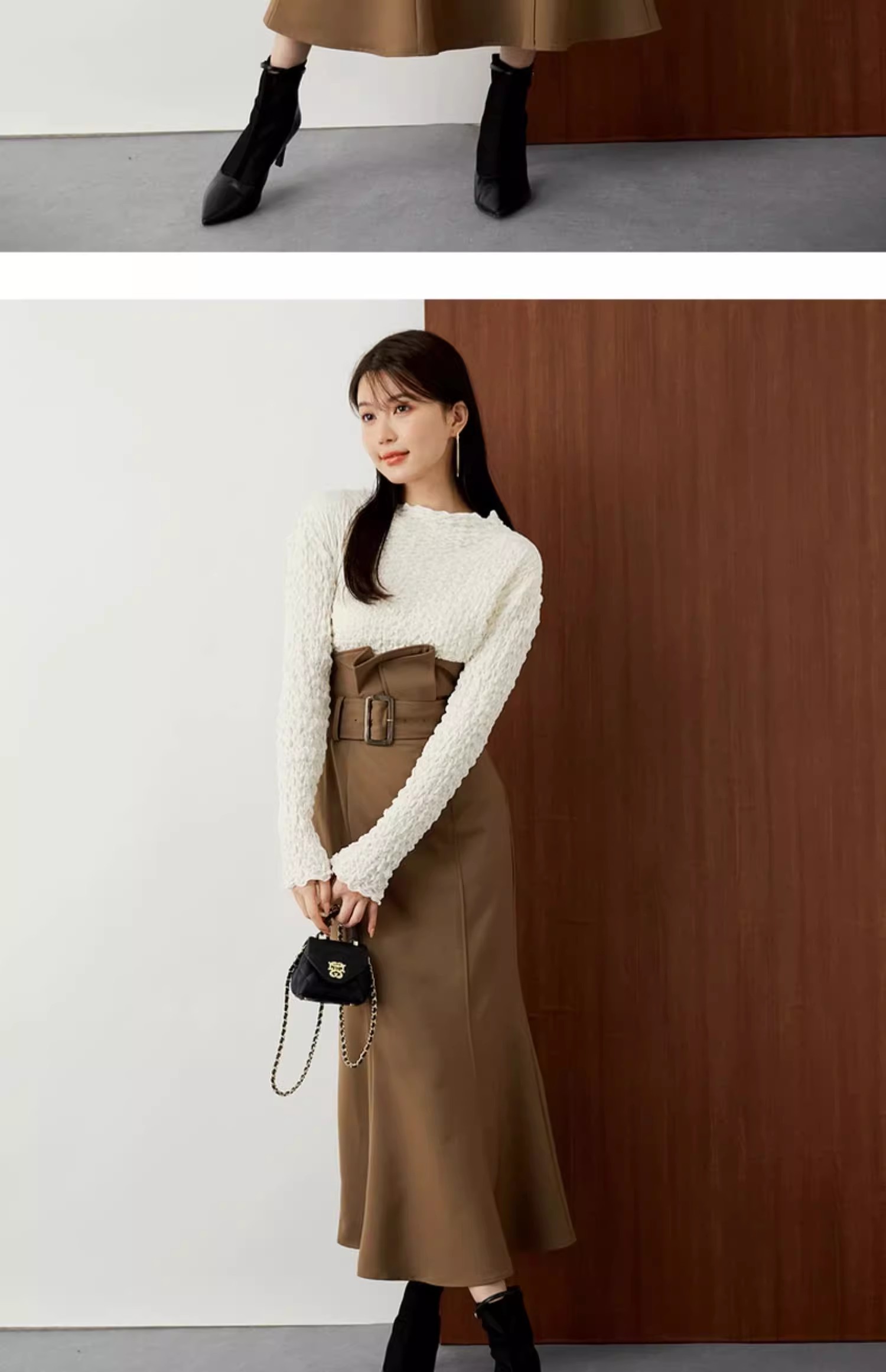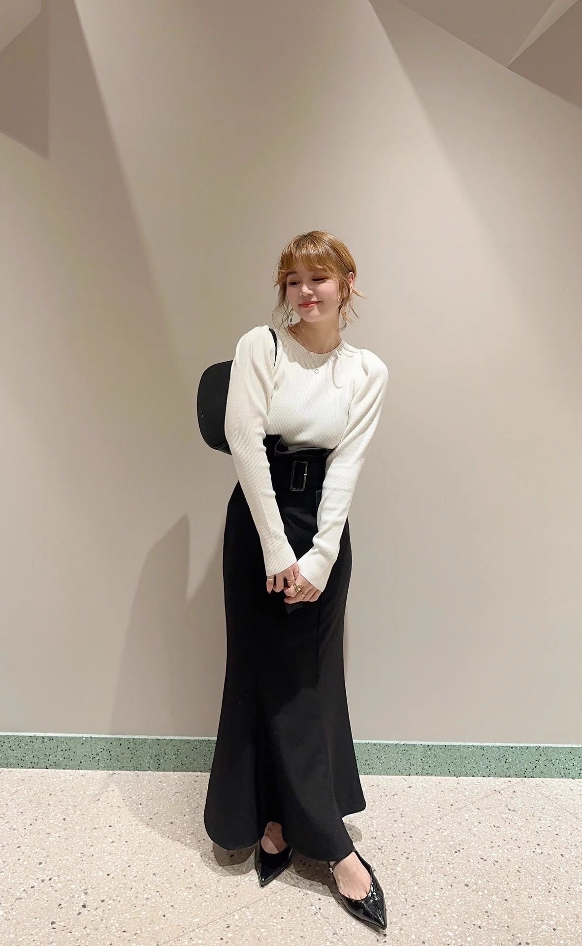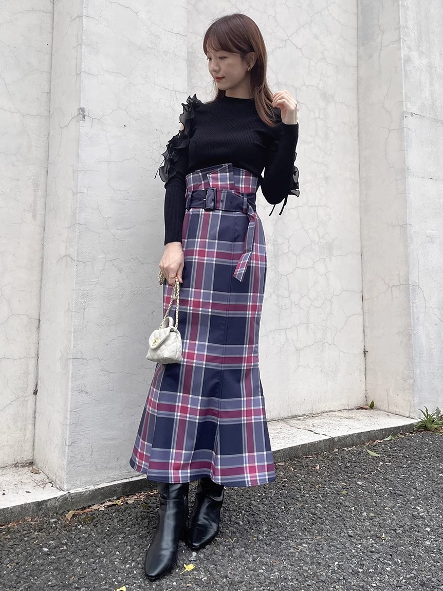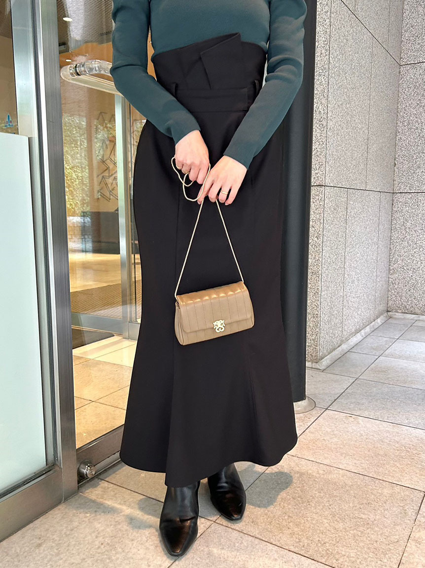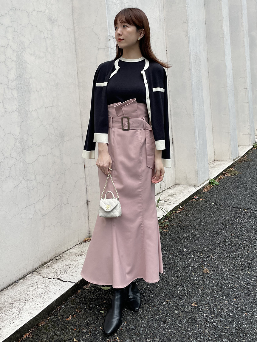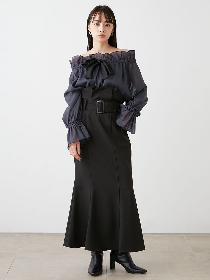 【ワイドベルトとウエストフリルで華やかモードに仕上げたマーメイドスカート】