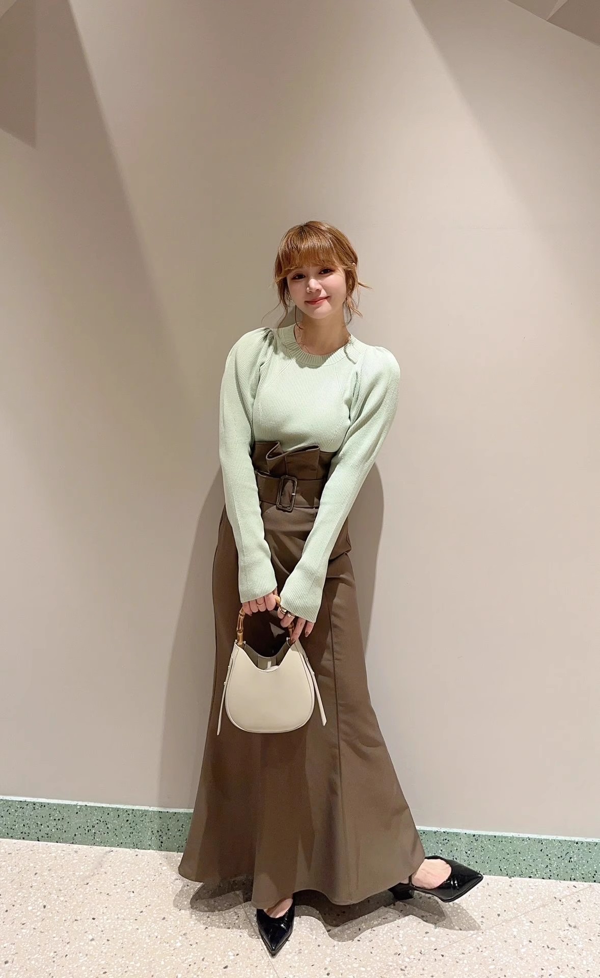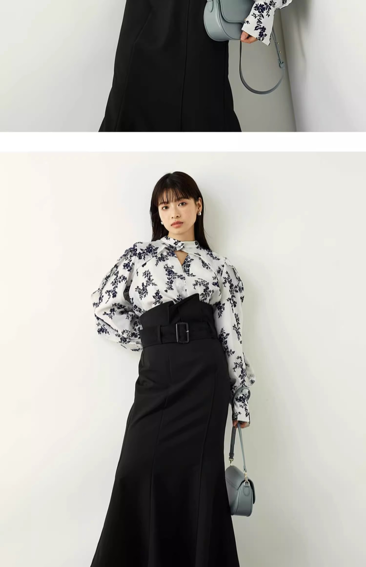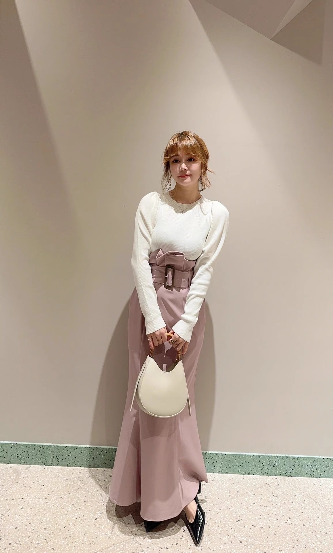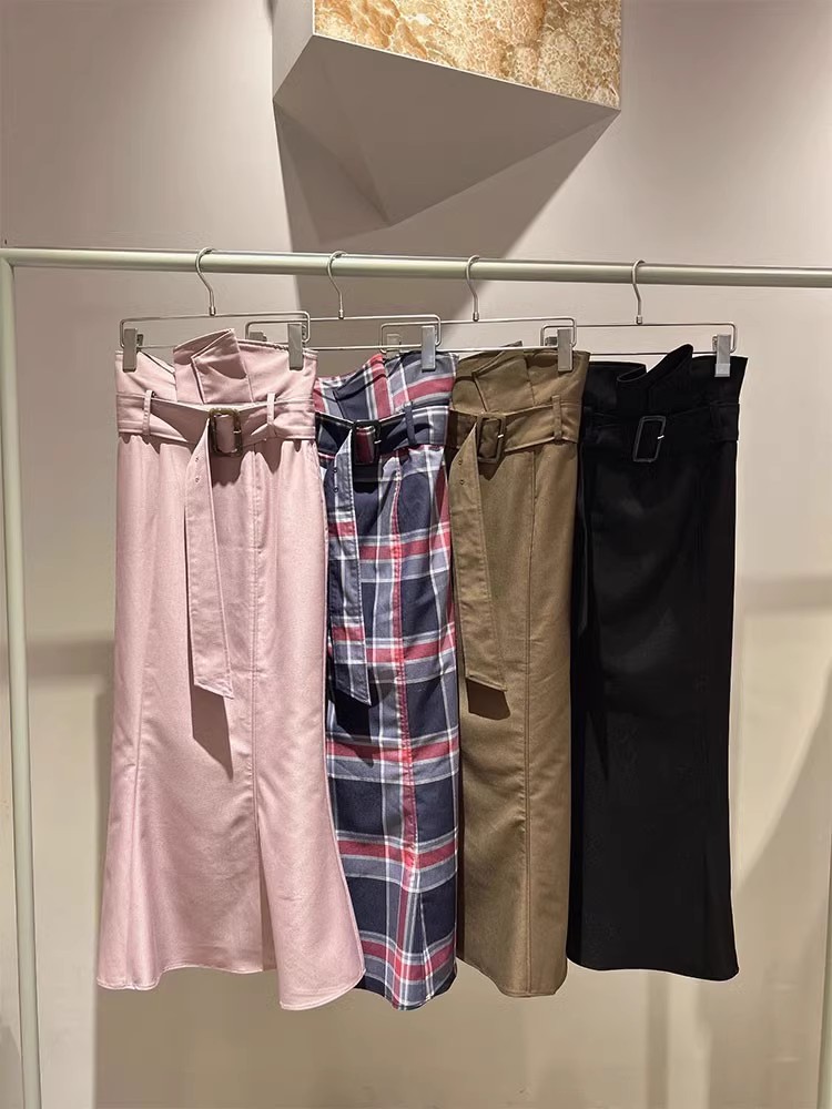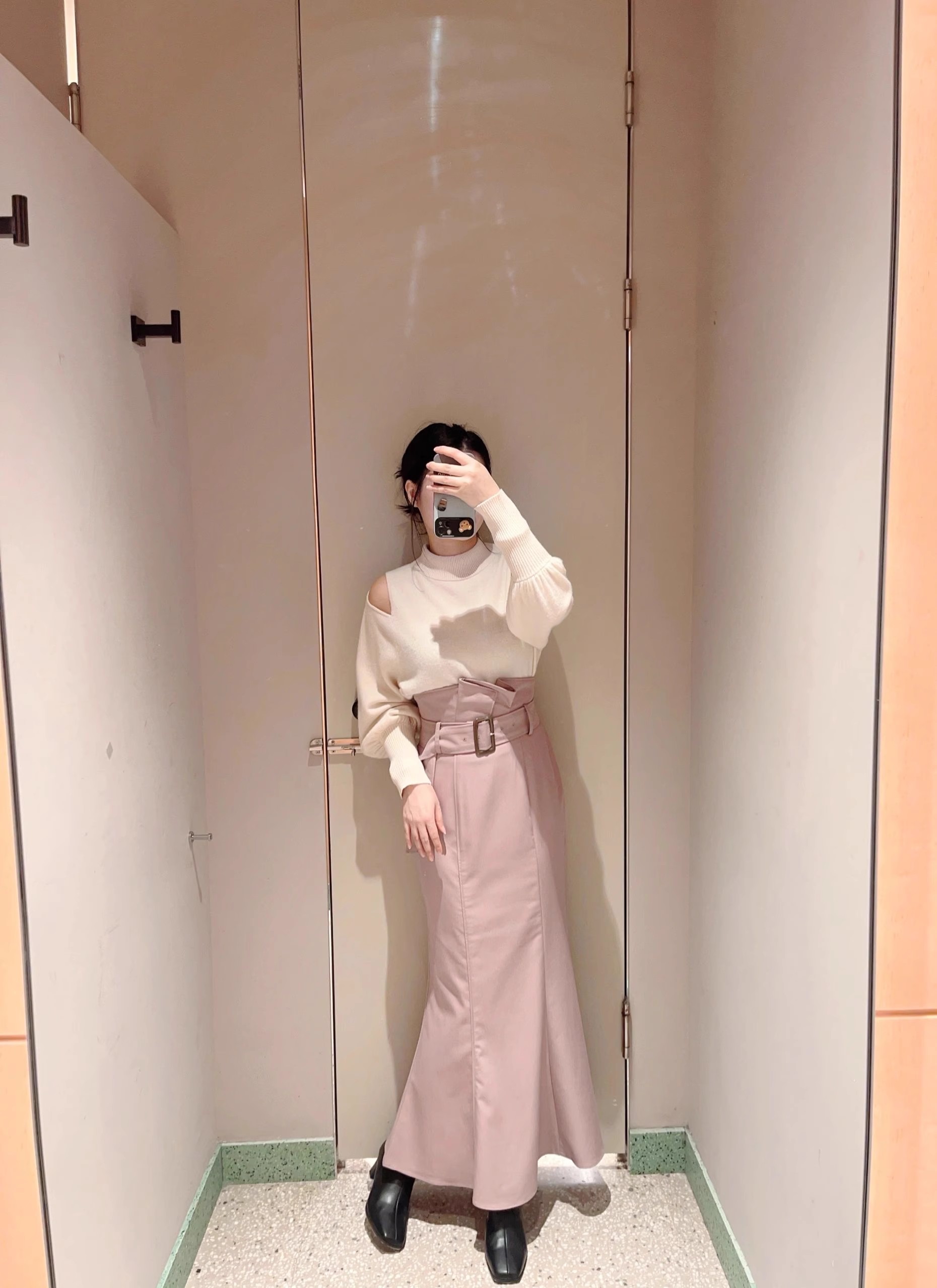 【ワイドベルトとウエストフリルで華やかモードに仕上げたマーメイドスカート】