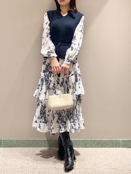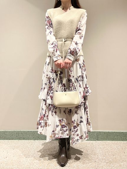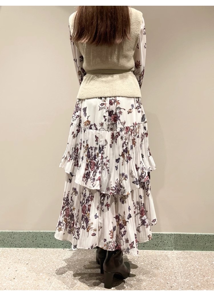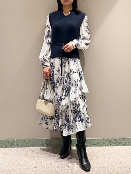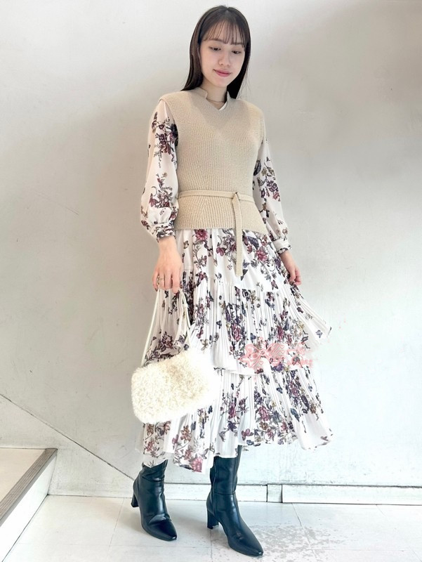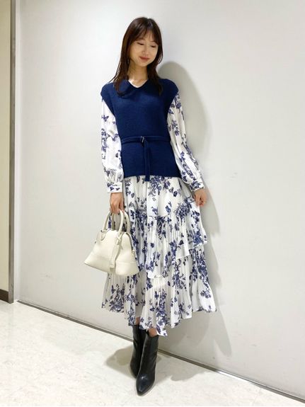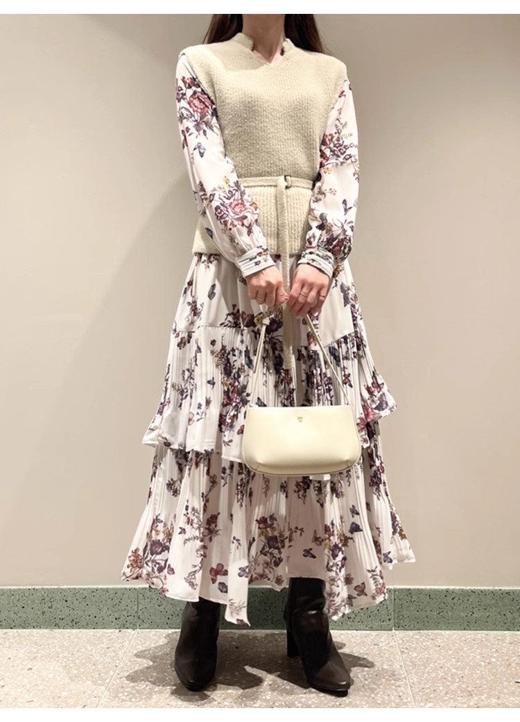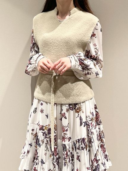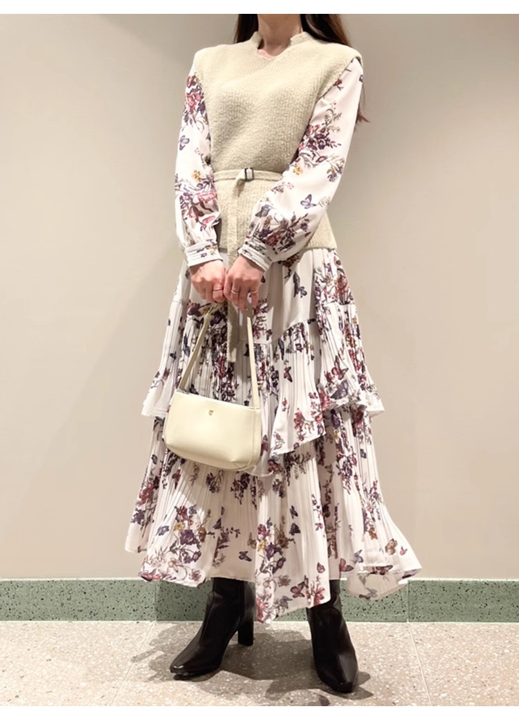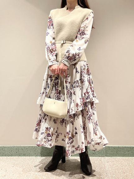 SNIDEL定番のベストレイヤードニットワンピが装い新たに登場しました。今年は、例年より少し毛足のある糸にチェンジした共布ベルト付きベストでコルセット調デザインに。ワンピースは、人気のカラフルなフラワーモチーフに蝶々をランダムに飛ばせたSNIDELオリジナルプリントで華やかに仕立てました。胸下から広がるプリーツティアードデザインも着映えを叶えてくれます。袖口にはタックを施して細かなところまで丁寧に作り込みました。セットではもちろん、それぞれ単品使いも可能です。インナーキャミワンピース付き。
