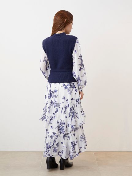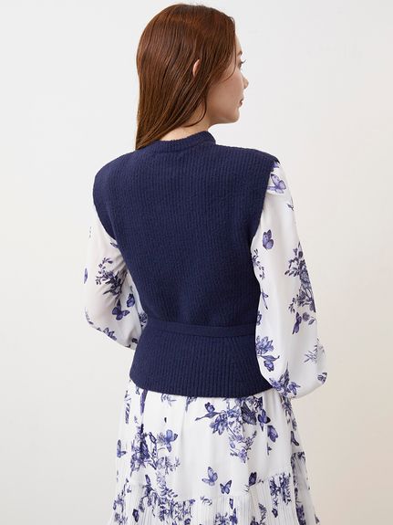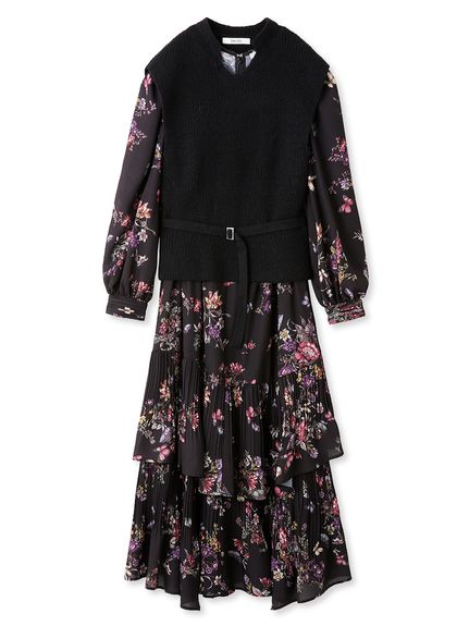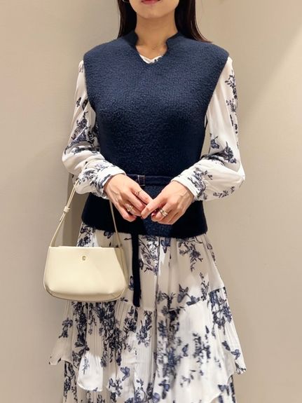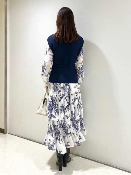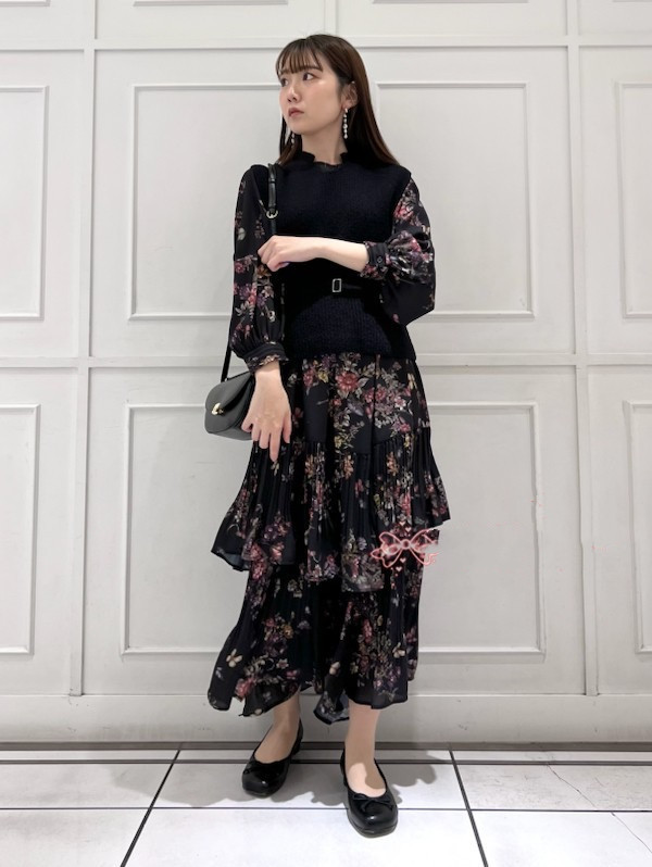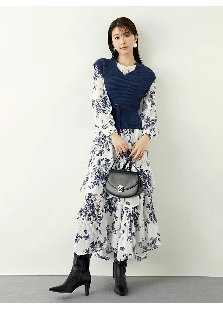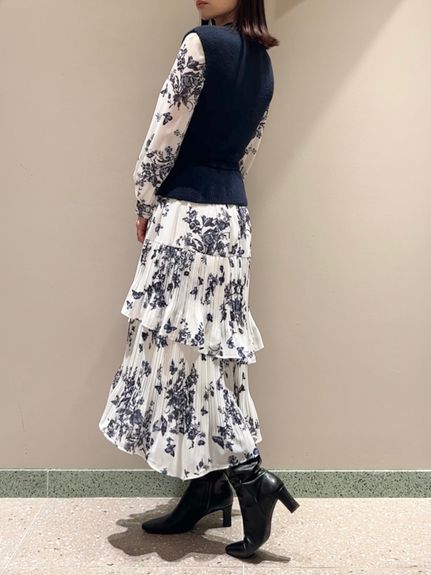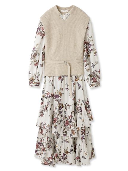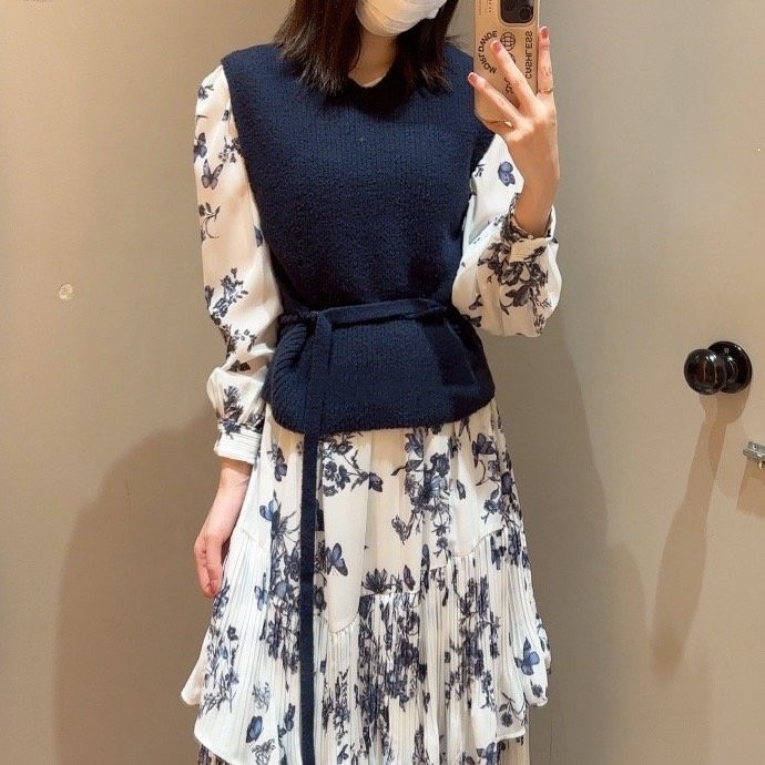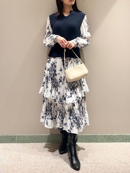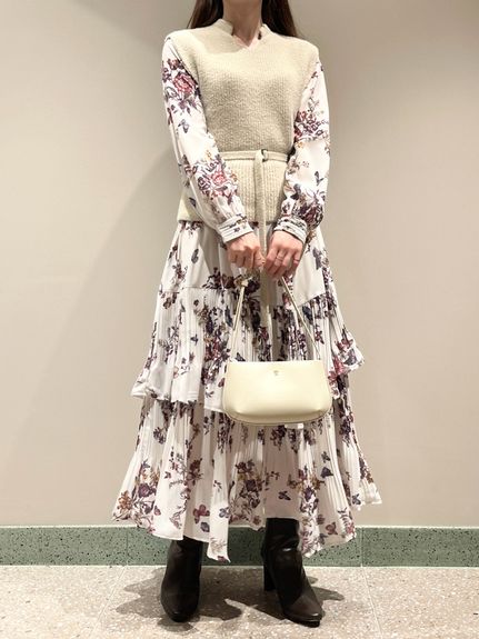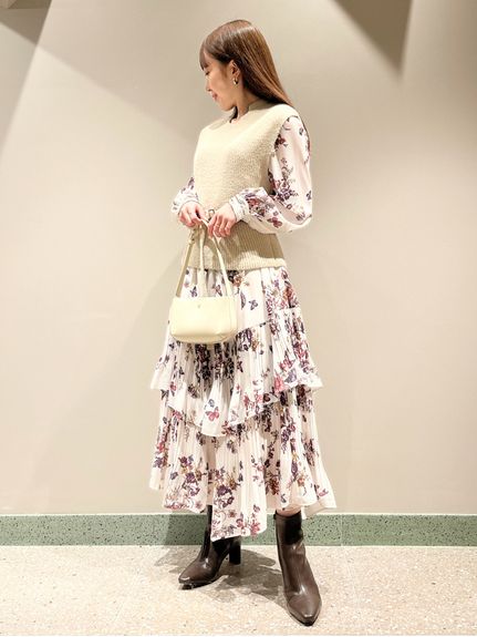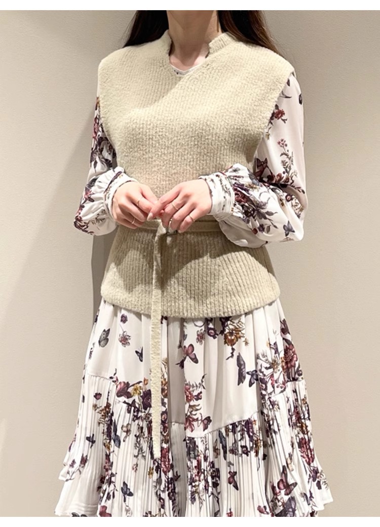 SNIDEL定番のベストレイヤードニットワンピが装い新たに登場しました。今年は、例年より少し毛足のある糸にチェンジした共布ベルト付きベストでコルセット調デザインに。ワンピースは、人気のカラフルなフラワーモチーフに蝶々をランダムに飛ばせたSNIDELオリジナルプリントで華やかに仕立てました。胸下から広がるプリーツティアードデザインも着映えを叶えてくれます。袖口にはタックを施して細かなところまで丁寧に作り込みました。セットではもちろん、それぞれ単品使いも可能です。インナーキャミワンピース付き。