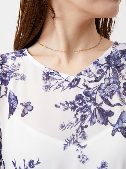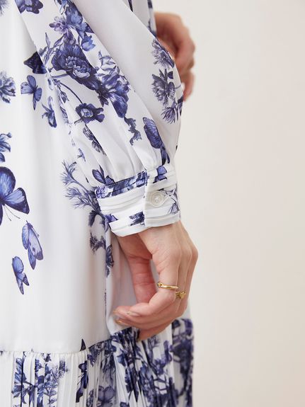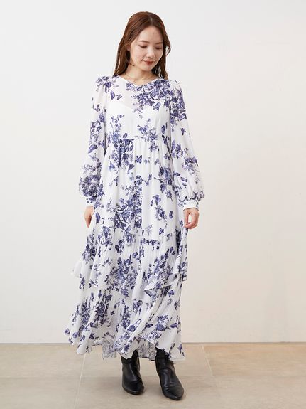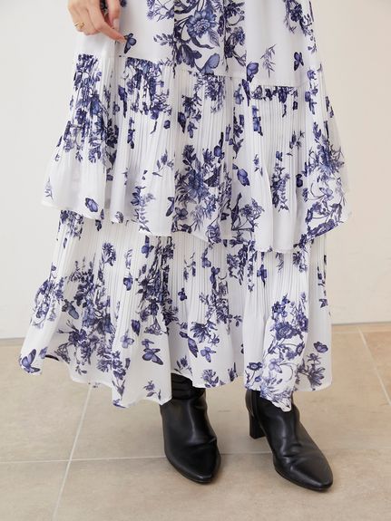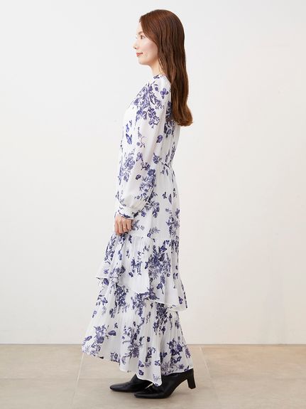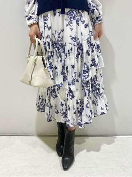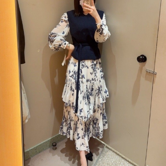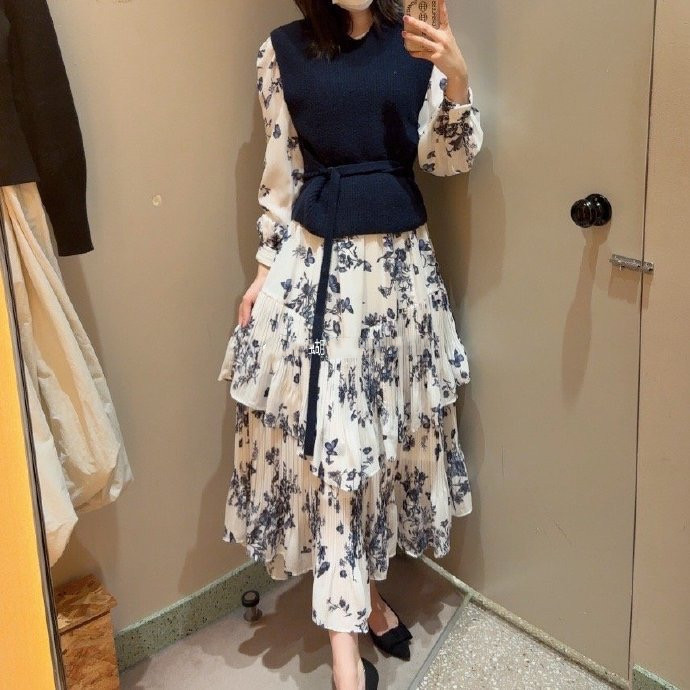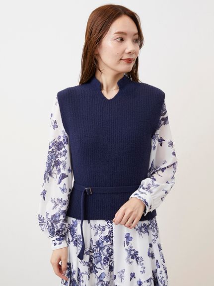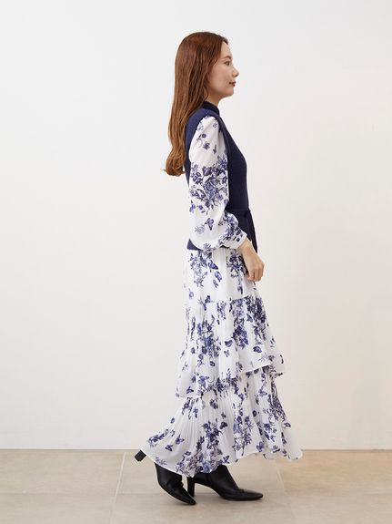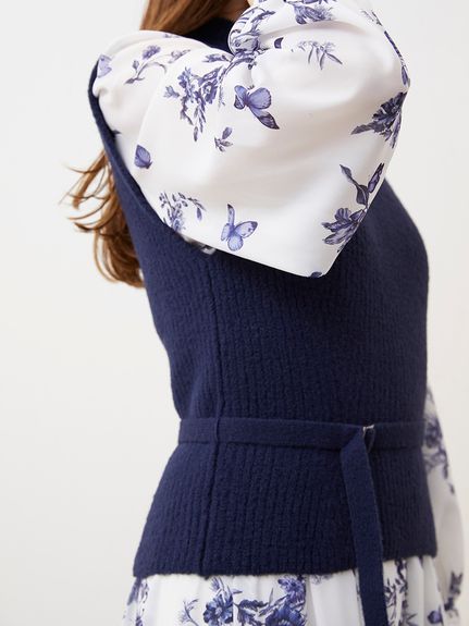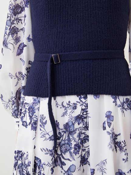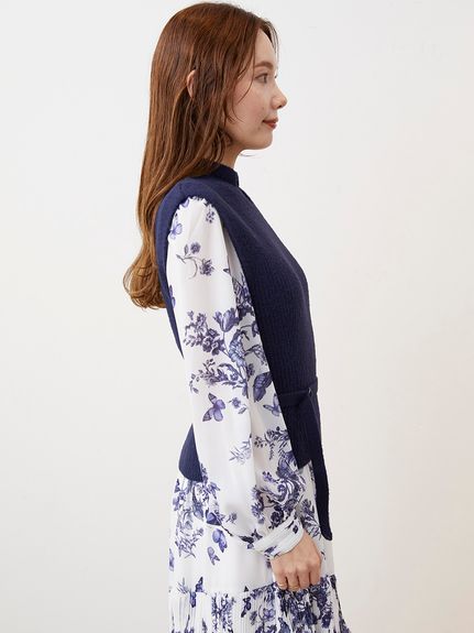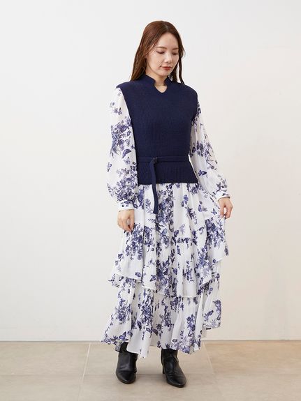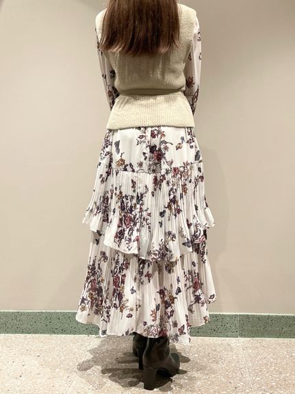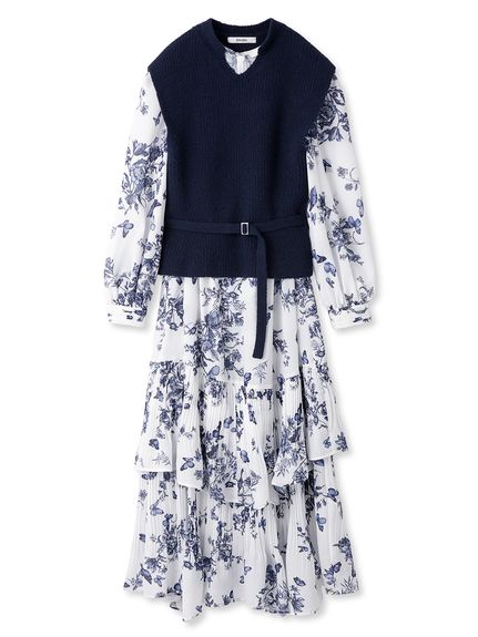 SNIDEL定番のベストレイヤードニットワンピが装い新たに登場しました。今年は、例年より少し毛足のある糸にチェンジした共布ベルト付きベストでコルセット調デザインに。ワンピースは、人気のカラフルなフラワーモチーフに蝶々をランダムに飛ばせたSNIDELオリジナルプリントで華やかに仕立てました。胸下から広がるプリーツティアードデザインも着映えを叶えてくれます。袖口にはタックを施して細かなところまで丁寧に作り込みました。セットではもちろん、それぞれ単品使いも可能です。インナーキャミワンピース付き。