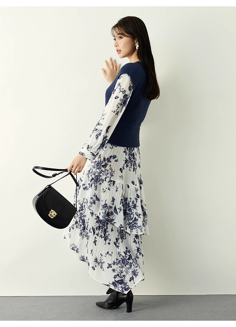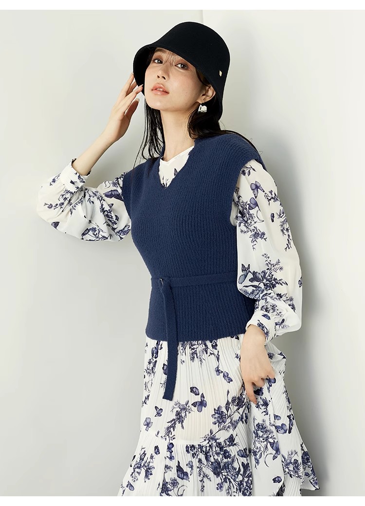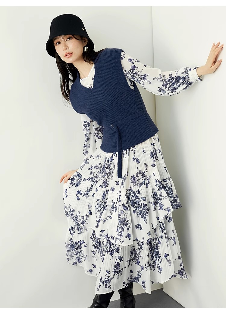 ベストは起毛感のあるニット素材、ワンピースはなめらかで落ち感のある素材を使用しました。花柄のきれいな色合いが引き立つブラック、女性らしさたっぷりなライトベージュ、大人っぽくてシックなネイビーの3色展開です。