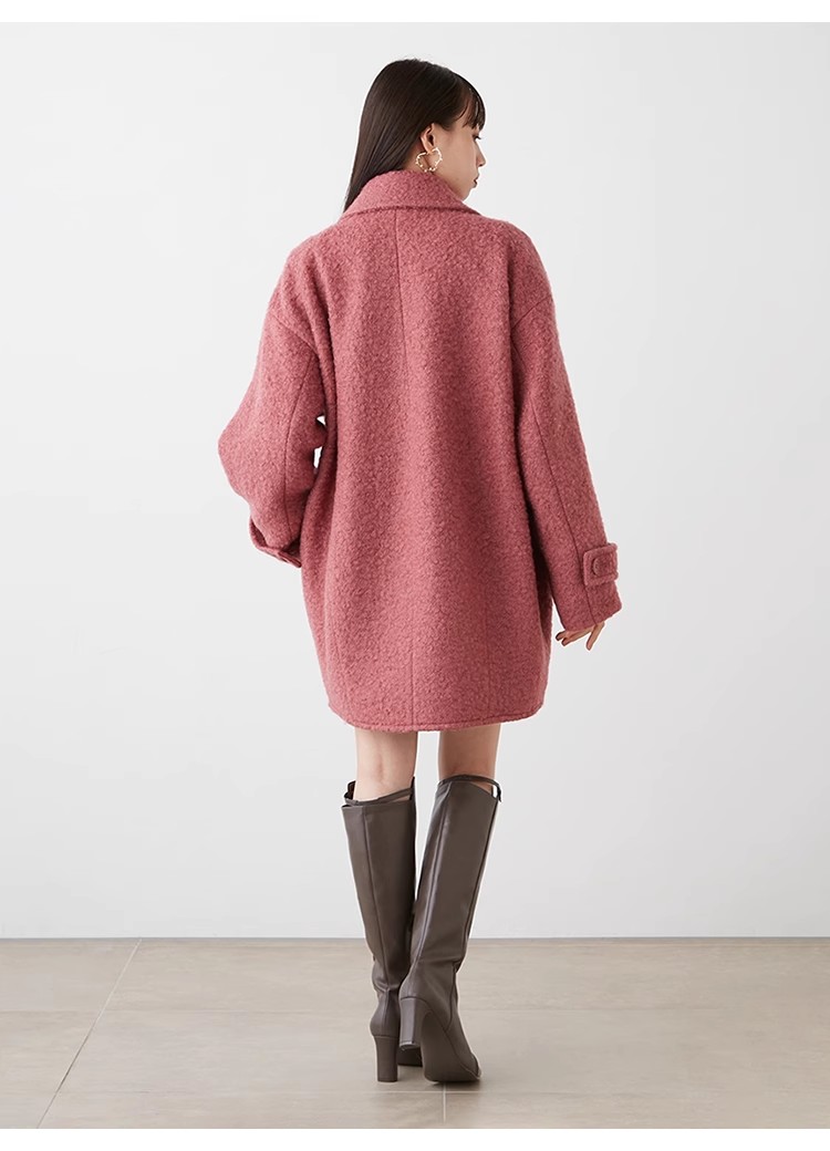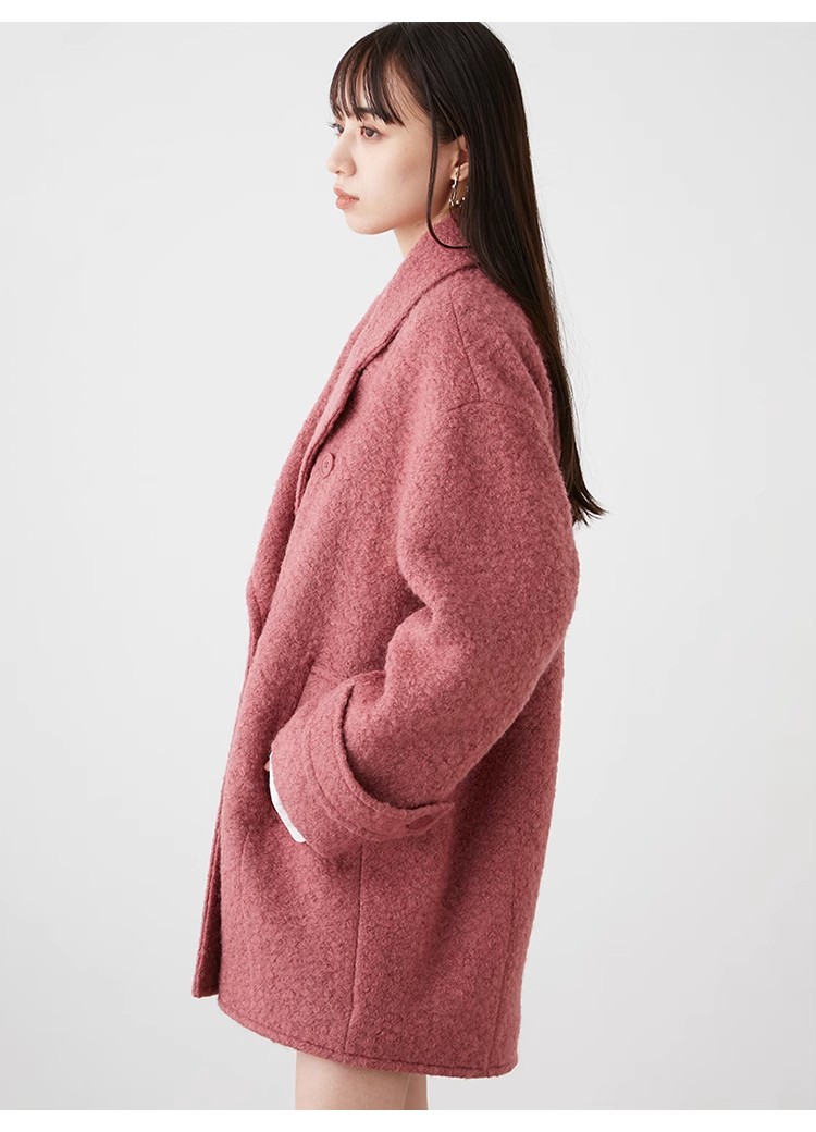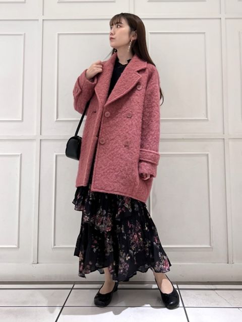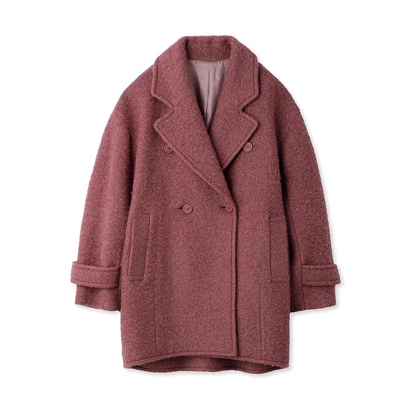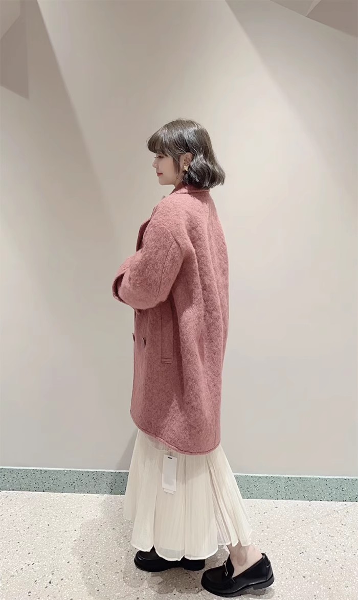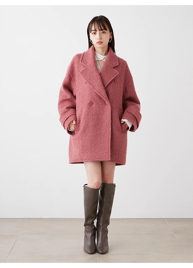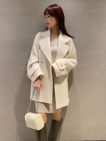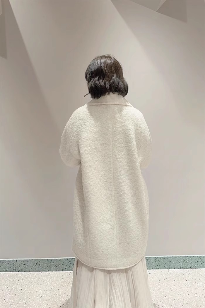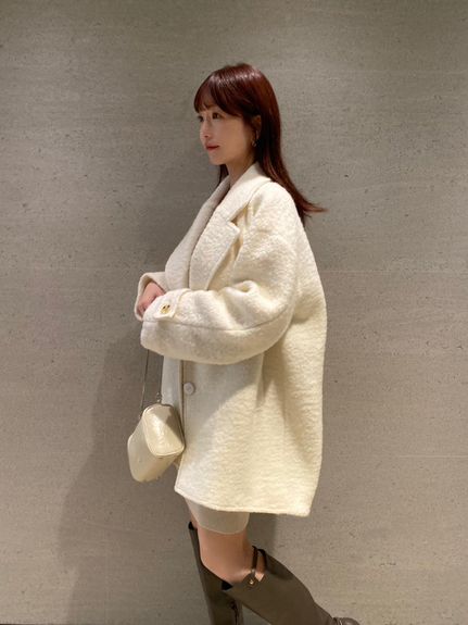 昨年大人気だったコートがリバイバル。構築的なコクーンフォルムが作るカーヴィなシルエットは、サッと羽織るだけでも絵になる存在感を発揮。やや長めのレングスと、バックスタイルのたっぷりとしたボリュームも印象的に見せる仕掛けに。温かみのあるボア素材は、少しカールがかったニュアンスのある表情。ほっこり見せず、洒落感のある雰囲気へと導いてくれます。べっ甲風のダブルボタンもひねりの効いたアクセントに。