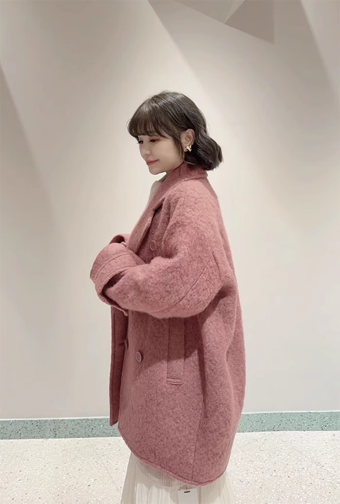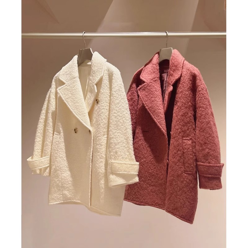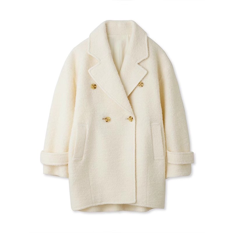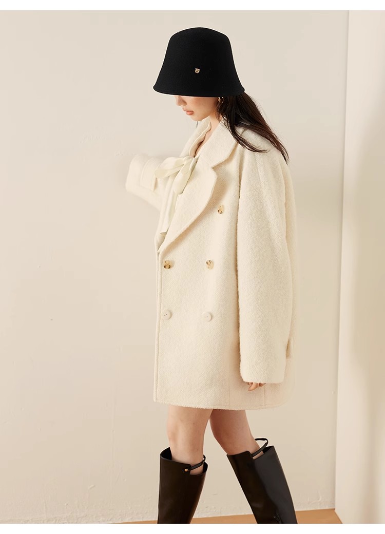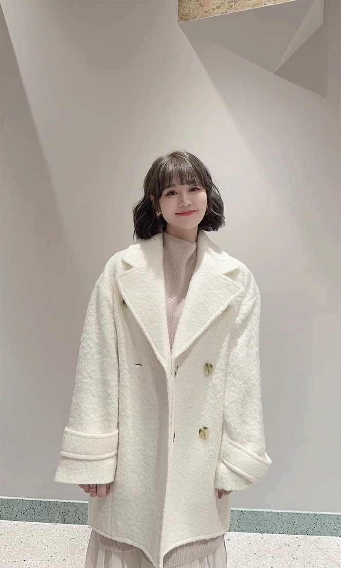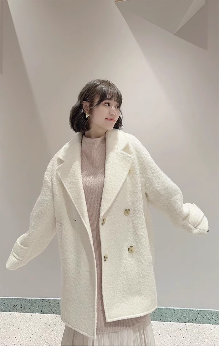昨年大人気だったコートがリバイバル。構築的なコクーンフォルムが作るカーヴィなシルエットは、サッと羽織るだけでも絵になる存在感を発揮。やや長めのレングスと、バックスタイルのたっぷりとしたボリュームも印象的に見せる仕掛けに。温かみのあるボア素材は、少しカールがかったニュアンスのある表情。ほっこり見せず、洒落感のある雰囲気へと導いてくれます。べっ甲風のダブルボタンもひねりの効いたアクセントに。