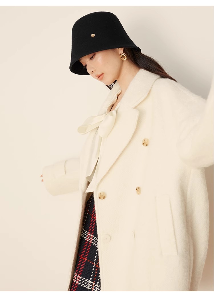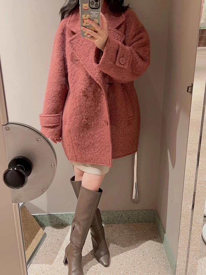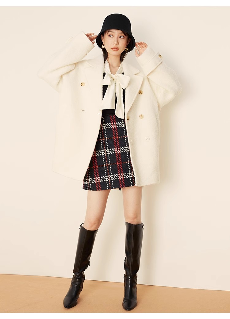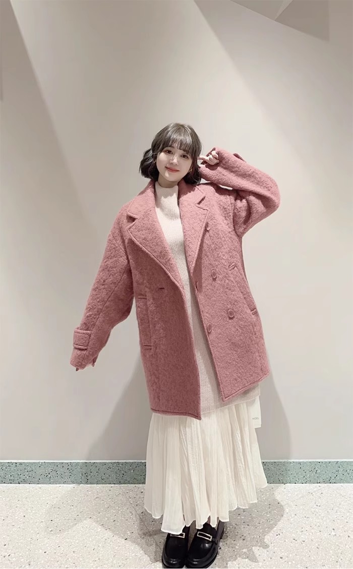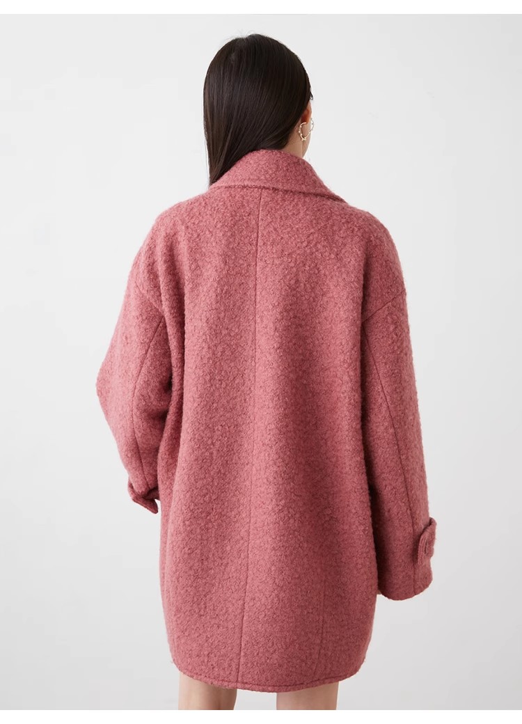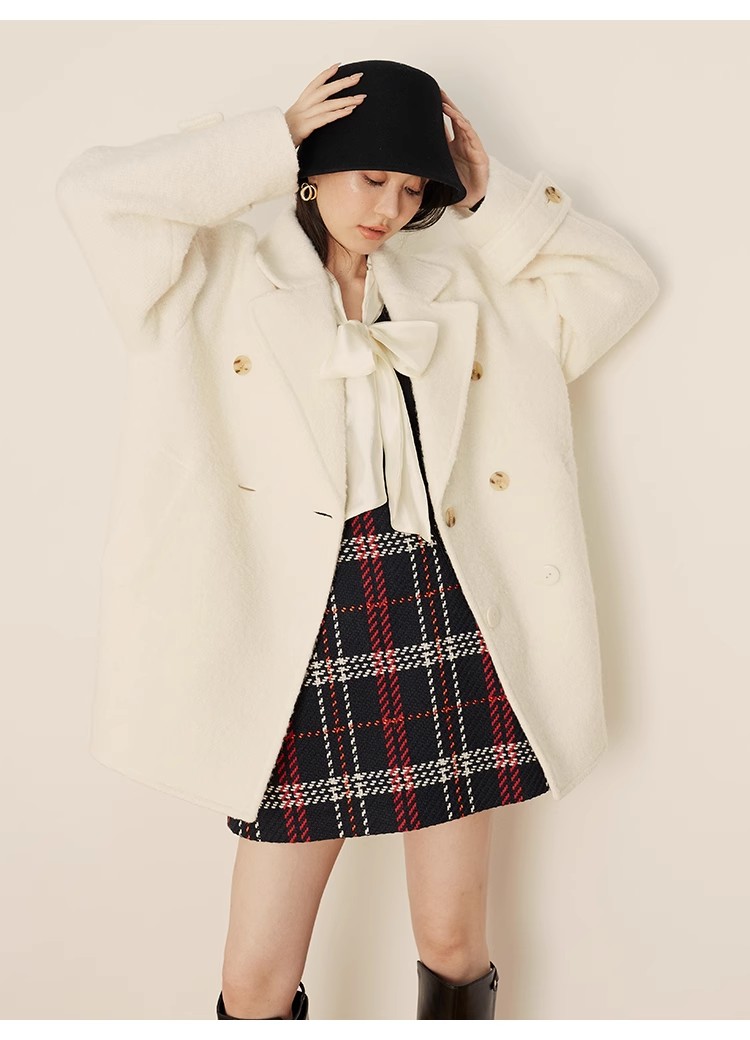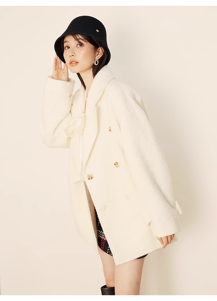 昨年大人気だったコートがリバイバル。構築的なコクーンフォルムが作るカーヴィなシルエットは、サッと羽織るだけでも絵になる存在感を発揮。やや長めのレングスと、バックスタイルのたっぷりとしたボリュームも印象的に見せる仕掛けに。温かみのあるボア素材は、少しカールがかったニュアンスのある表情。ほっこり見せず、洒落感のある雰囲気へと導いてくれます。べっ甲風のダブルボタンもひねりの効いたアクセントに。