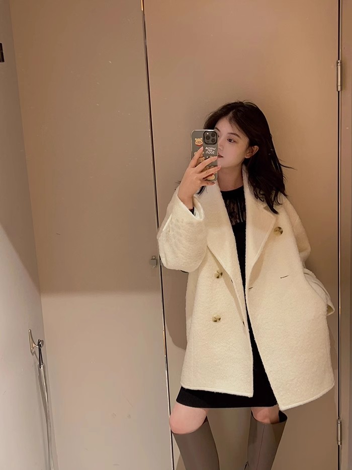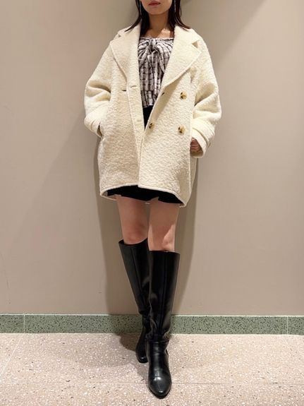 【丸みを帯びたコクーンボアコートでほんのりモードな表情に】