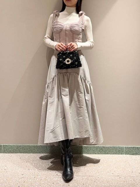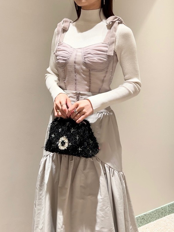 ビスチェは透明感と光沢感のある生地でニュアンスたっぷりに。ニットはなめらかでもちっとした質感です。ピンクビスチェのアイボリー、ブルービスチェのブラック、同色ビスチェのブラウンの3色でお作りしました。
