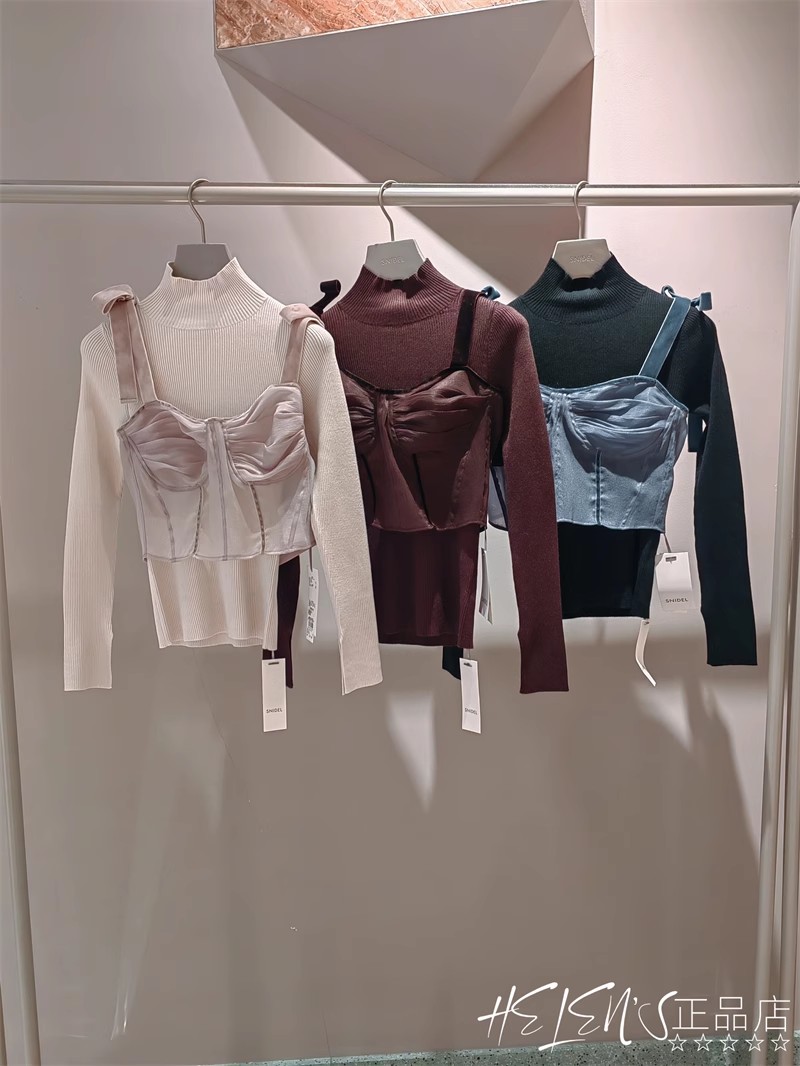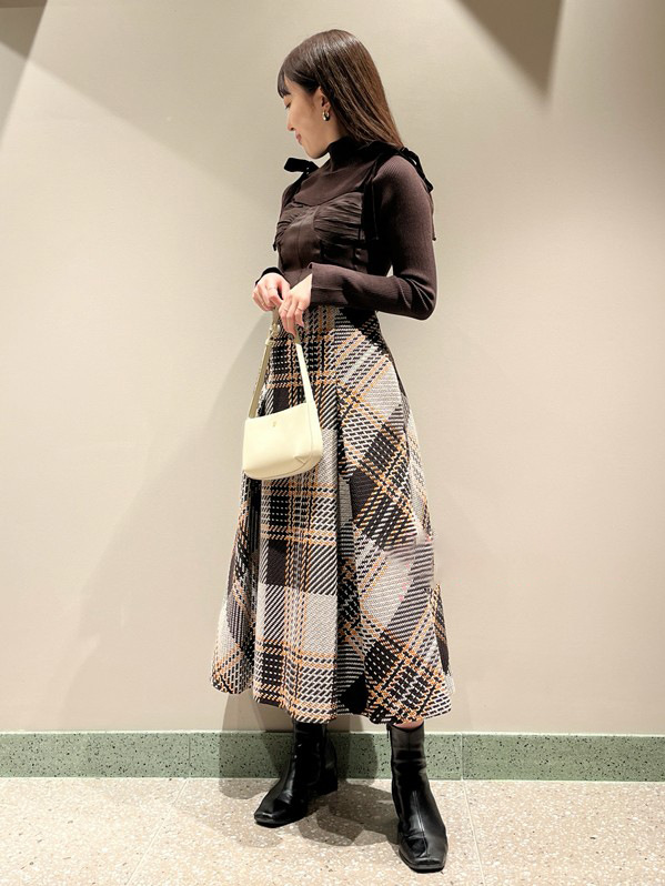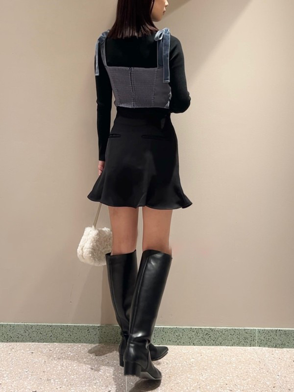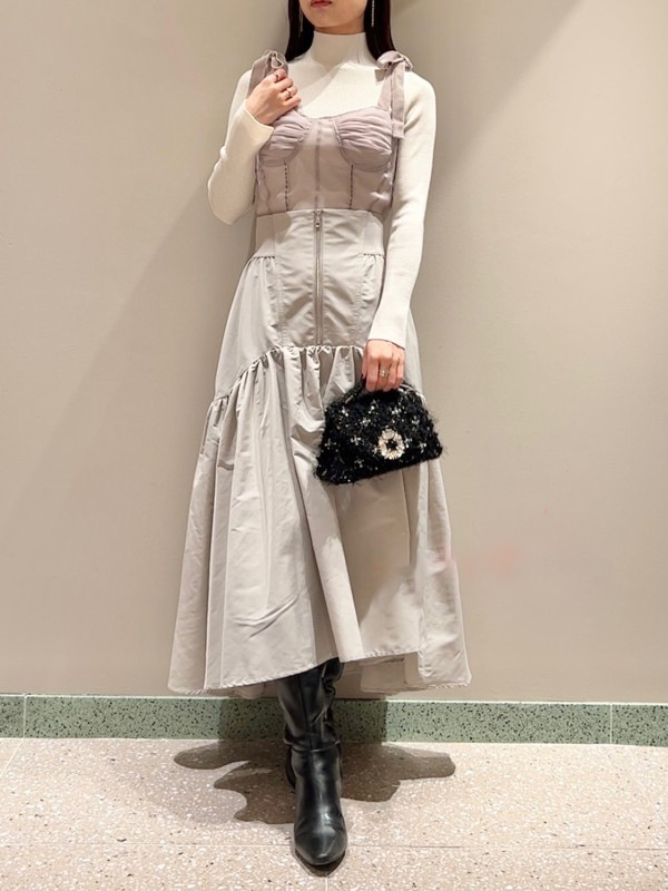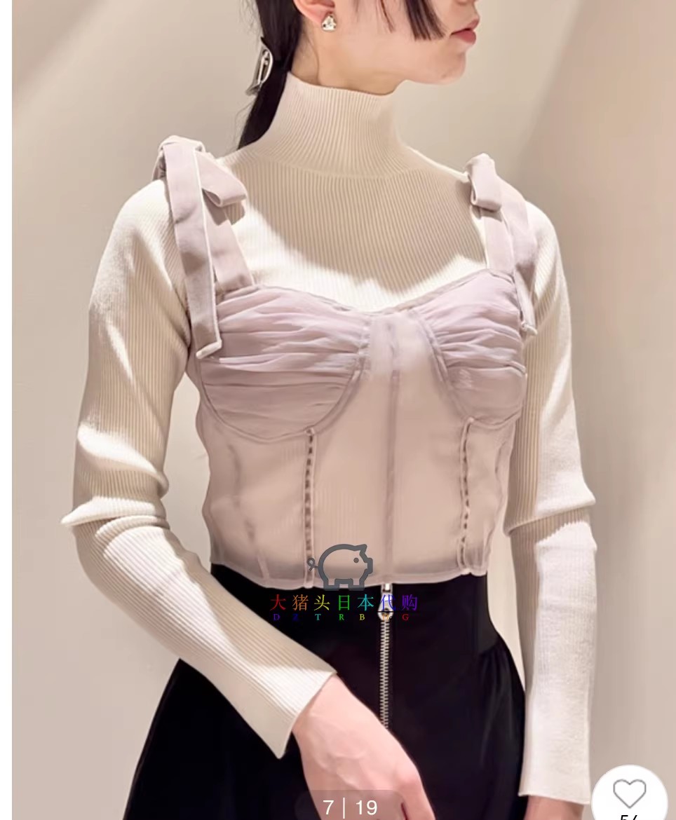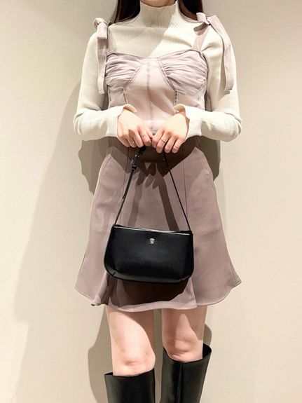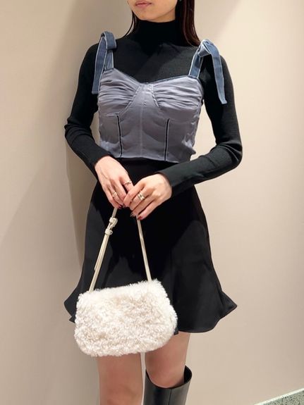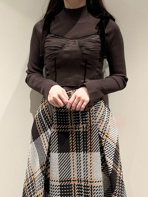 キャミビスチェ×ニットプルオーバーの今っぽいレイヤードを楽しめるセットアイテムです。ビスチェはコルセット風デザインがトレンドライク。身頃は光沢のあるシアー素材、肩紐はベロアリボンにして、質感にコントラストを付けました。ベロアリボンになっているのでお好みで着丈の微調整が可能です。存在感のあるビスチェを受け止めるのは、シンプルなリブニット。コンパクトなシルエットとボトルネックで上半身をきれいに見せてくれます。それぞれ単品使いも可能。今シーズンは、スカショーパン合わせがイチオシです。