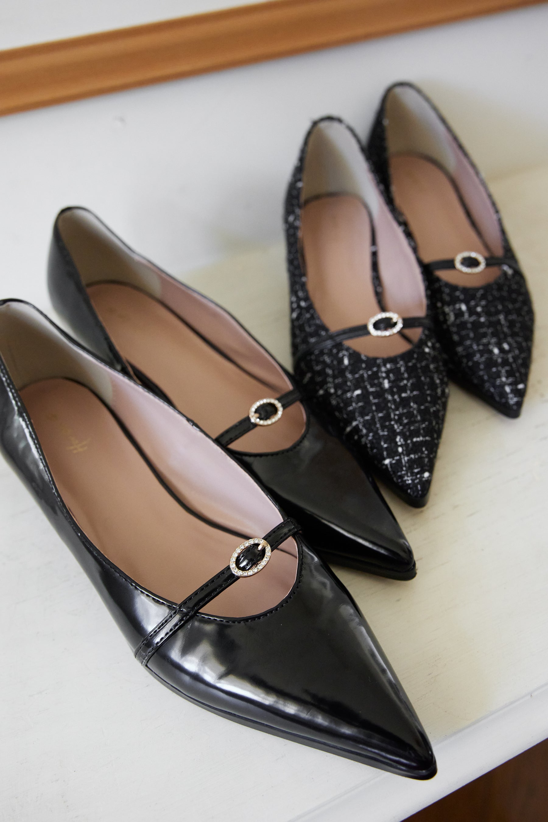 ツイードとエナメル調のヴィーガンレザーのクラシックな2素材でご用意いたしました。