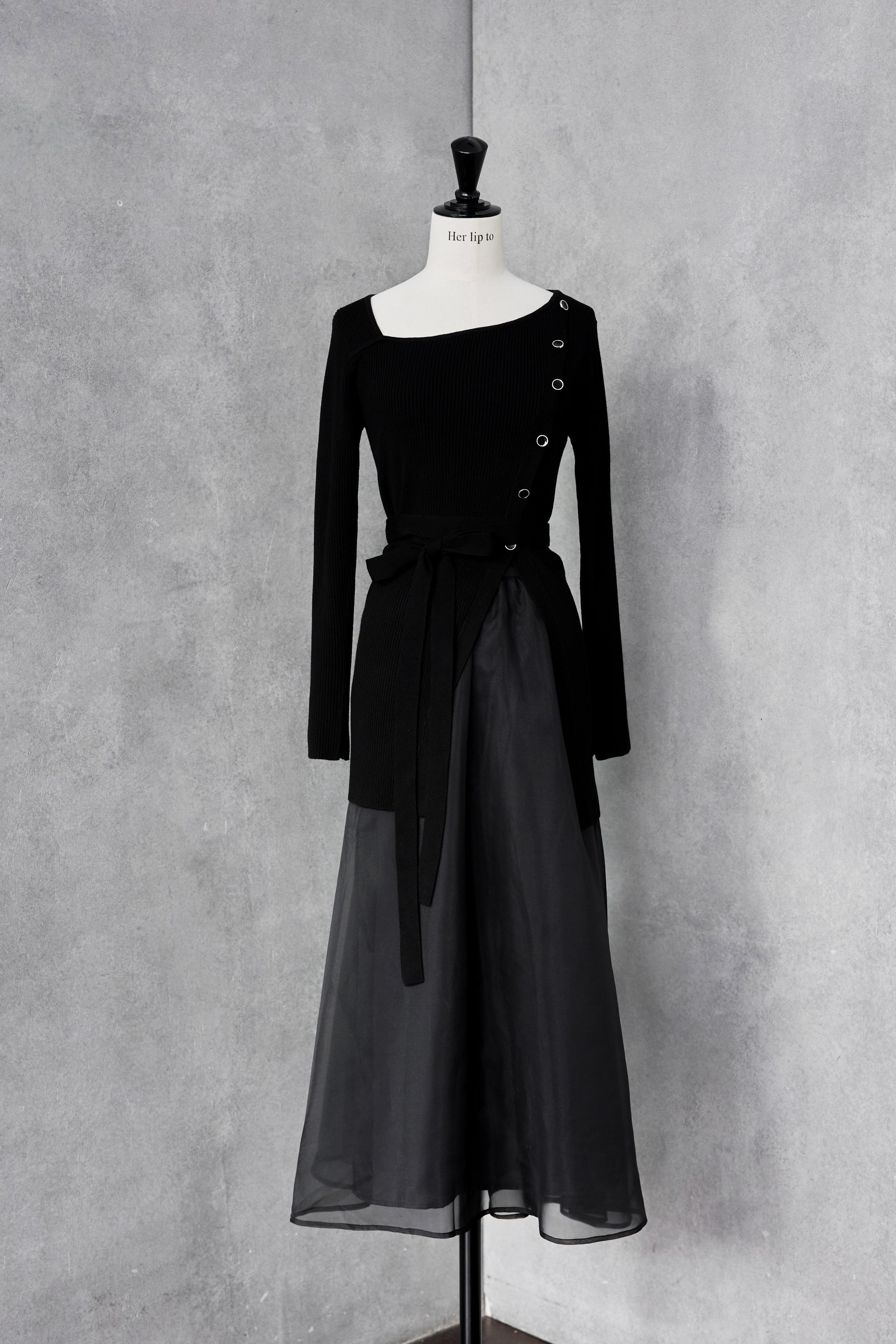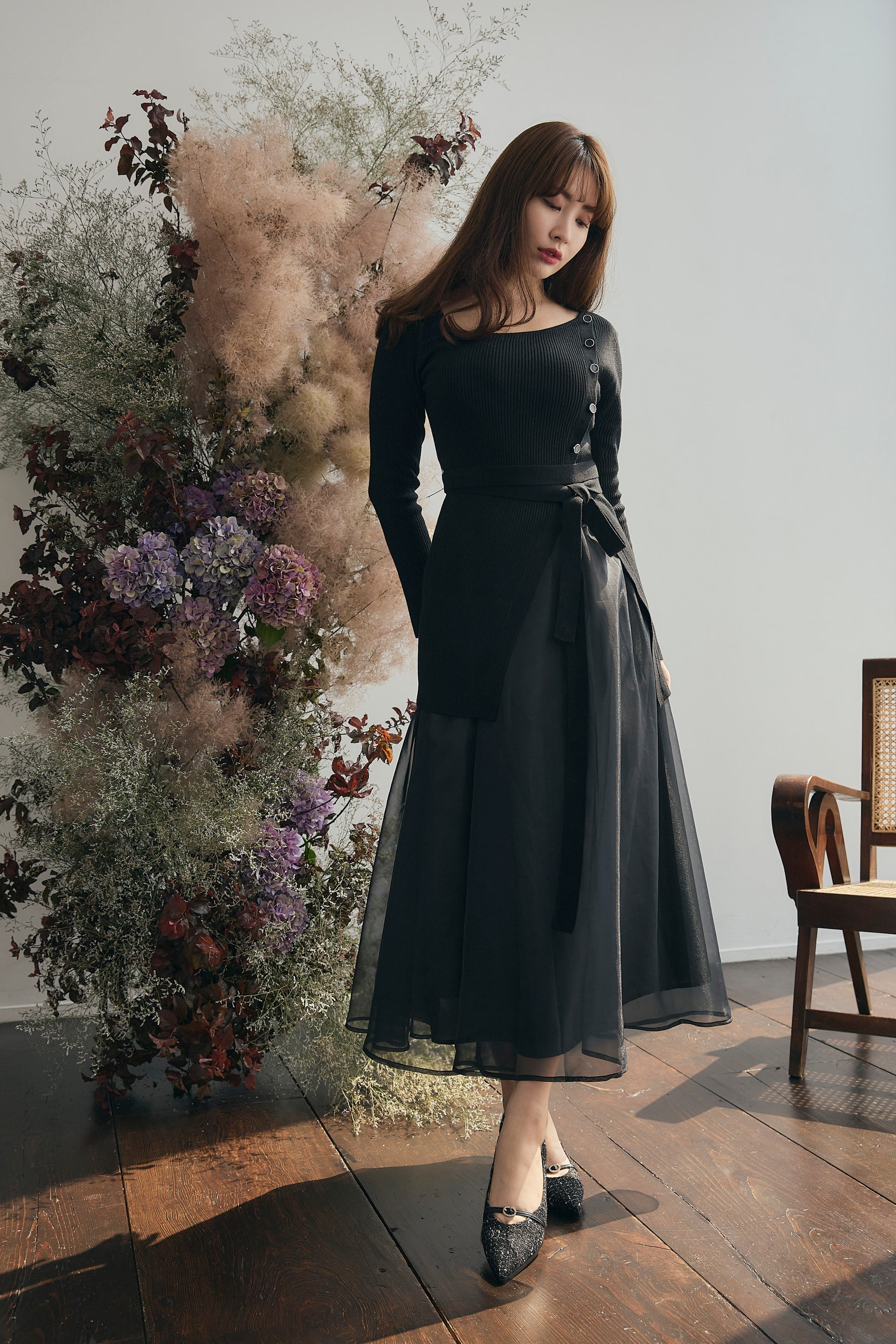 ボリュームのあるスカートとタイトなトップスを合わせることで、よりエレガントさが際立つアイテムです。