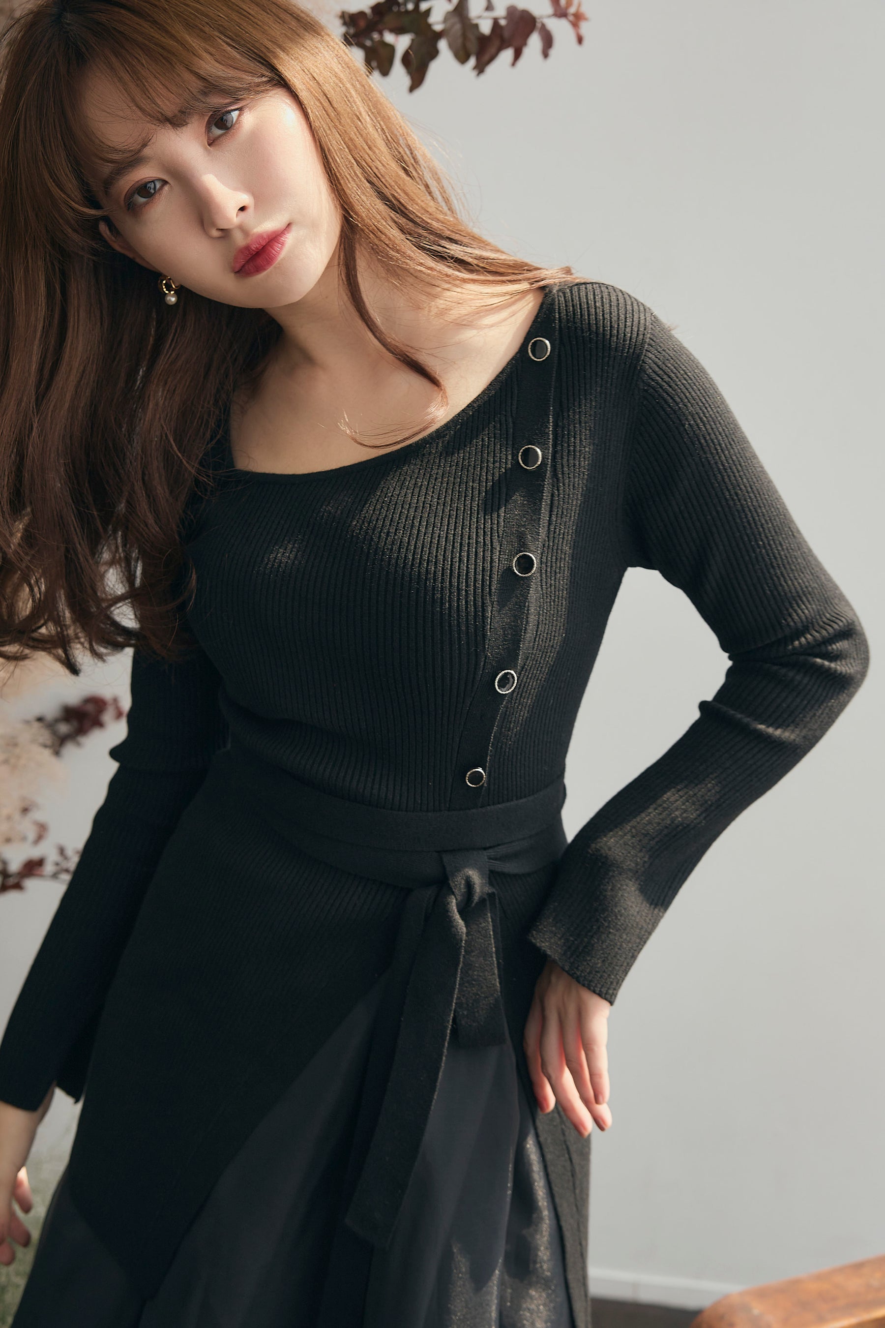 ニットのボタンを起点に広がるスリットが、縦ラインと女性らしいシルエットをエレガントに魅せてくれます。