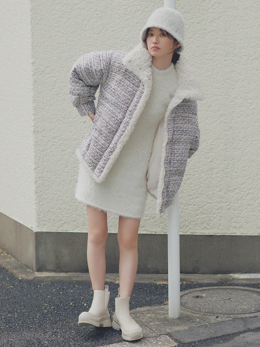 煌びやかなツイードとボアの小技を効かせた異素材MIXが、スペシャル感のあるおしゃれを叶えます。ピュアなかわいさを放つホワイト、ラメ糸の輝きが引き立つブラック、ほんのりピンクがかったミックスの3色をご用意しました。