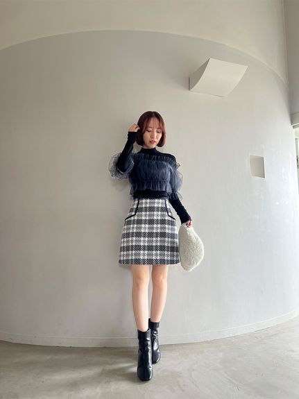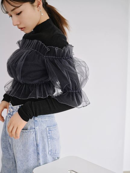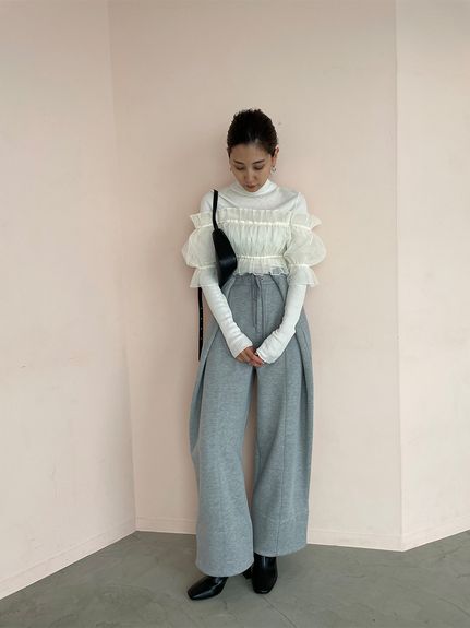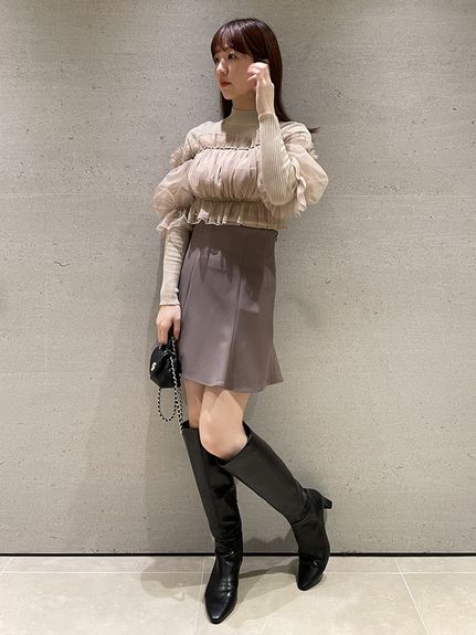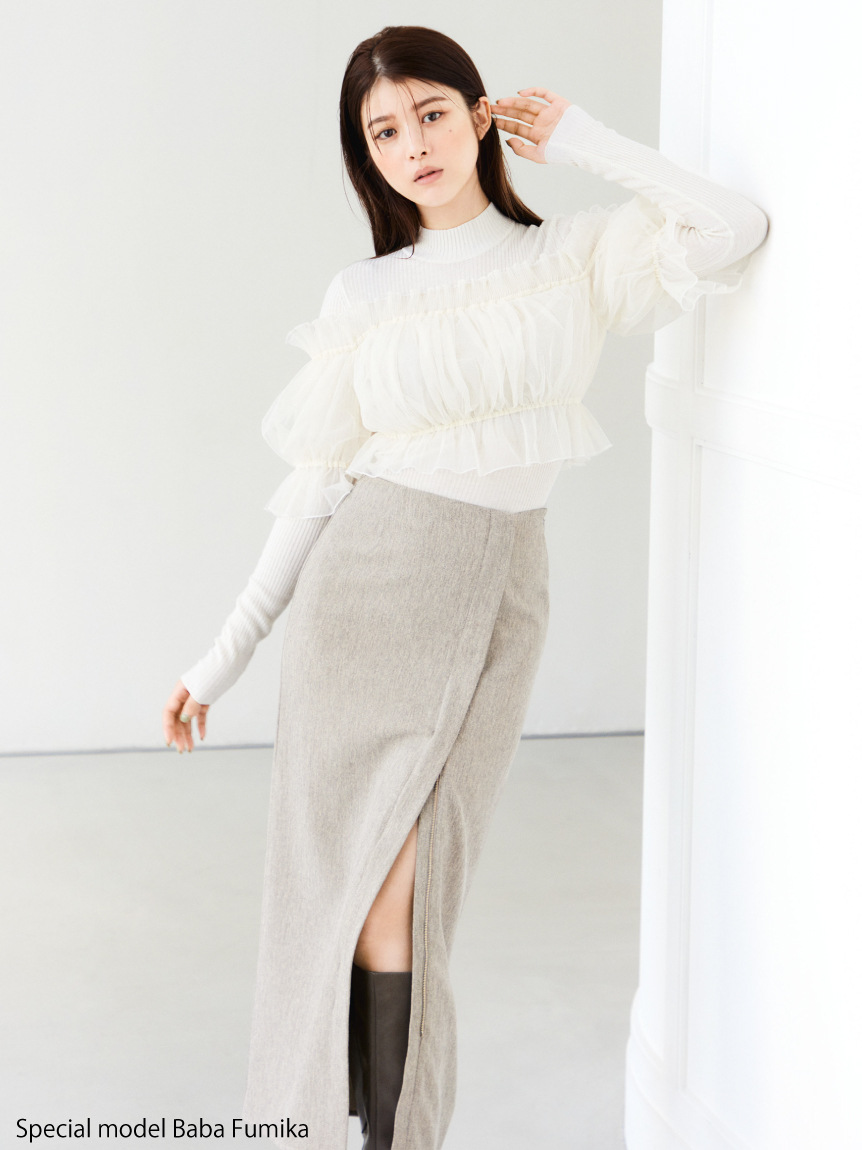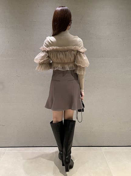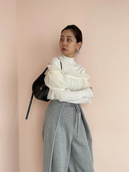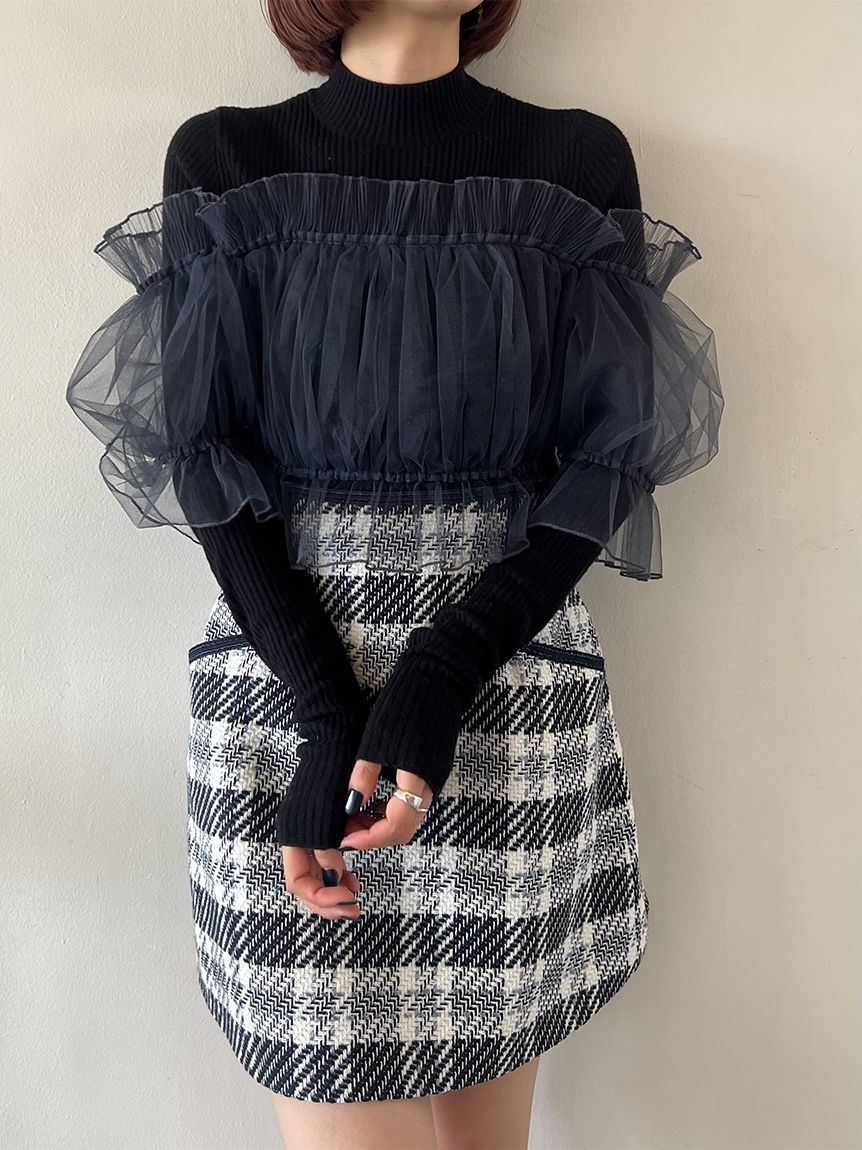 SNIDELで人気のチュールトップスをニットにドッキングしました。ベアデザインのチュールは、ギャザーやプリーツ、フリルなどで華やかに盛り上げてボリュームたっぷりに。その存在感を引き立てるのは、ほんのりシアーなニットプルオーバー。上品なハイネックデザインにすることで、甘すぎず大人っぽく着られる一枚に仕上げました。チュールベアとニットが作るメリハリに、上半身華奢見え効果も期待できます。今シーズンなら、ショーパン&ロングブーツとのスタイリングが特におすすめです。