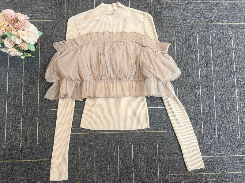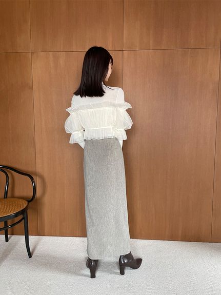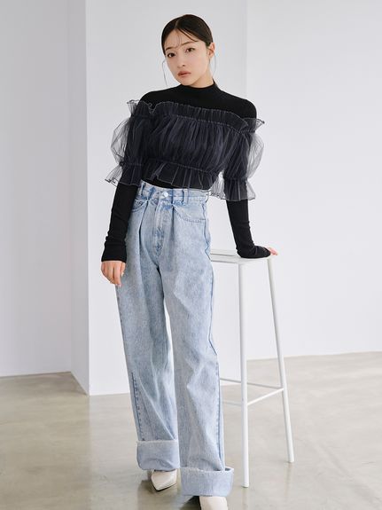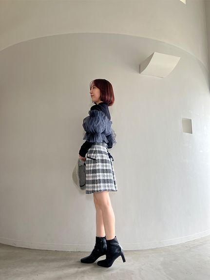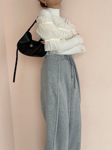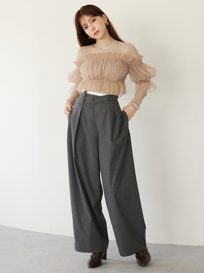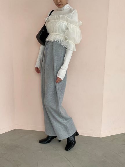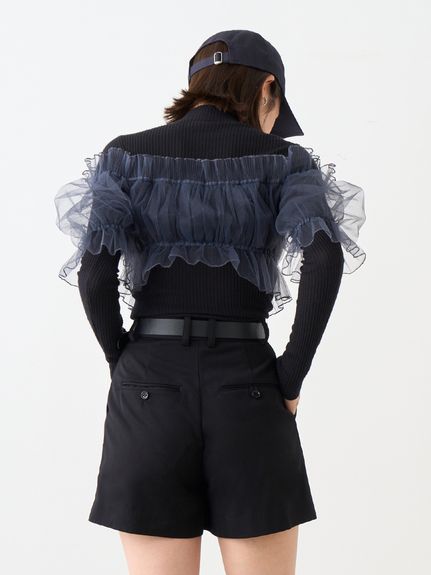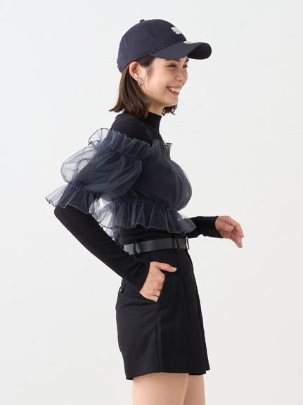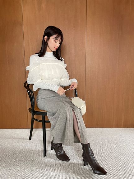 SNIDELで人気のチュールトップスをニットにドッキングしました。ベアデザインのチュールは、ギャザーやプリーツ、フリルなどで華やかに盛り上げてボリュームたっぷりに。その存在感を引き立てるのは、ほんのりシアーなニットプルオーバー。上品なハイネックデザインにすることで、甘すぎず大人っぽく着られる一枚に仕上げました。チュールベアとニットが作るメリハリに、上半身華奢見え効果も期待できます。今シーズンなら、ショーパン&ロングブーツとのスタイリングが特におすすめです。