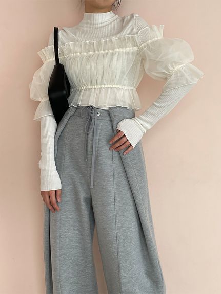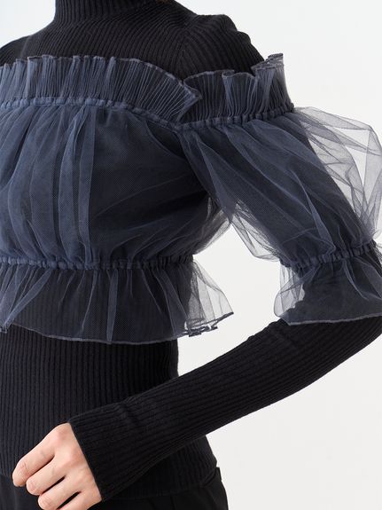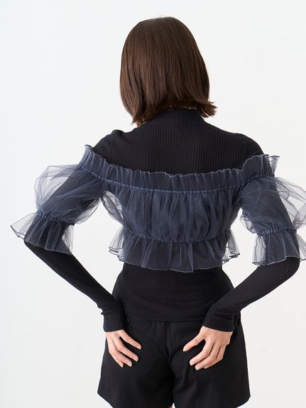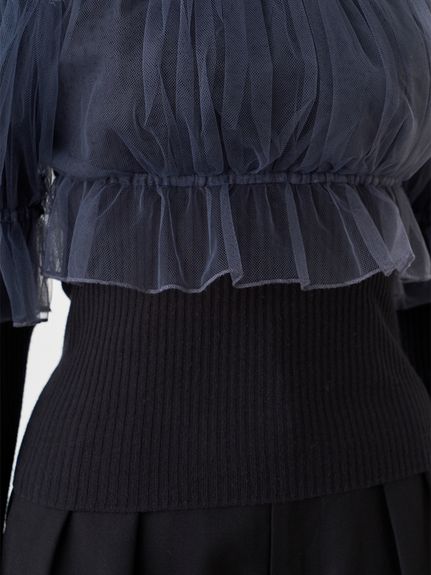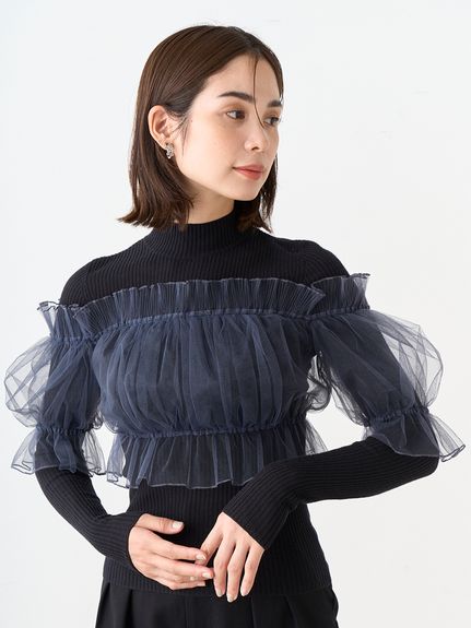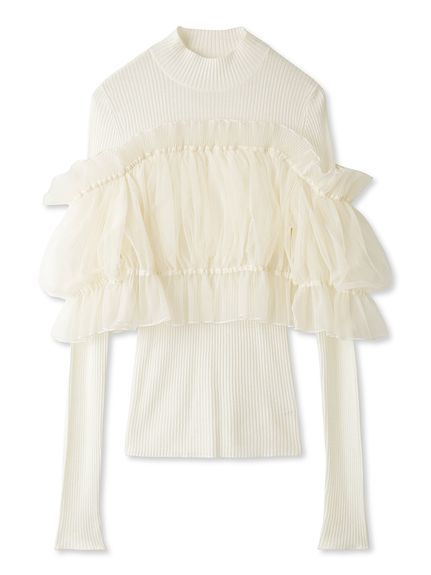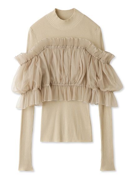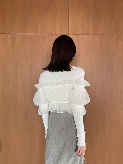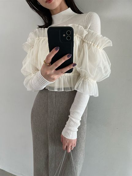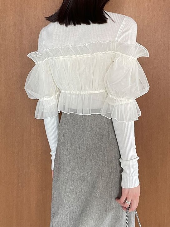 優美な透け感を楽しめるチュールを、しなやかで着心地のいいリブニットプルオーバーにドッキングしました。ピュアなかわいさのアイボリー、配色で差をつけたダークグレー、センシュアルなベージュの3色がラインナップ。