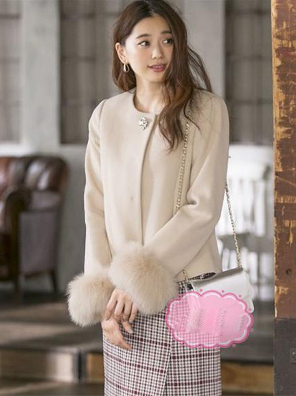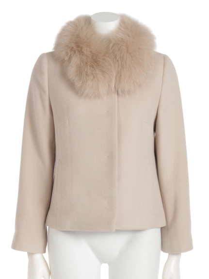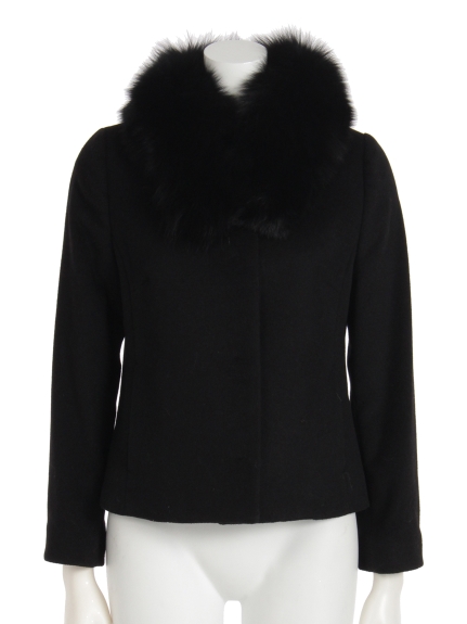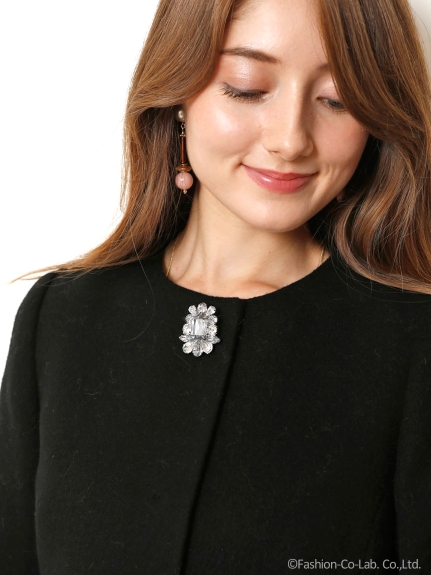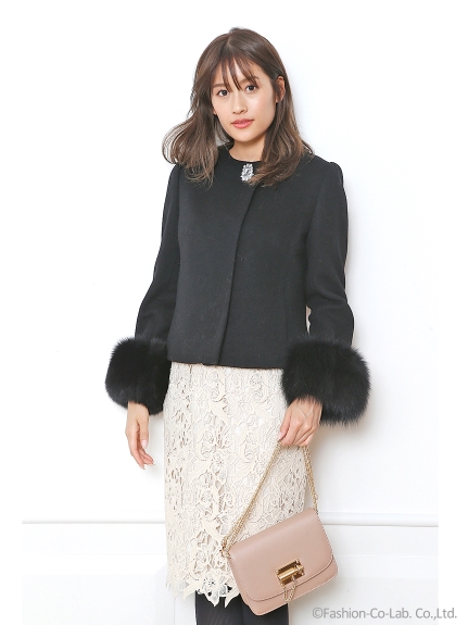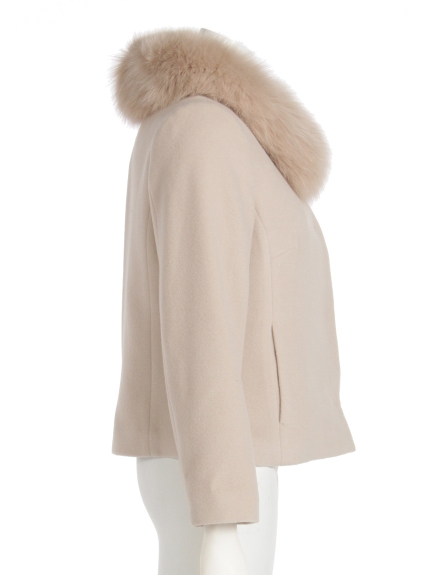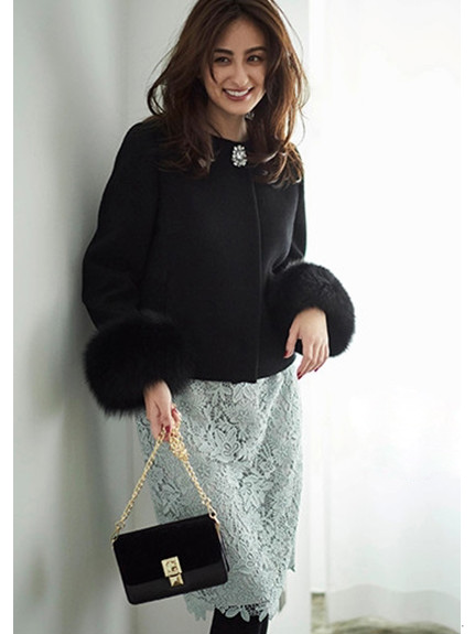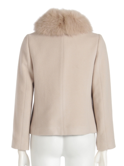 ラグジュアリーなビジューボタンで、エレガントに装えるショートコート。手元を華やかに飾る、ボリューミなファーモチーフもポイントです。装着箇所を首元に変えて、ルックスをアレンジできる2WAY仕様。