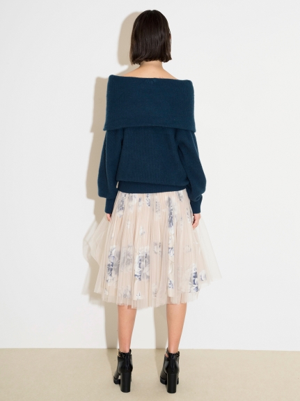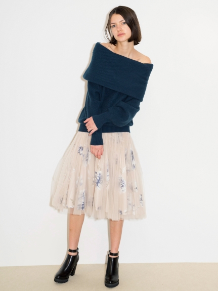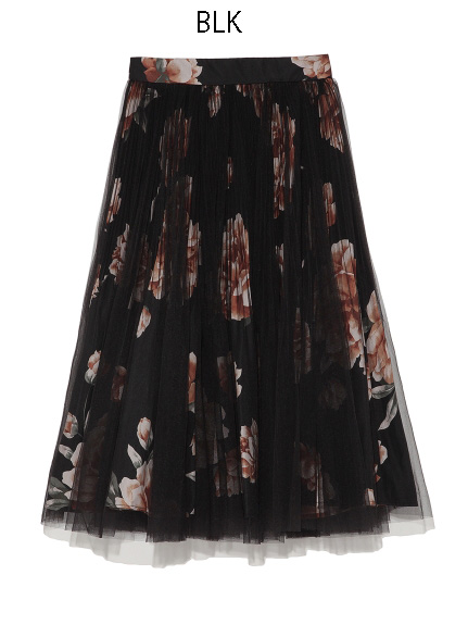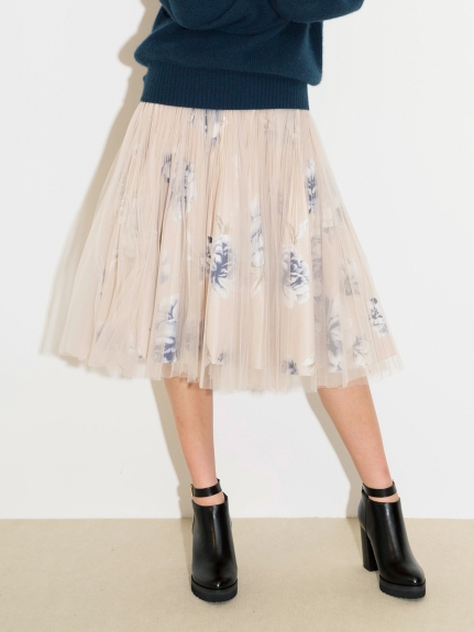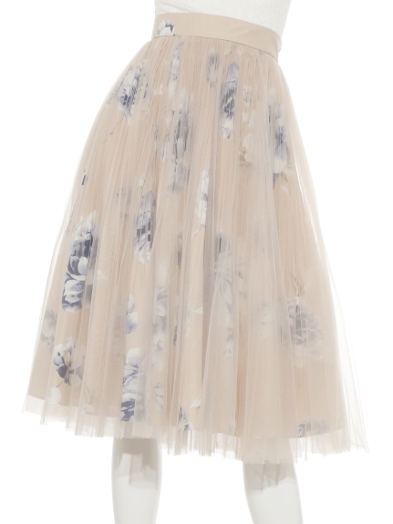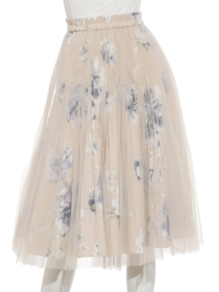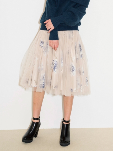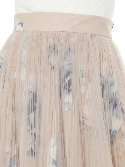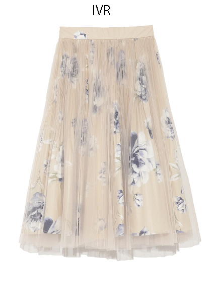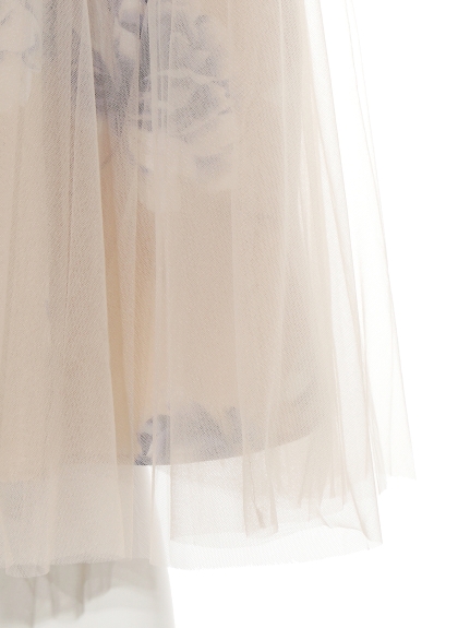 繊細なフラワープリントの素材に、上品なチュールを重ねた贅沢な仕上がり。