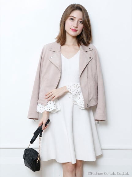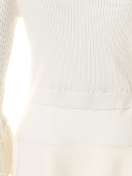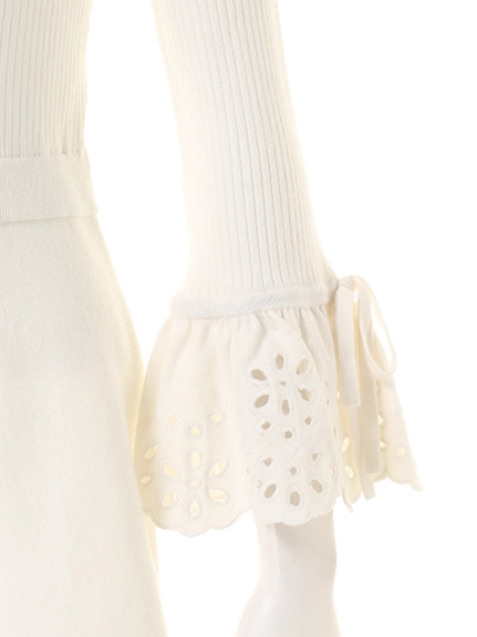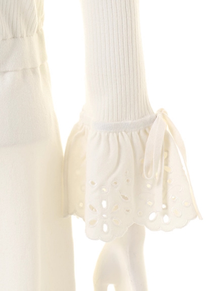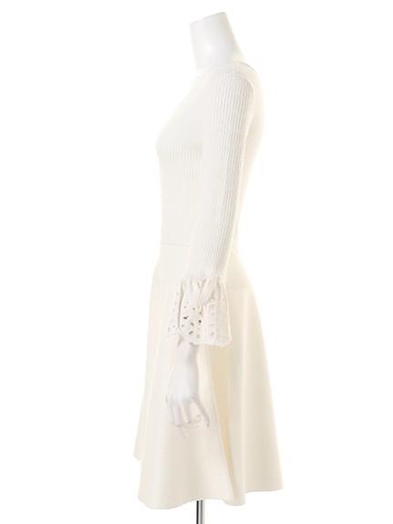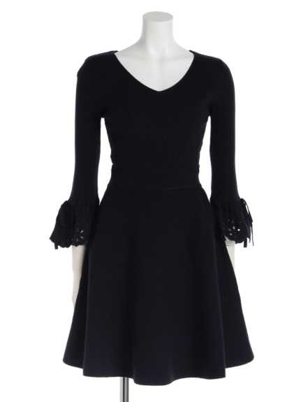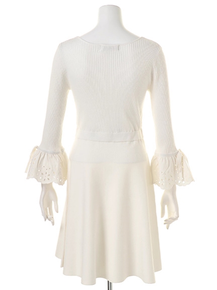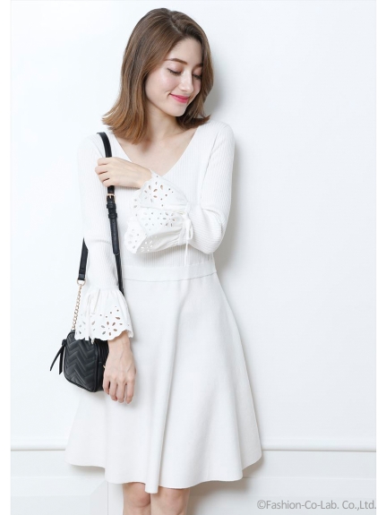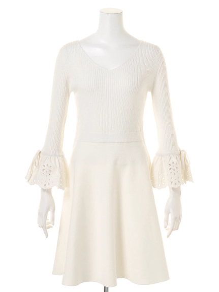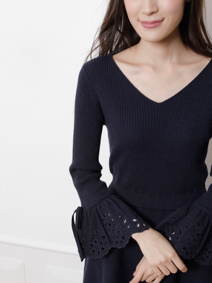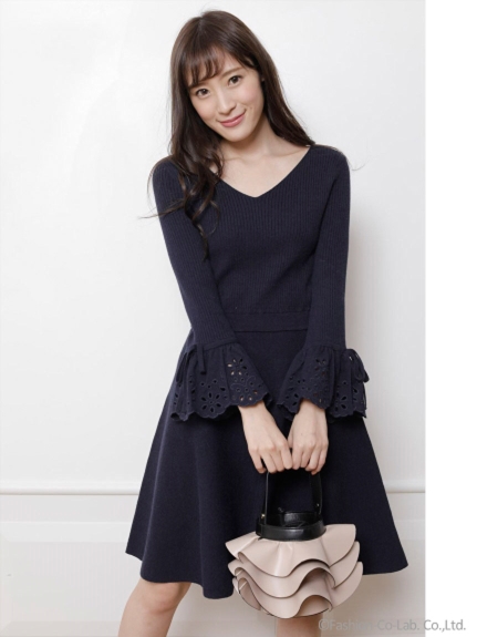 カットワーク刺繍入りのフレア袖に大人かわいいムードが漂うニットワンピース♪上身頃をリブ編みでコンパクトにデザインしており、スッキリとした印象に。ぐっと広く開いたVネックは、アクセサリーなどの小物も良く映えます。 素材 本体:アクリル40%、綿32%、ナイロン28%/刺繍糸:ポリエステル100% サイズ表記 総丈 肩幅 袖丈 袖ぐり バスト ウエスト ヒップ F 87.5cm 34.5cm 47cm 36cm 70cm 64cm 107cm
