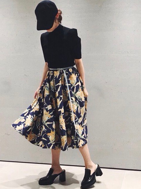 一枚でコーディネート感が楽しめるワンピース。短めニット×ミモレ丈のスカートの組み合わせは、スタイルアップ効果も絶大。トップスの色をベースにしたプリント生地を使用しているので、まとまりがあり大人らしい雰囲気で着こなすことができます。ニットの袖ラインは、タックを効かせてモードな立体感を演出。これ一枚で、デートにもオフィスにもOK。