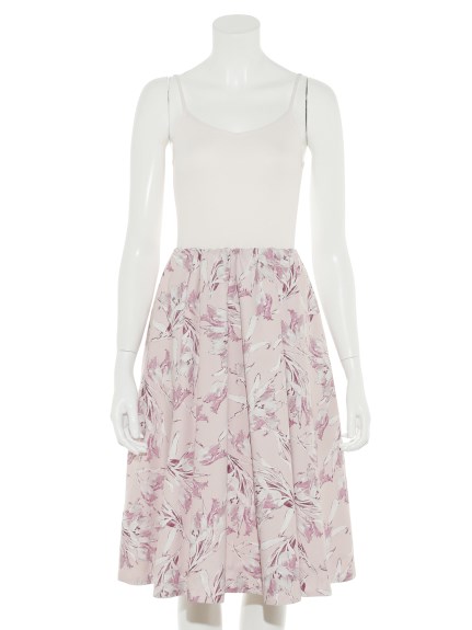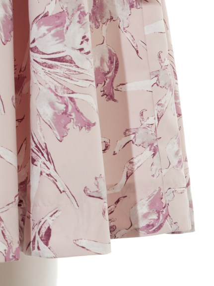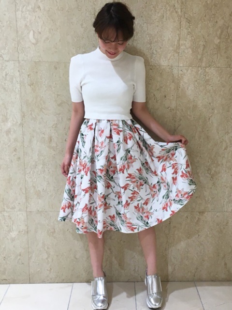 トップスはシャリ感のある糸を編み上げたニット。さりげない柄編みがよりさわやかな印象です。スカート部分は、ハリと光沢の美しいバックサテン。ドラマティックに映える、オリジナルのチューリッププリントをあしらいました。