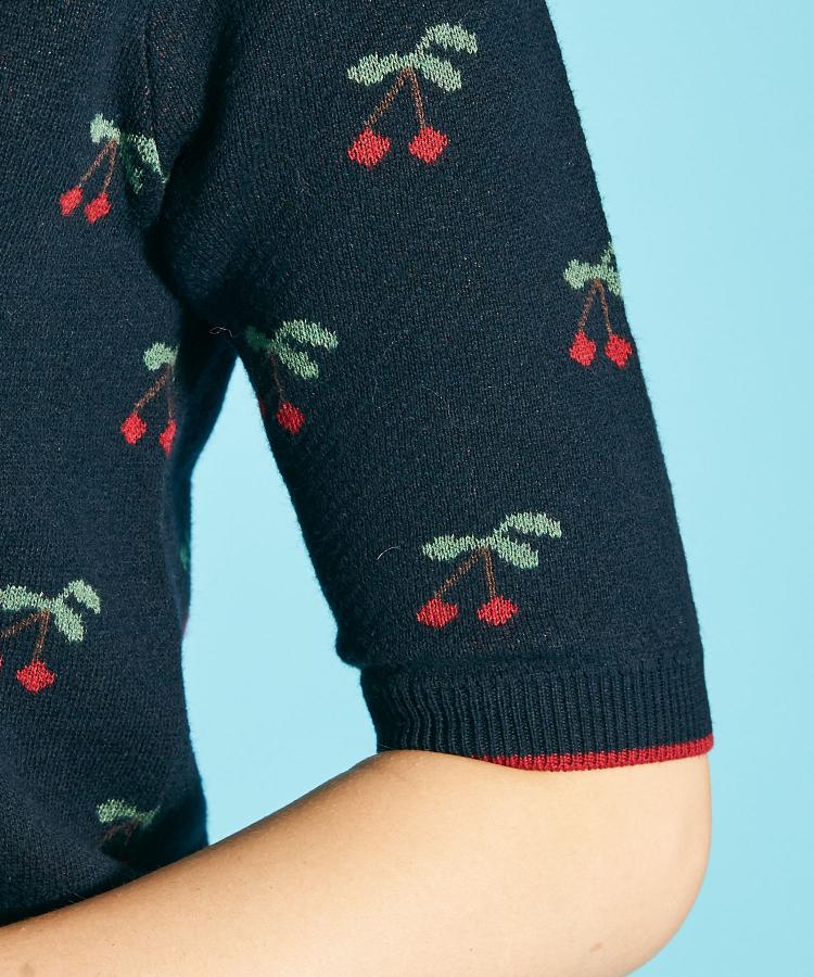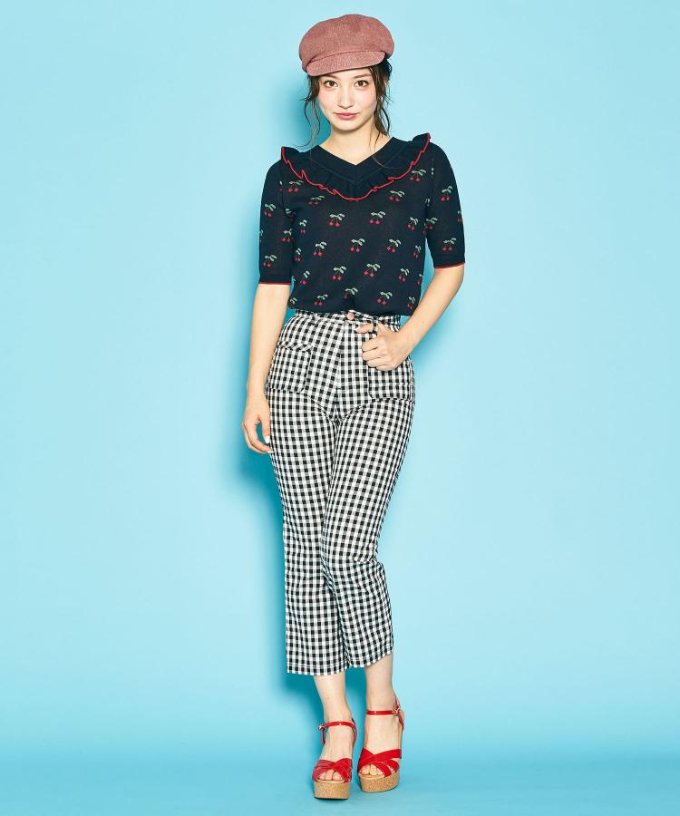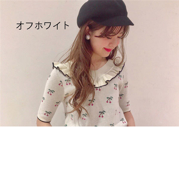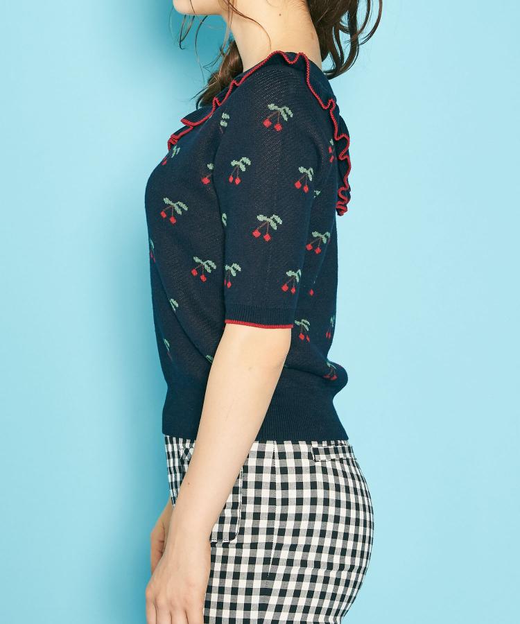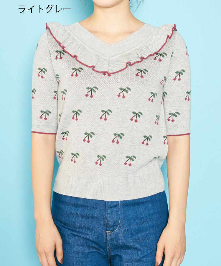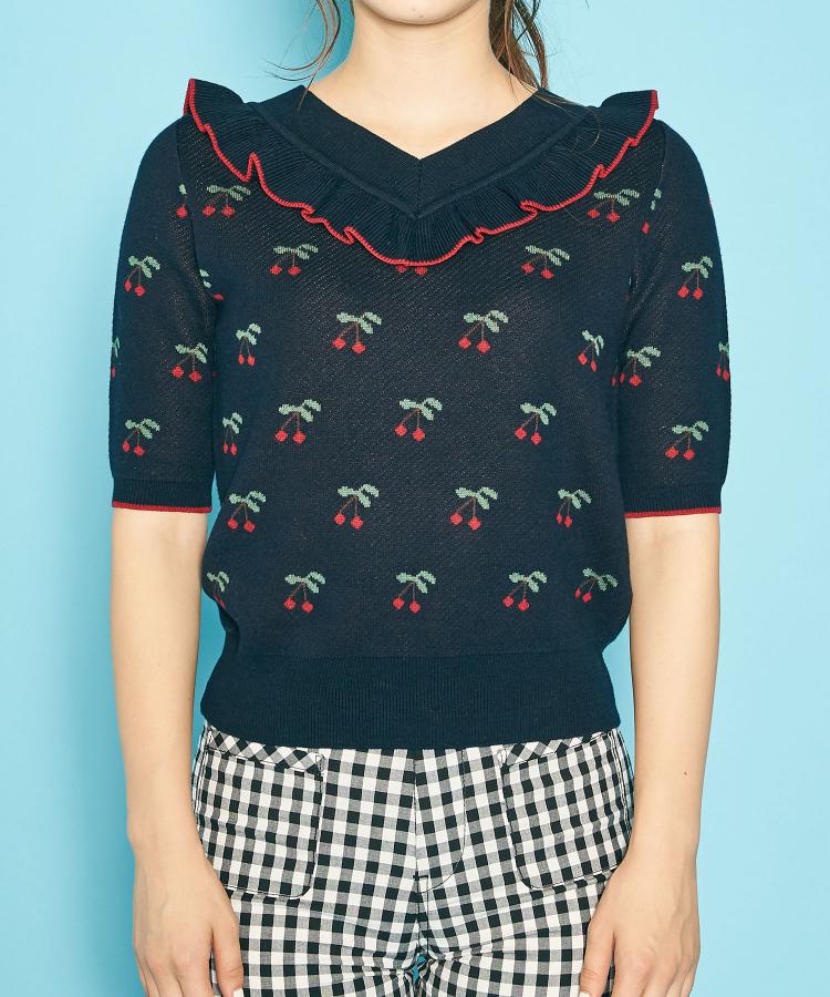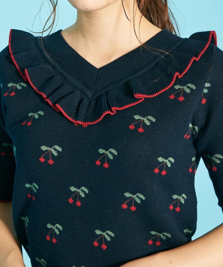 キュートなチェリー柄を散りばめたニットプルオーバー。ネックにはフリルをあしらって甘さを引き上げています。コンパクトなシルエットですっきりと着こなせ、さまざまなボトムスとのコーディネートを楽しめるのも魅力です。 サイズ 着丈 肩幅 袖丈 バスト(1周) F 50 33 28 84 素材 レーヨン60% 綿40%